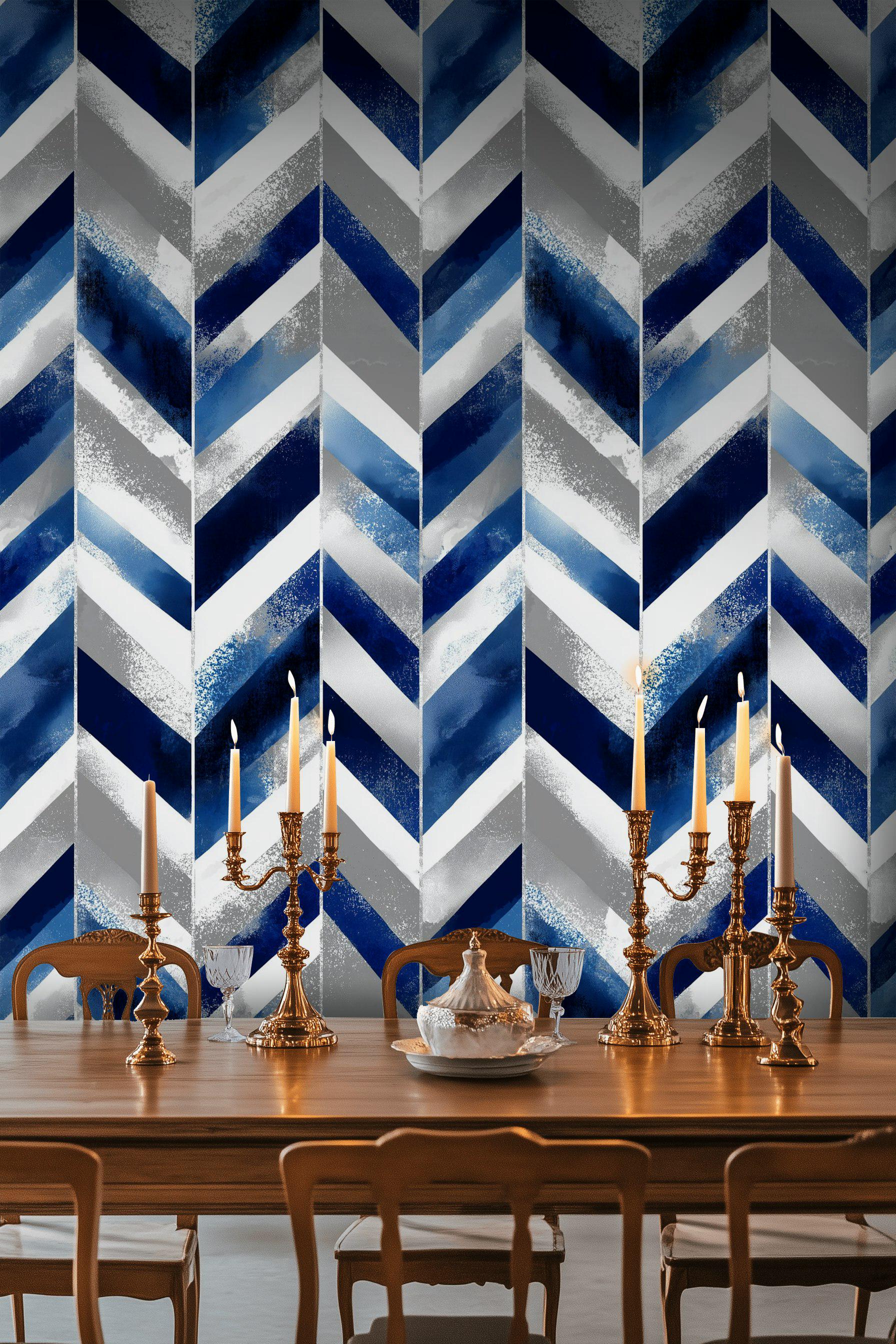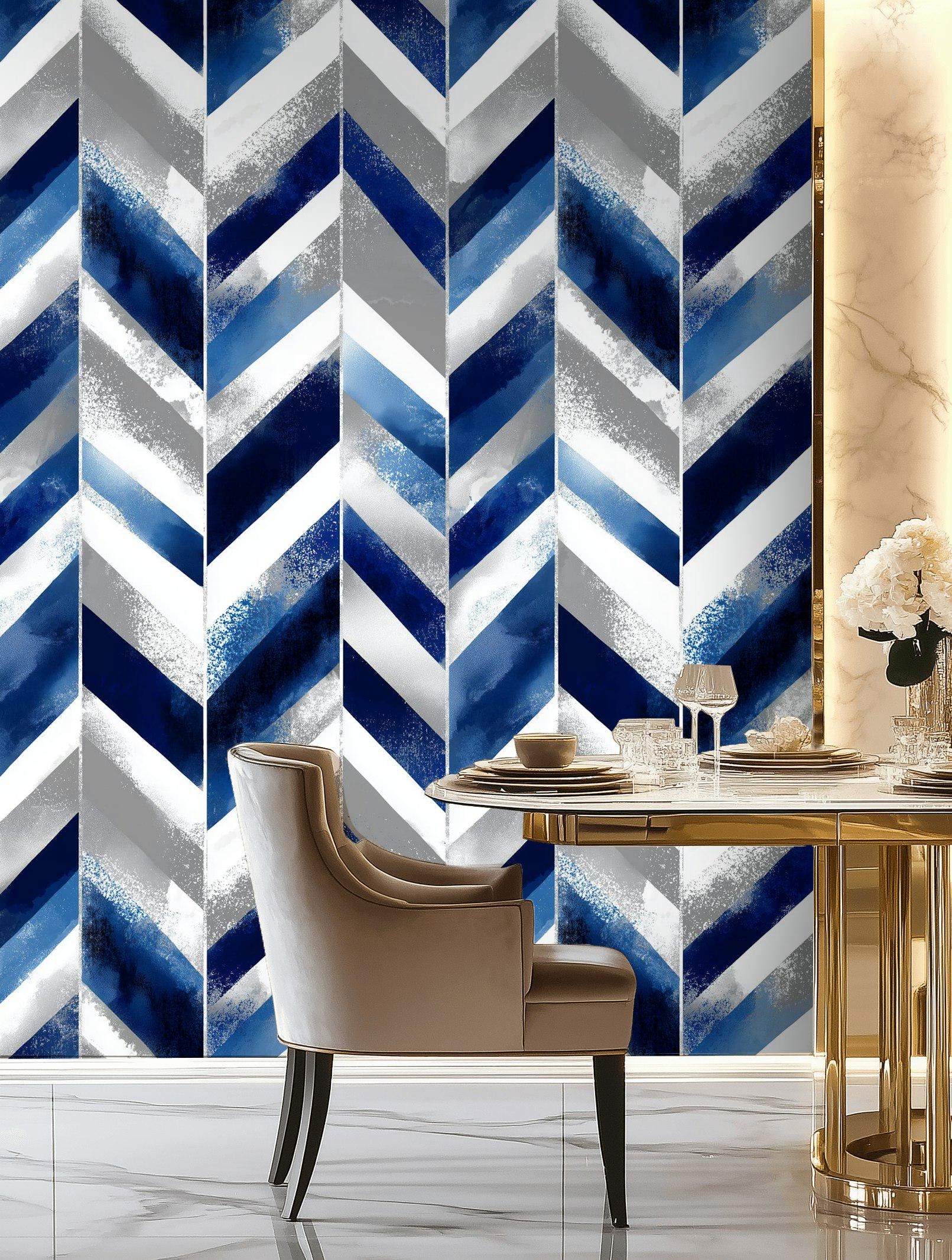 This versatile indigo chevron wallpaper is perfect for creating a bold feature wall in your living room, home office, bedroom, or a chic entryway. Its sophisticated color scheme and energetic pattern seamlessly blend with modern, contemporary, industrial, minimalist, and urban interior styles, offering a vibrant and stylish upgrade that transforms any space with a touch of modern elegance.