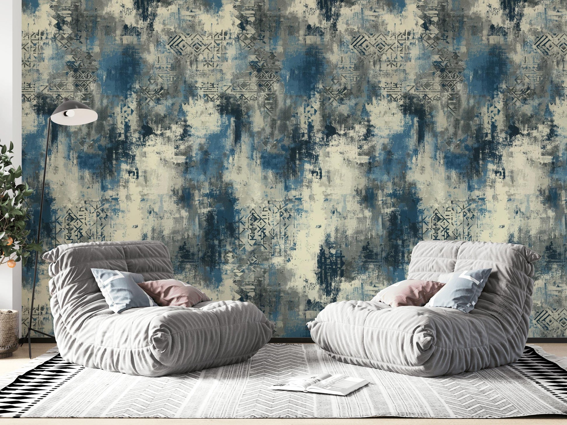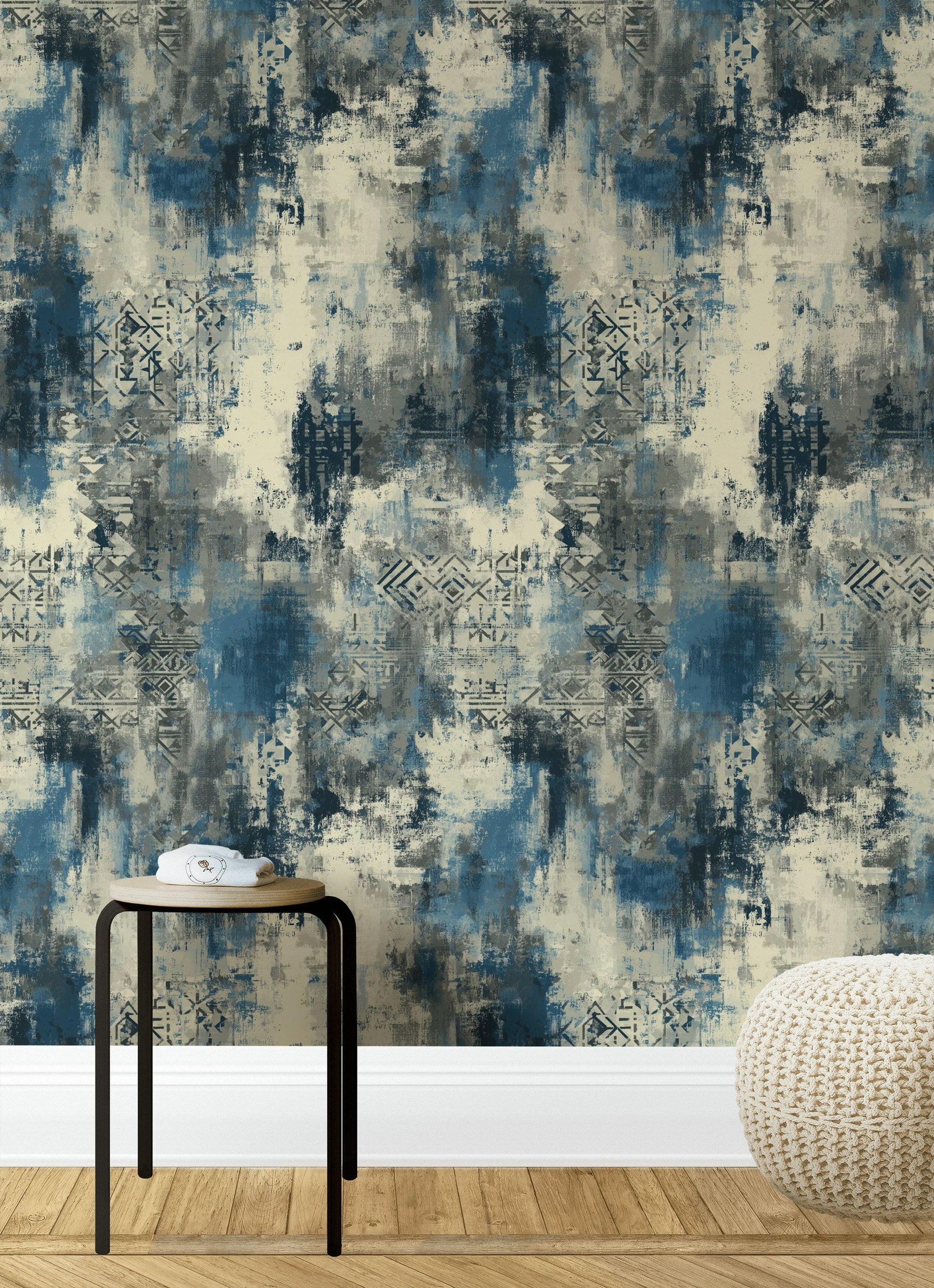 Inject a dose of contemporary edge into your interior with our captivating Abstract Blue Grey Wallpaper. This striking wall mural features a dynamic, distressed texture in a sophisticated palette of deep blues, cool grays, and soft creams. Hints of geometric or tribal-inspired patterns emerge from the painterly brushstrokes, adding depth and intrigue to its modern urban aesthetic. This design embodies a rugged yet artistic charm, perfect for creating a bold statement in any contemporary space.