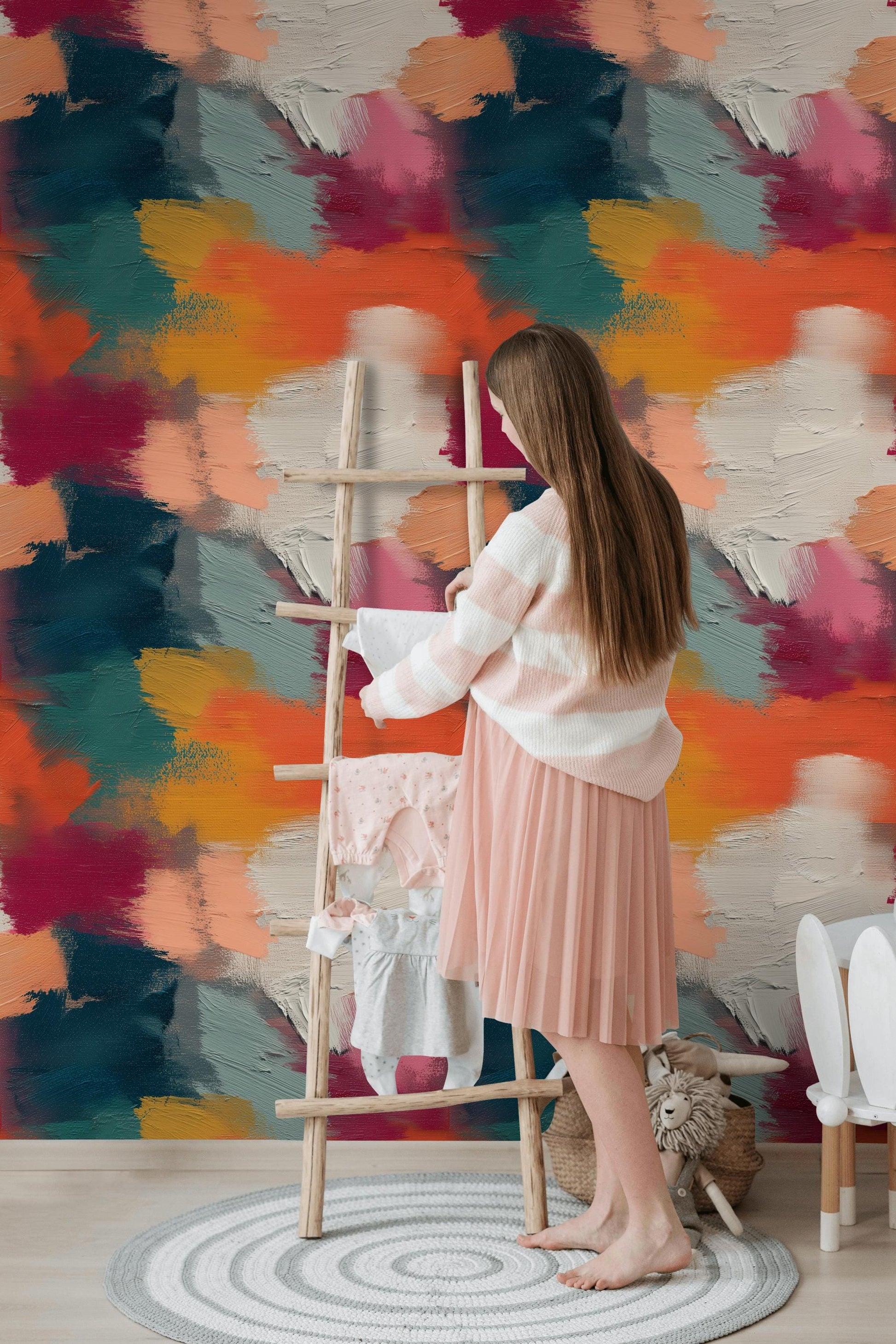 Each stroke is rendered with visible texture and depth, giving the design a unique, hand-painted feel that resembles a gallery-worthy abstract painting. The spontaneous yet harmonious application of color ensures that this wallpaper is not just a backdrop, but a true statement piece for your walls. Its bold design and diverse color scheme make it an excellent choice for adding a pop of personality and artistic flair to your interiors.