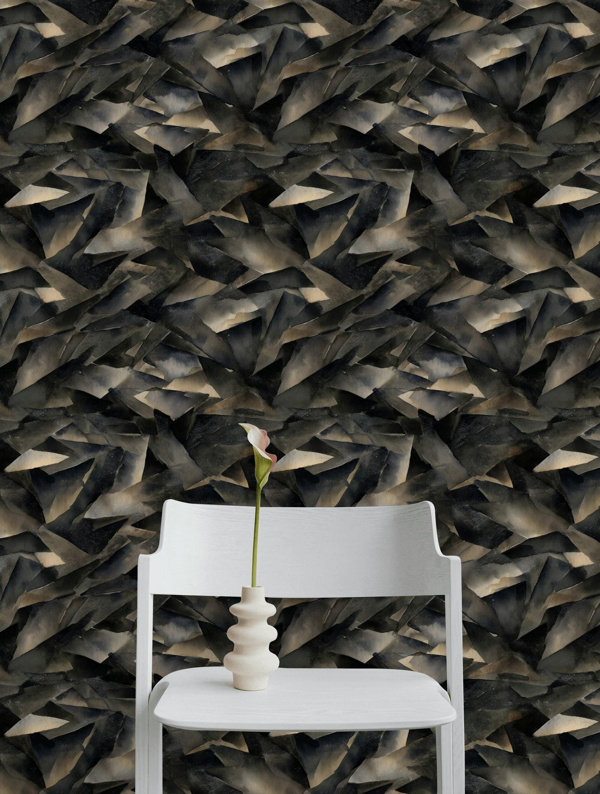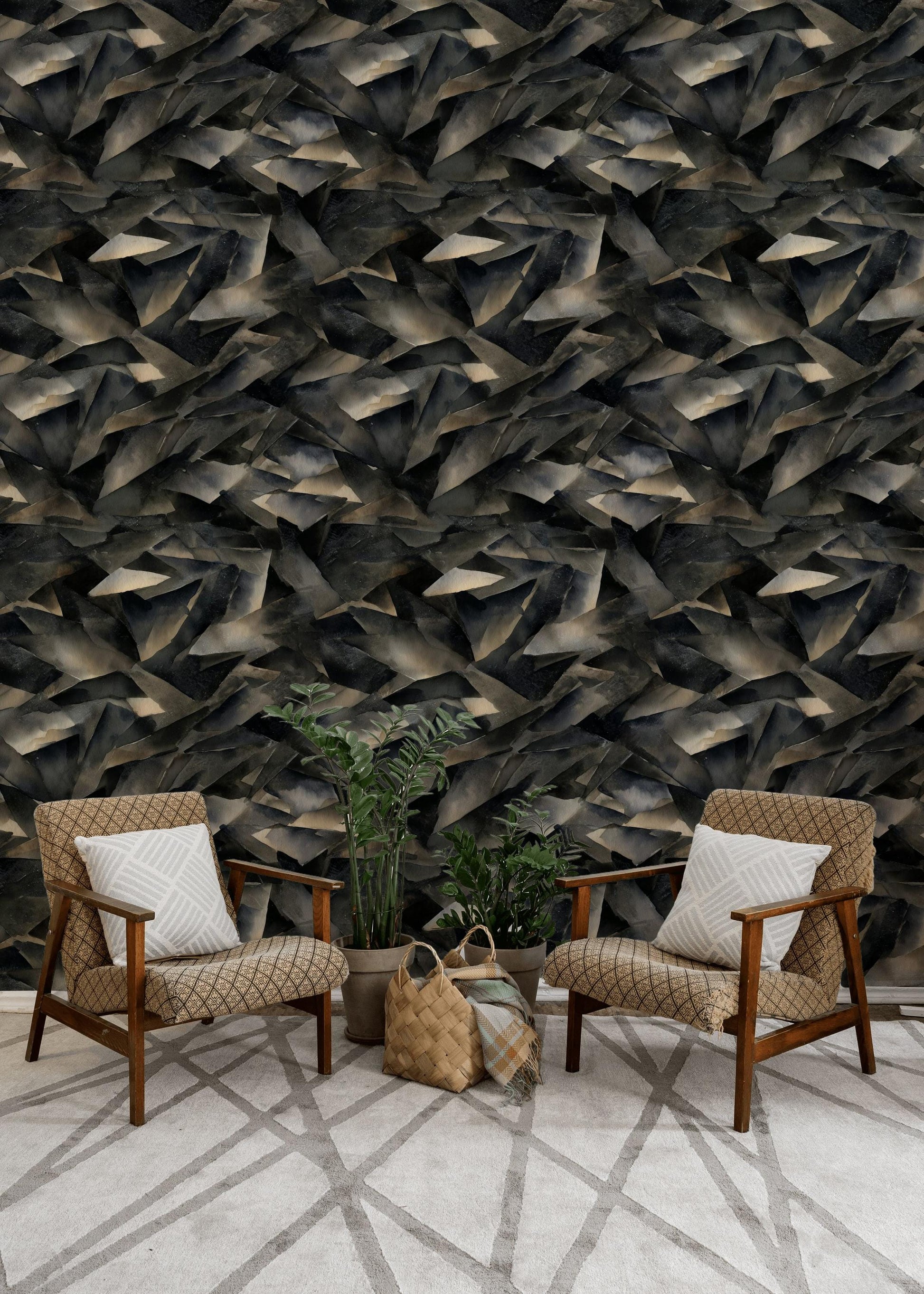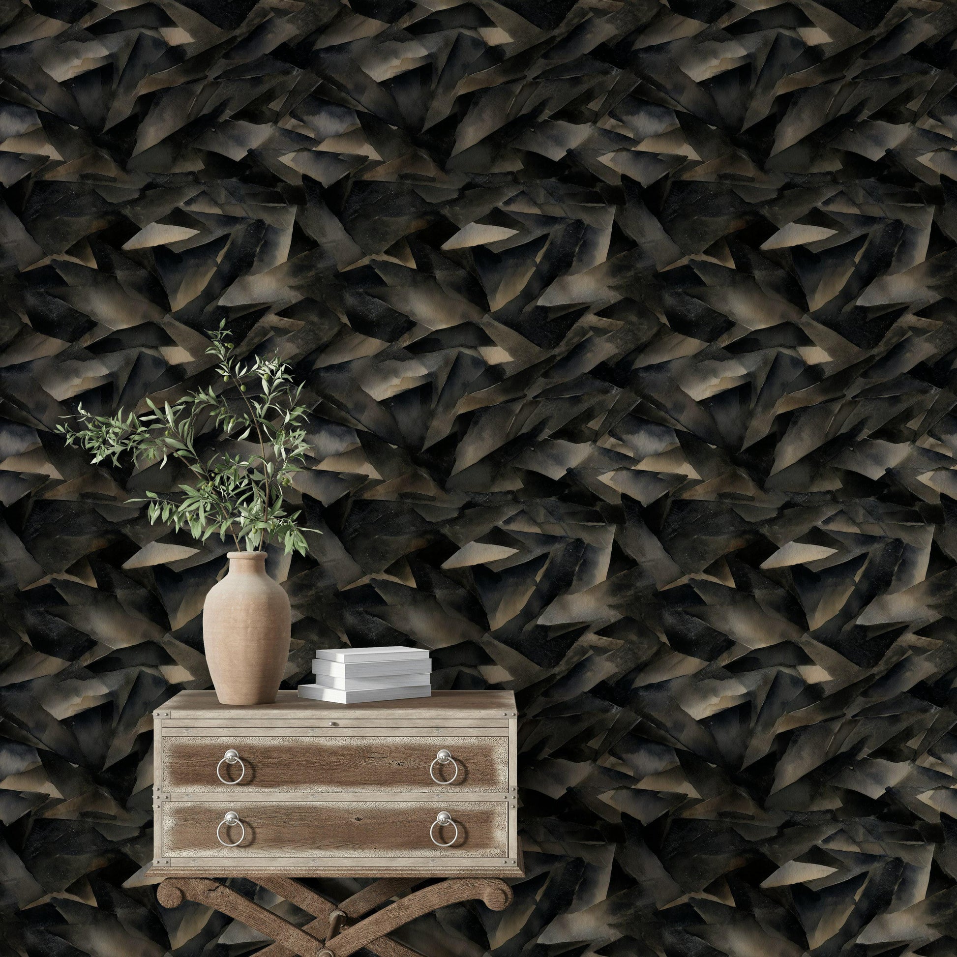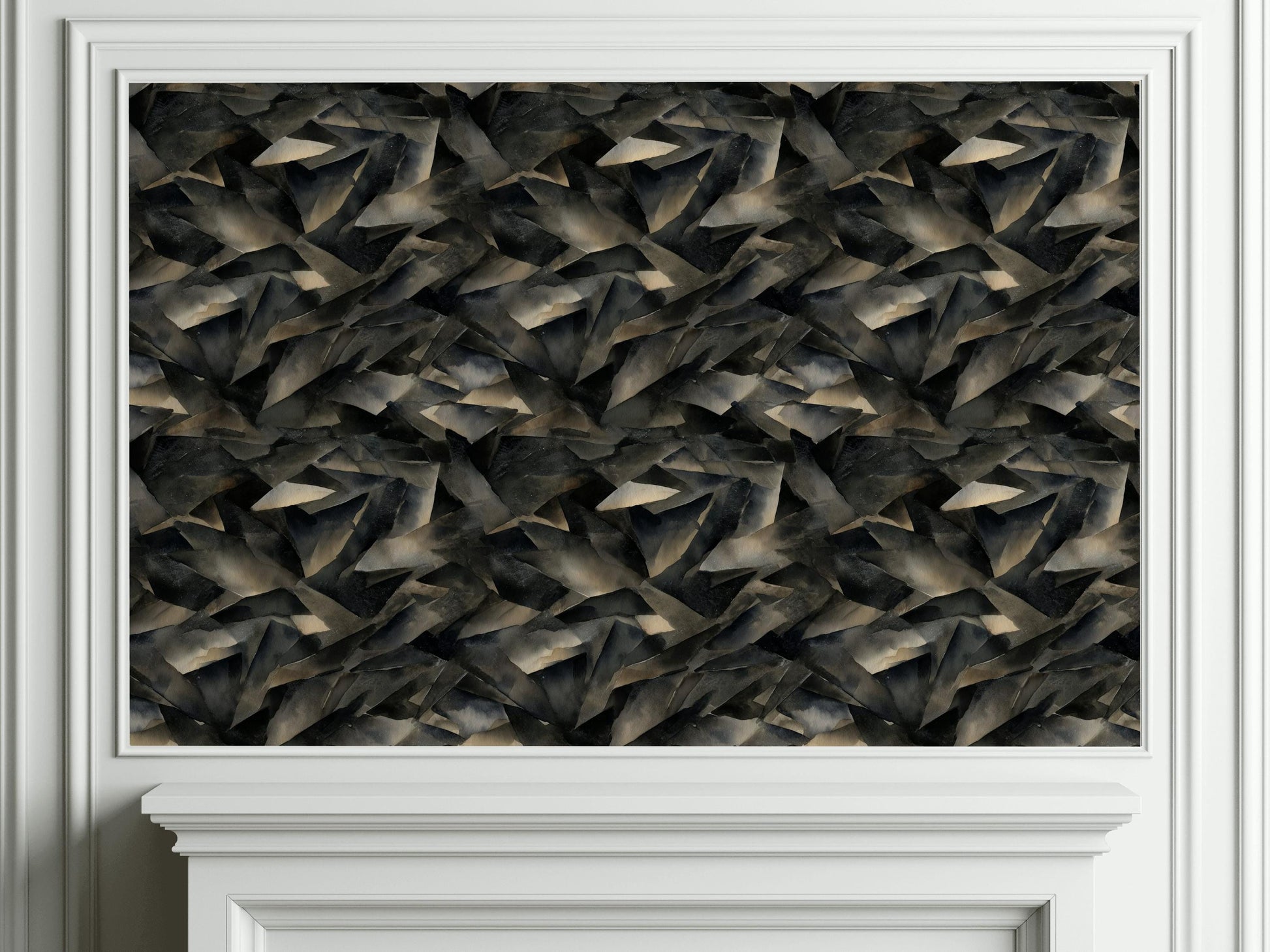 Command attention with this powerfully geometric Abstract Broken Glass Wallpaper. This avant-garde mural features a mesmerizing pattern of densely packed, overlapping fragments or 'shards'. The complex layering and rough, watercolor edges give the design a raw, crystalline, or geological texture. The sophisticated, moody palette of deep black, charcoal greys, and warm, dusty beige creates a dramatic and high-impact focal point for any room.