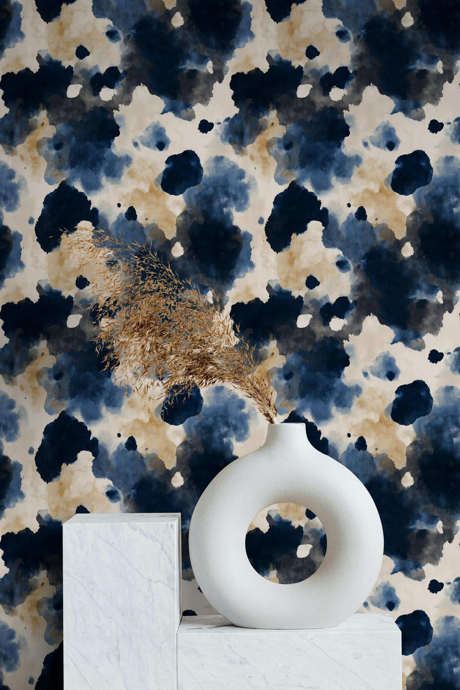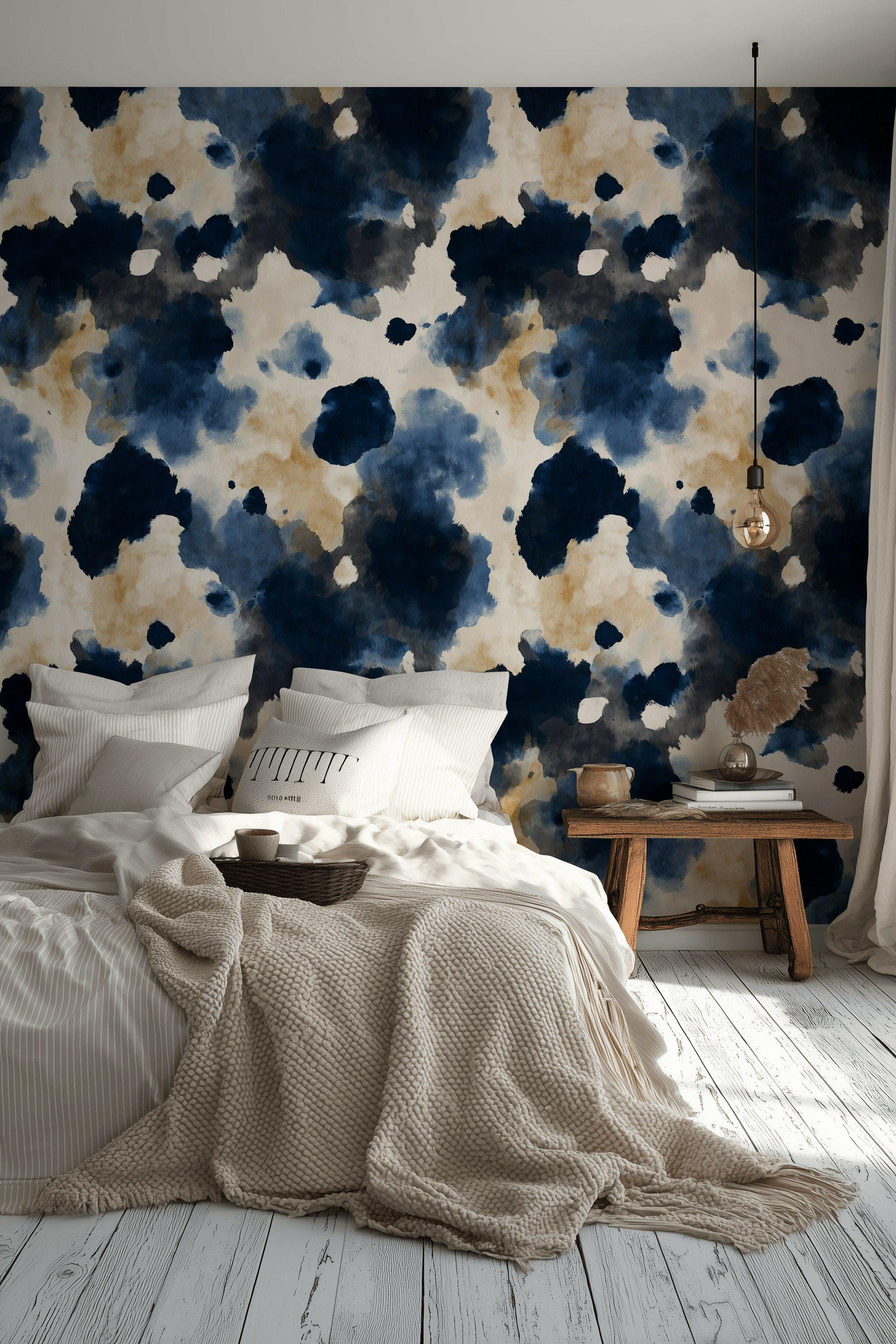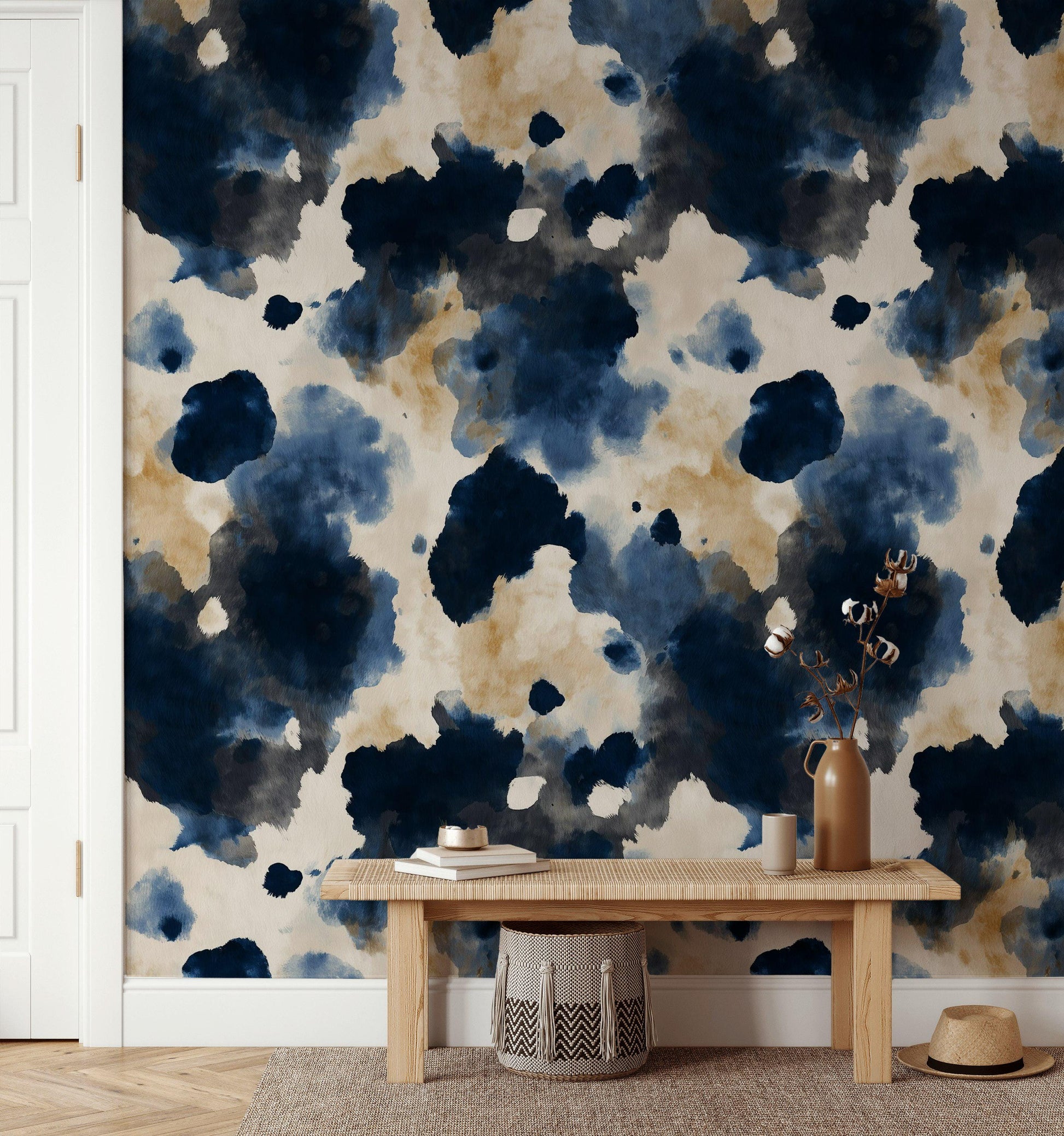 Discover the bold artistry of our Abstract Watercolor Cow Print Wallpaper. This stunning peel and stick wall mural offers a modern, artistic interpretation of classic cowhide in a rich palette of deep navy blue, warm beige, and soft cream. Perfect for creating a dramatic statement wall, adding a touch of modern farmhouse style, or transforming an office or nursery.