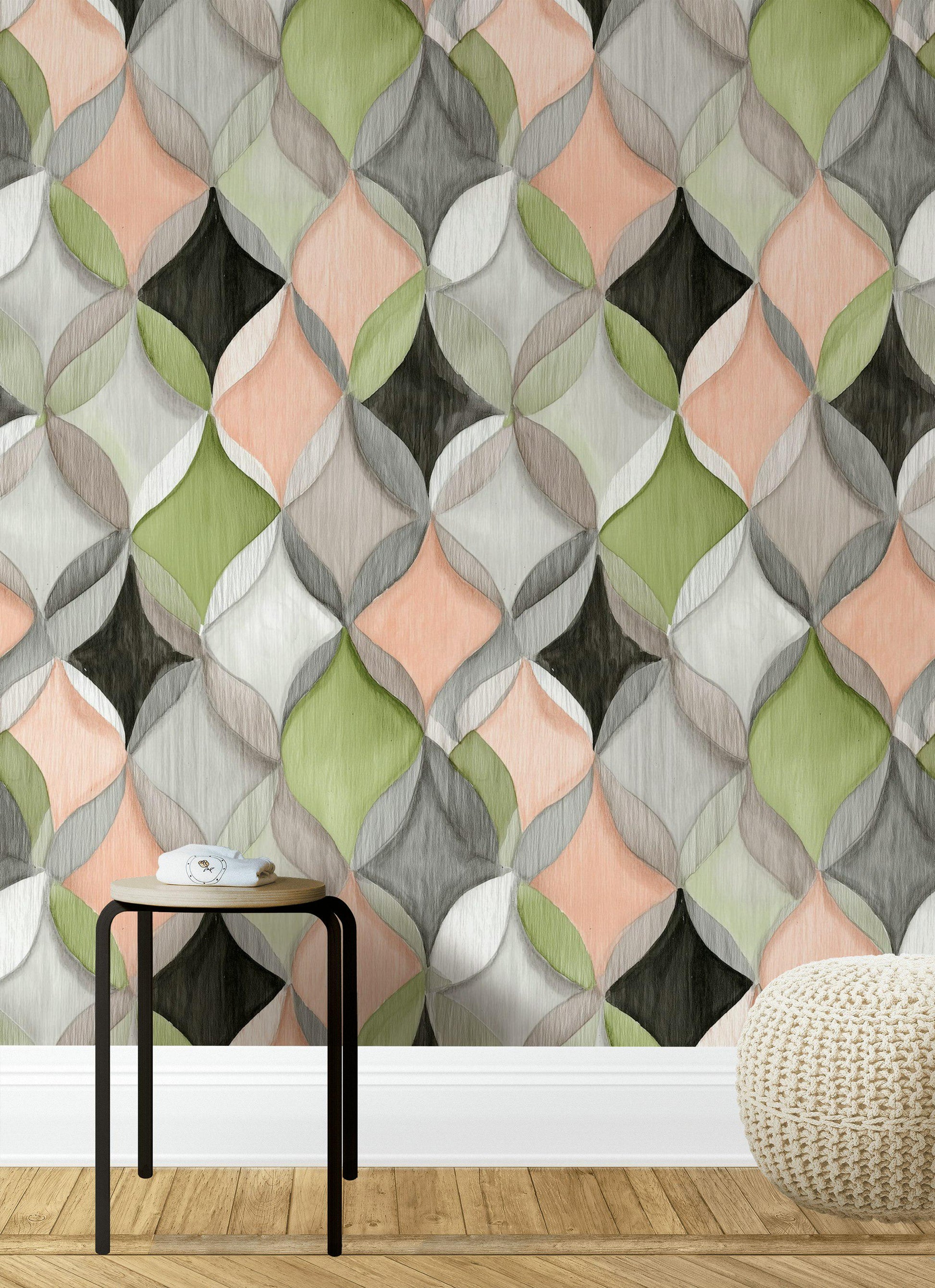 Abstract Geometric Ogee Wallpaper | Modern Interlocking Pattern Wall Mural | Pastel Peel and Stick Decor