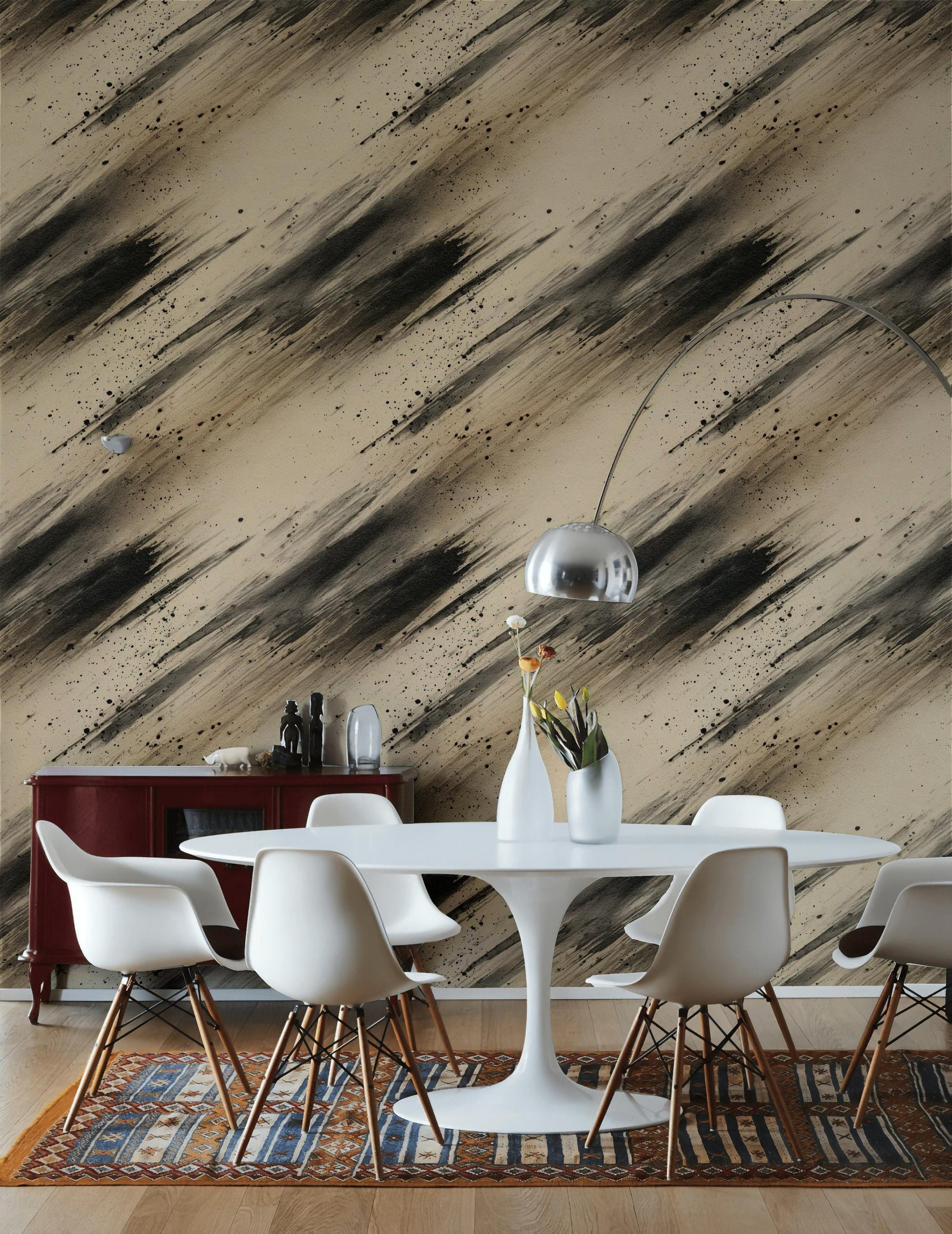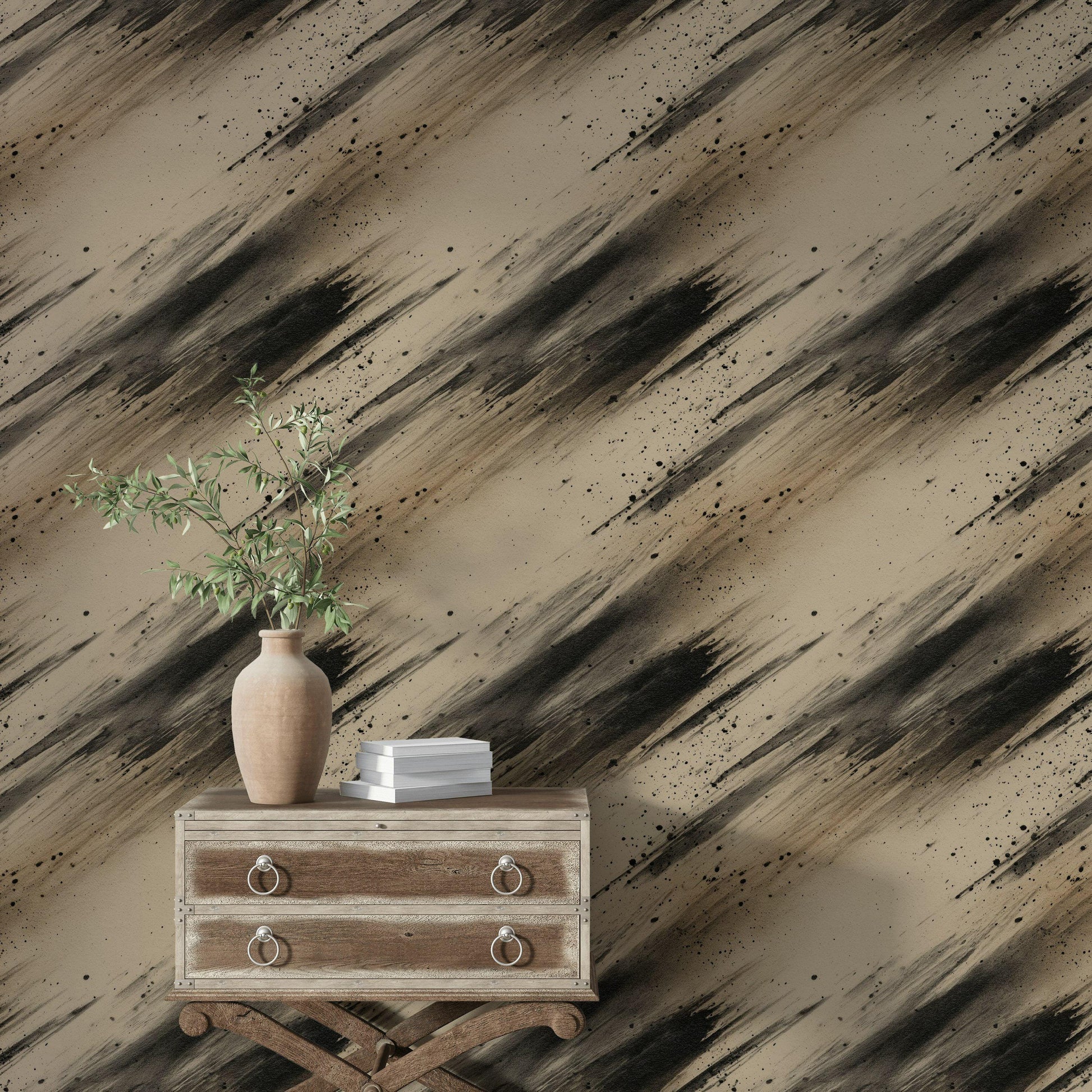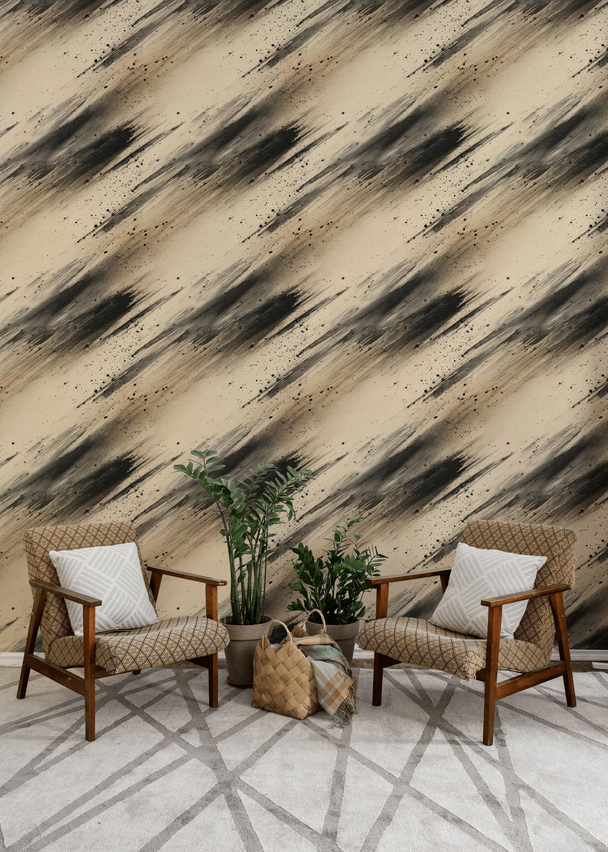 Abstract Ink Splatter Wallpaper: Black Beige Brushstrokes, Peel & Stick Mural