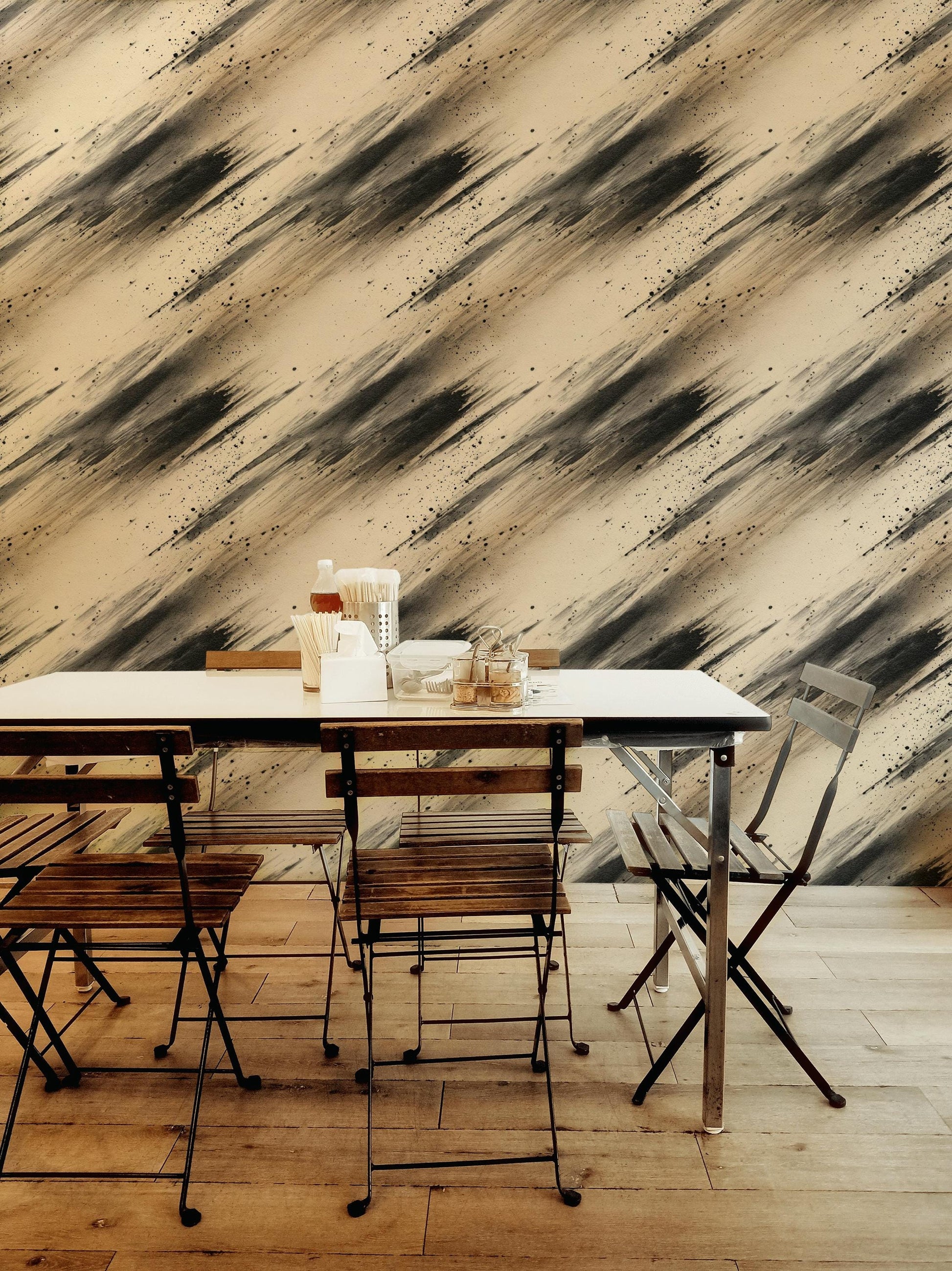 Introduce a sense of raw, dynamic movement to your space with this Abstract Diagonal Ink Splatter Wallpaper. This dramatic mural captures a high-energy pattern of broad, sweeping diagonal brushstrokes in deep black and charcoal, contrasted sharply by a warm, creamy beige background. The scattered ink splatters (speckles) add a raw, grunge, and unique artistic texture, making the design feel like an original piece of studio art.