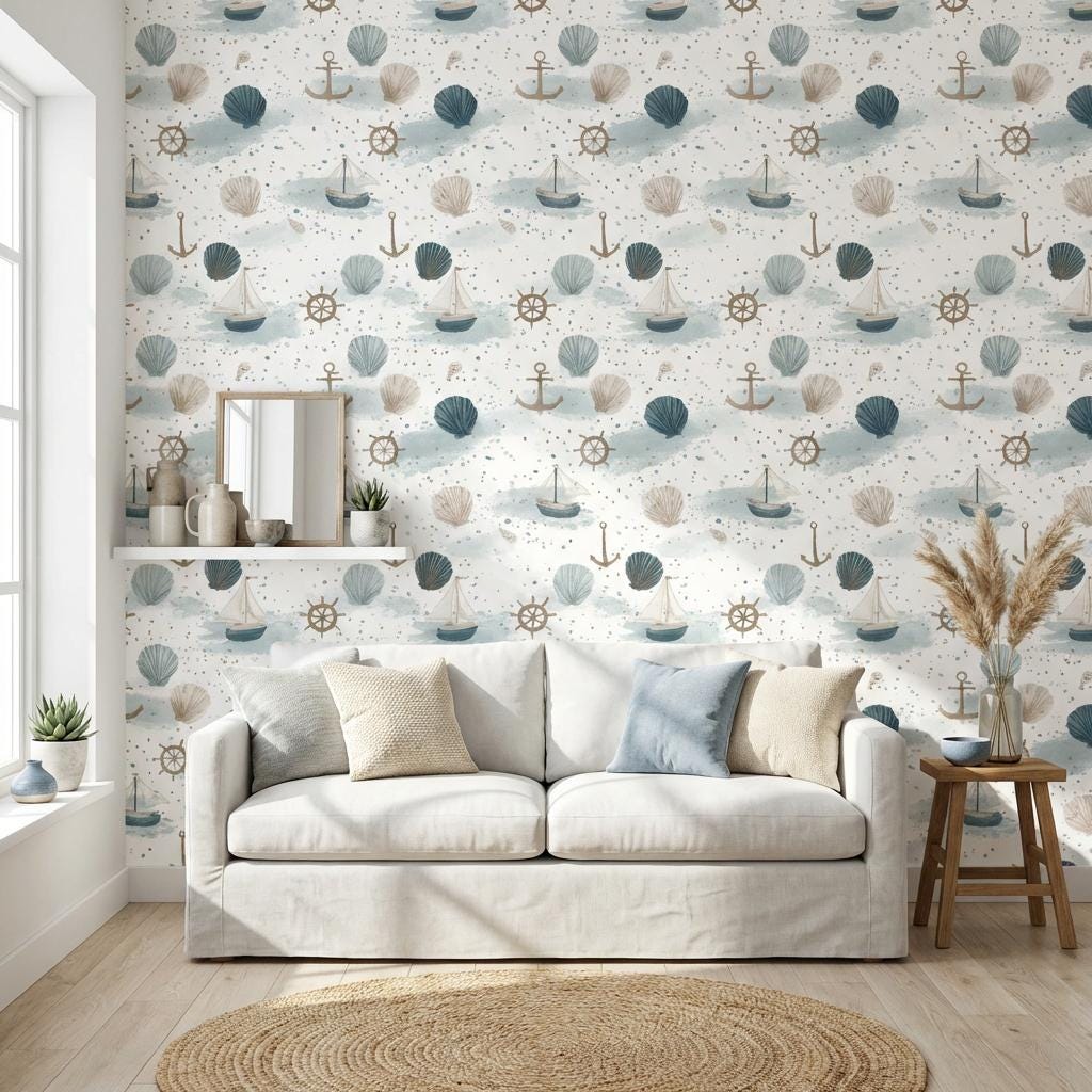 This wallpaper features nautical, ship, anchor elements in blue and brown tones. Perfect for modern interior decoration.
