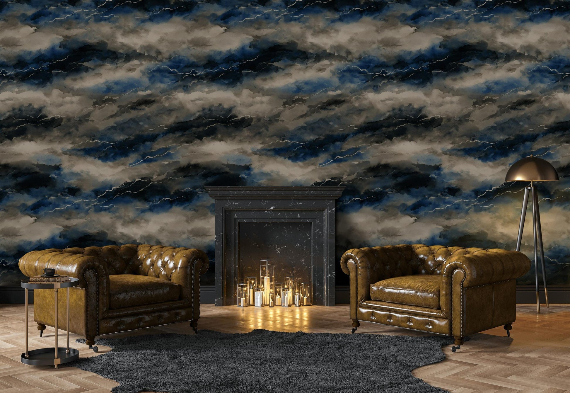 Bring the dramatic beauty of a tempestuous sky into your home with our captivating Abstract Stormy Sky Wallpaper. This striking wall mural features a dynamic watercolor pattern of deep blues, moody greys, and ethereal whites, accented by sharp, almost lightning-like lines. It evokes a powerful yet serene natural atmosphere, perfect for creating a bold statement.