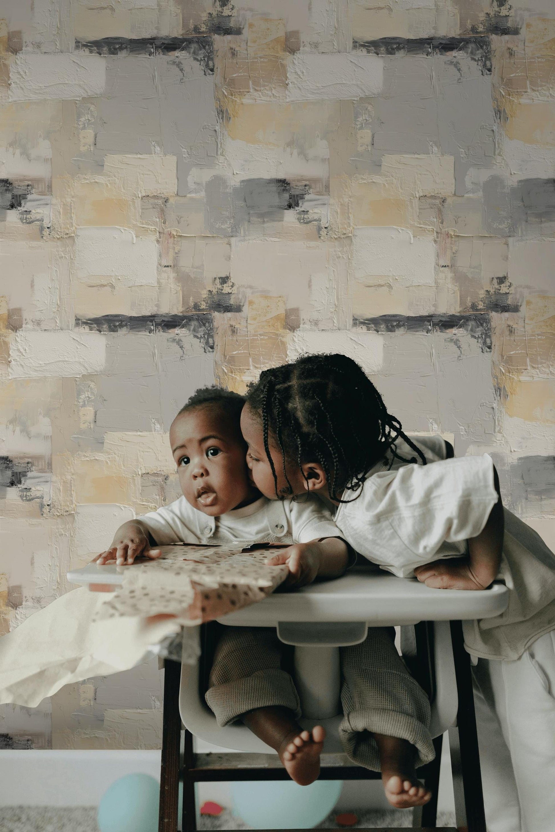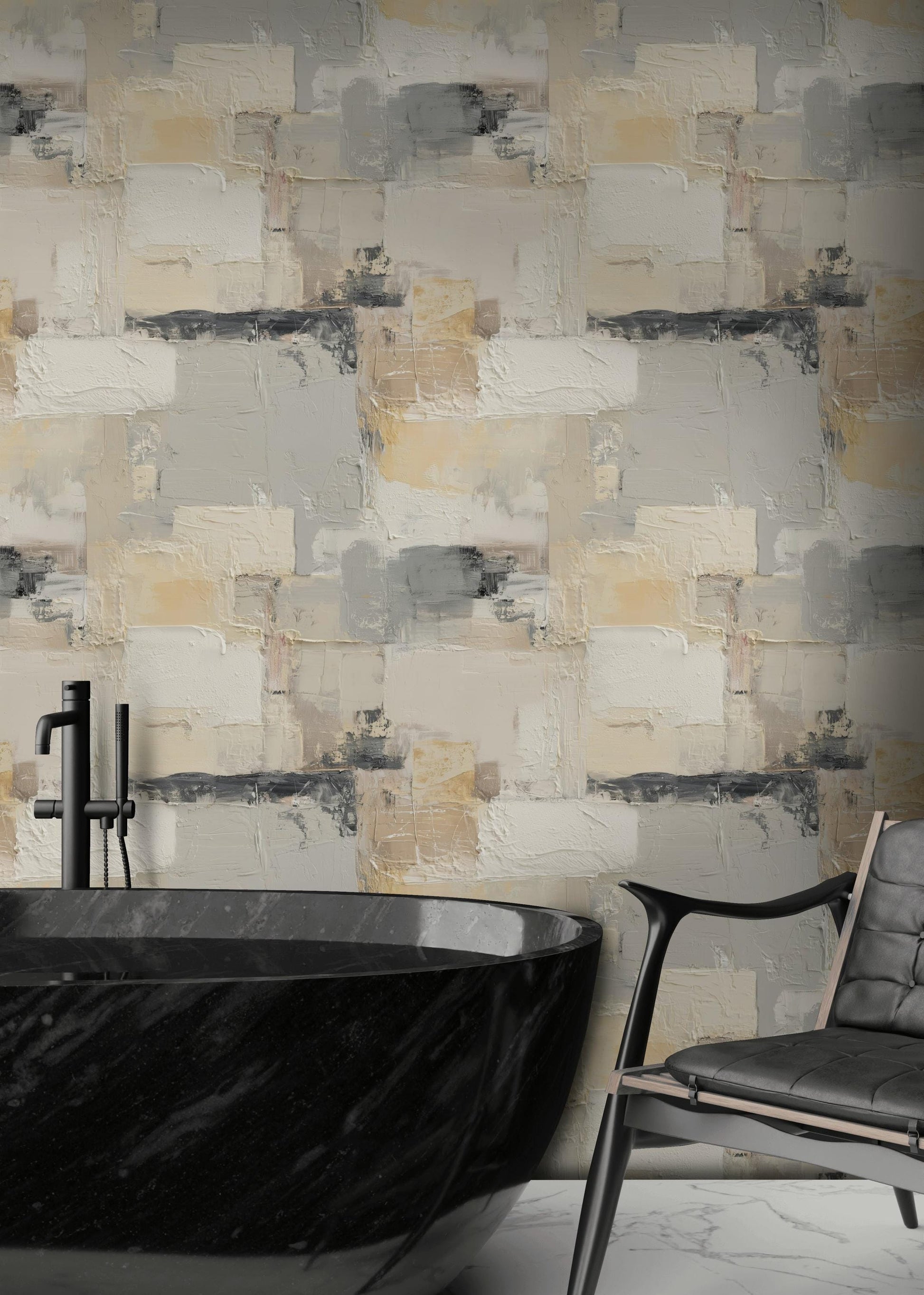 Embrace modern artistry and subtle sophistication with our Abstract Textured Plaster Wallpaper. This contemporary wall mural features a compelling blend of layered, painterly blocks in a soothing neutral palette of warm beiges, soft creams, pale grays, and hints of charcoal black. The rich, tactile appearance mimics the uneven, expressive texture of hand-applied plaster or thick impasto paint strokes, adding profound depth and an artisanal feel to any room.