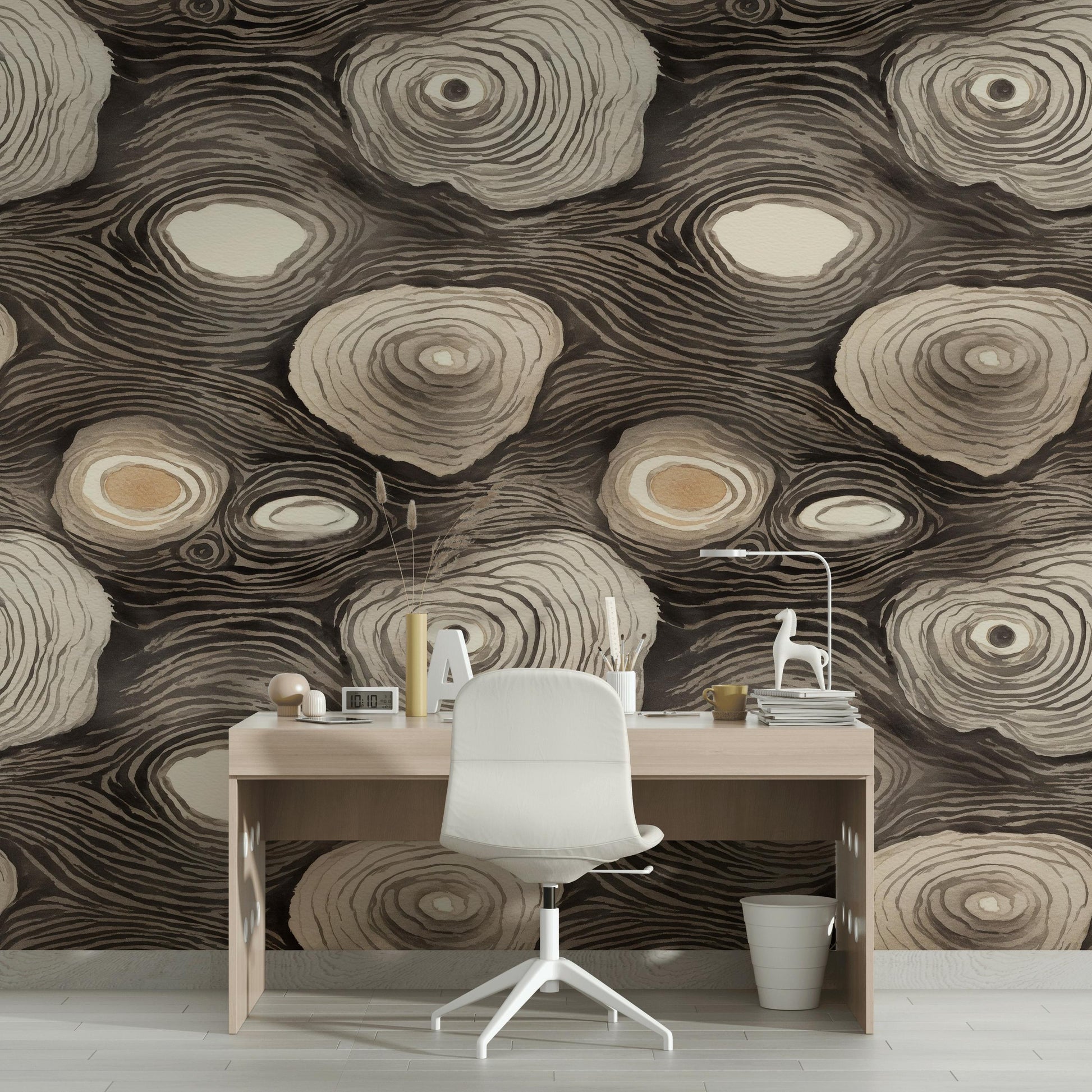 Bring the serene beauty of nature indoors with our captivating Abstract Tree Rings Wallpaper. This unique wall mural features an intricate pattern inspired by the organic growth of tree trunks, showcasing concentric circles and flowing lines in a sophisticated palette of earthy tones including deep grays, rich browns, and warm beiges. The design evokes a sense of calm and natural harmony, perfect for creating a grounding atmosphere in any space.