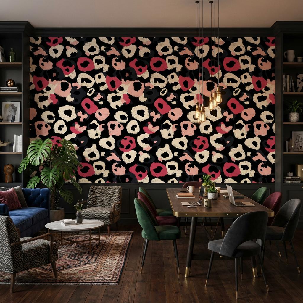 This wallpaper features playful, black white, red pink elements with a abstract and modern style. Perfect for modern interior decoration.