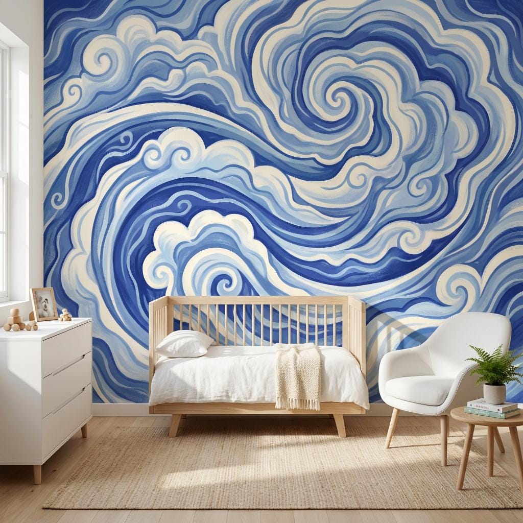 This wallpaper features swirl, dynamic, wave motifs elements in blue and blue tones with a abstract and modern style. Perfect for modern interior decoration.