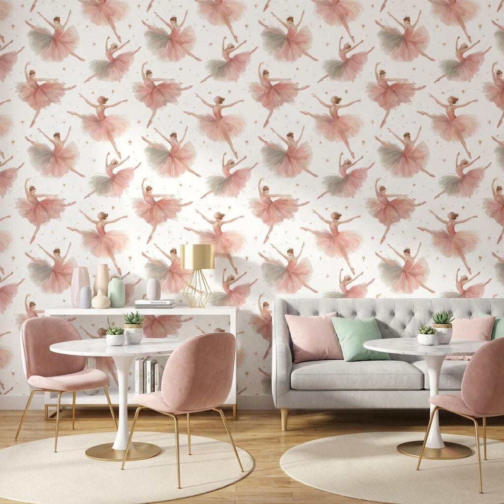 This wallpaper features dancer, starry, ballet elements in pink and gray tones with a artistic and artistic style. Perfect for modern interior decoration.