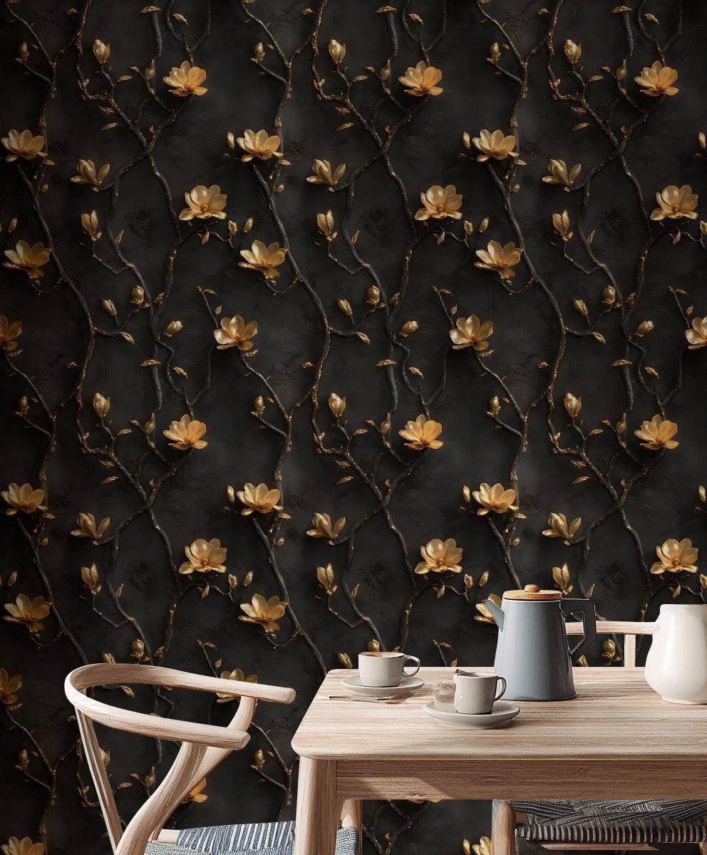 Black and Gold Floral Wallpaper | 3D Embossed Magnolia Mural