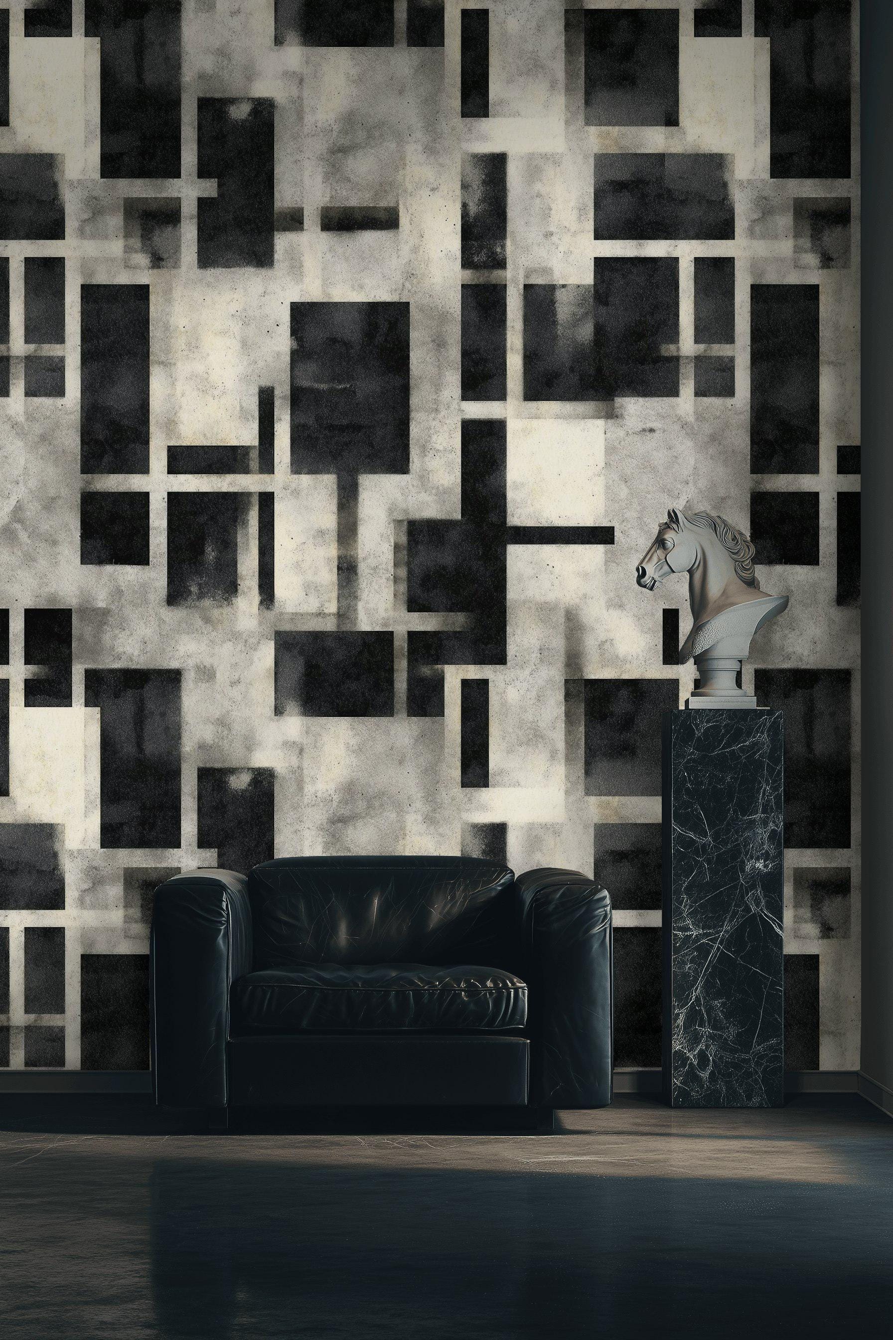 Introduce striking architectural structure with our Modern Geometric Wallpaper. This bold peel and stick wall mural features a high-contrast pattern of layered rectangles and squares in black, charcoal gray, and creamy white. The textured, ink-wash effect gives this Bauhaus-style design depth and sophistication.