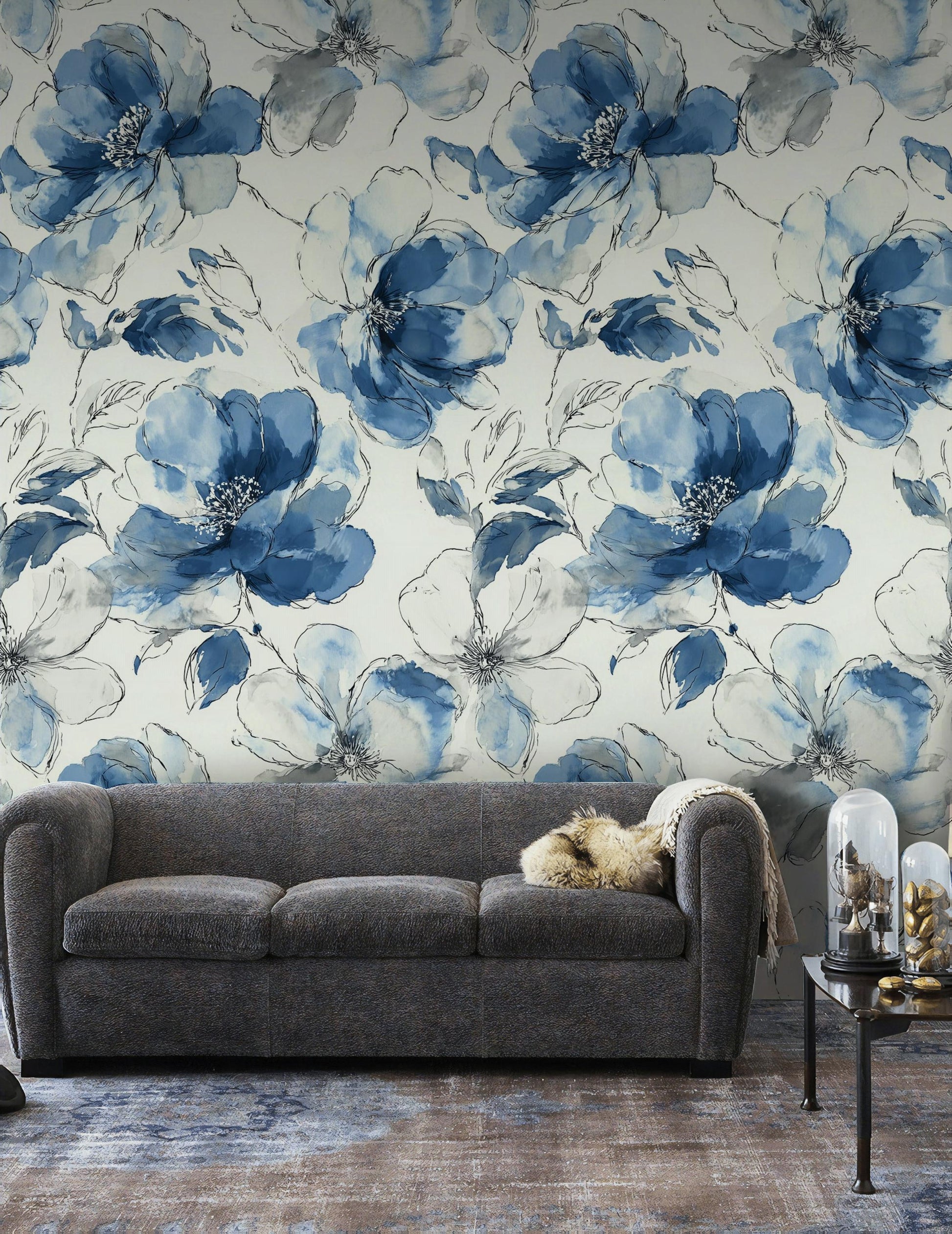 Bring a serene and artistic touch to your home with our captivating Blue Watercolor Floral Wallpaper. This enchanting large peony wall mural features an elegant array of oversized blooms painted in a soft, ethereal watercolor style. The dominant colors are various shades of tranquil blues, ranging from deep indigo to soft sky blue, with subtle hints of grey and delicate black outline details that add definition and depth to each petal.