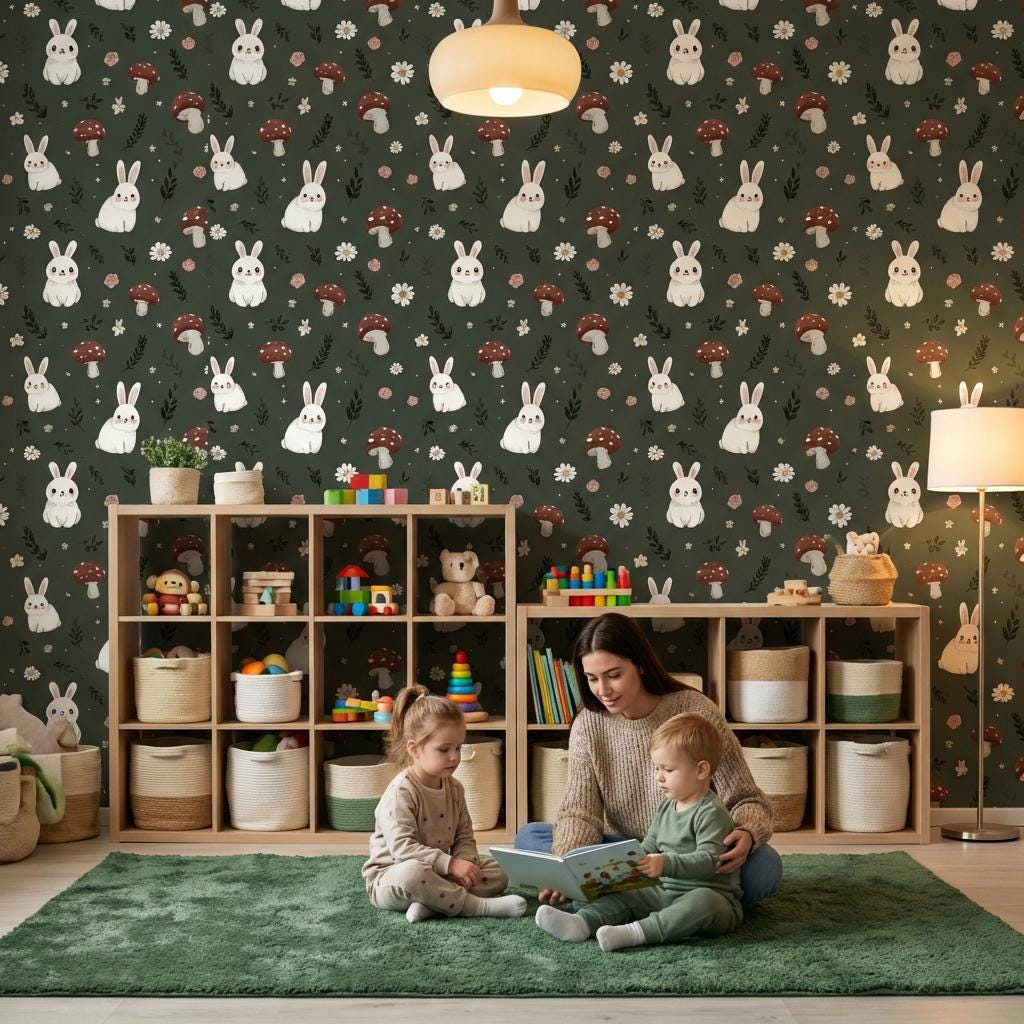 This wallpaper features kids, rabbit, mushroom elements in green tones. Perfect for modern interior decoration.