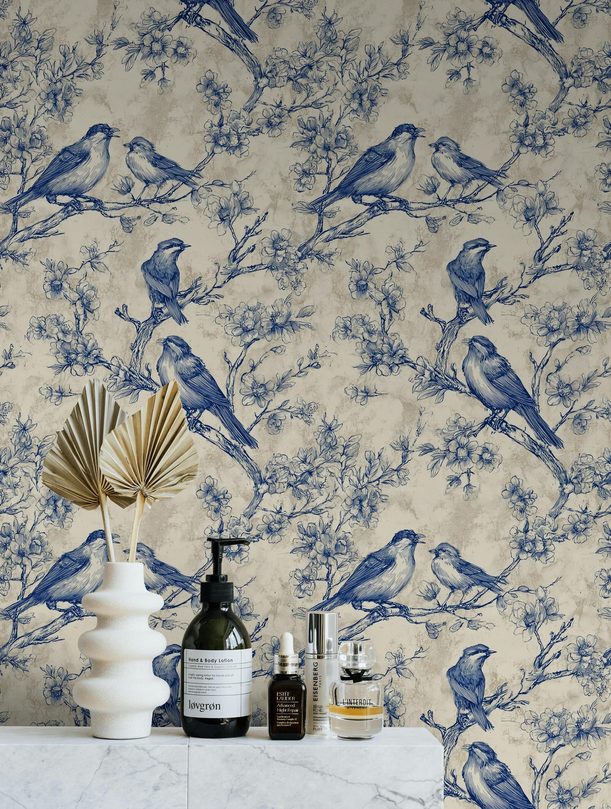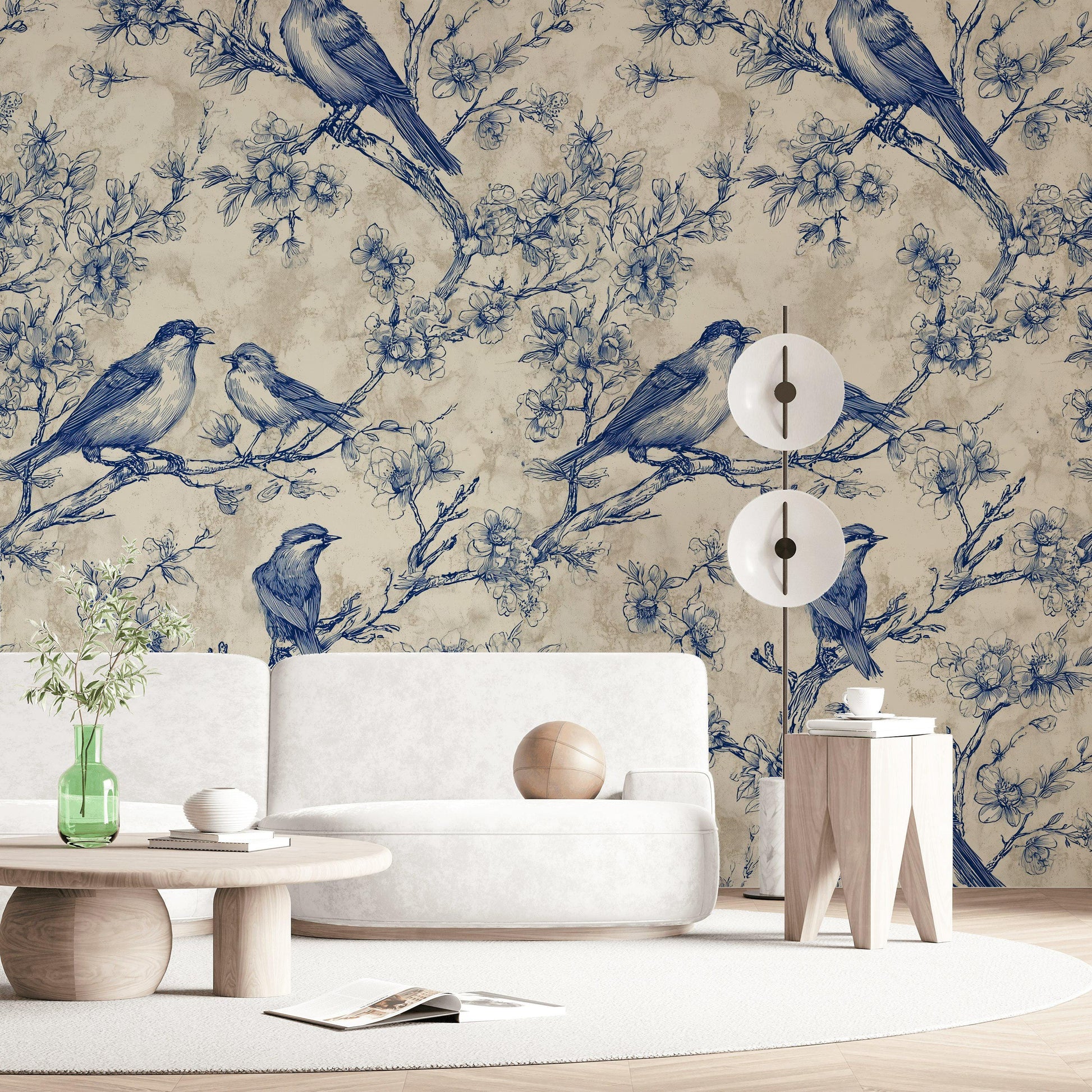 Chinoiserie Bird & Branch Wallpaper | Toile Style Wall Mural | Blue Botanical Peel and Stick Decor