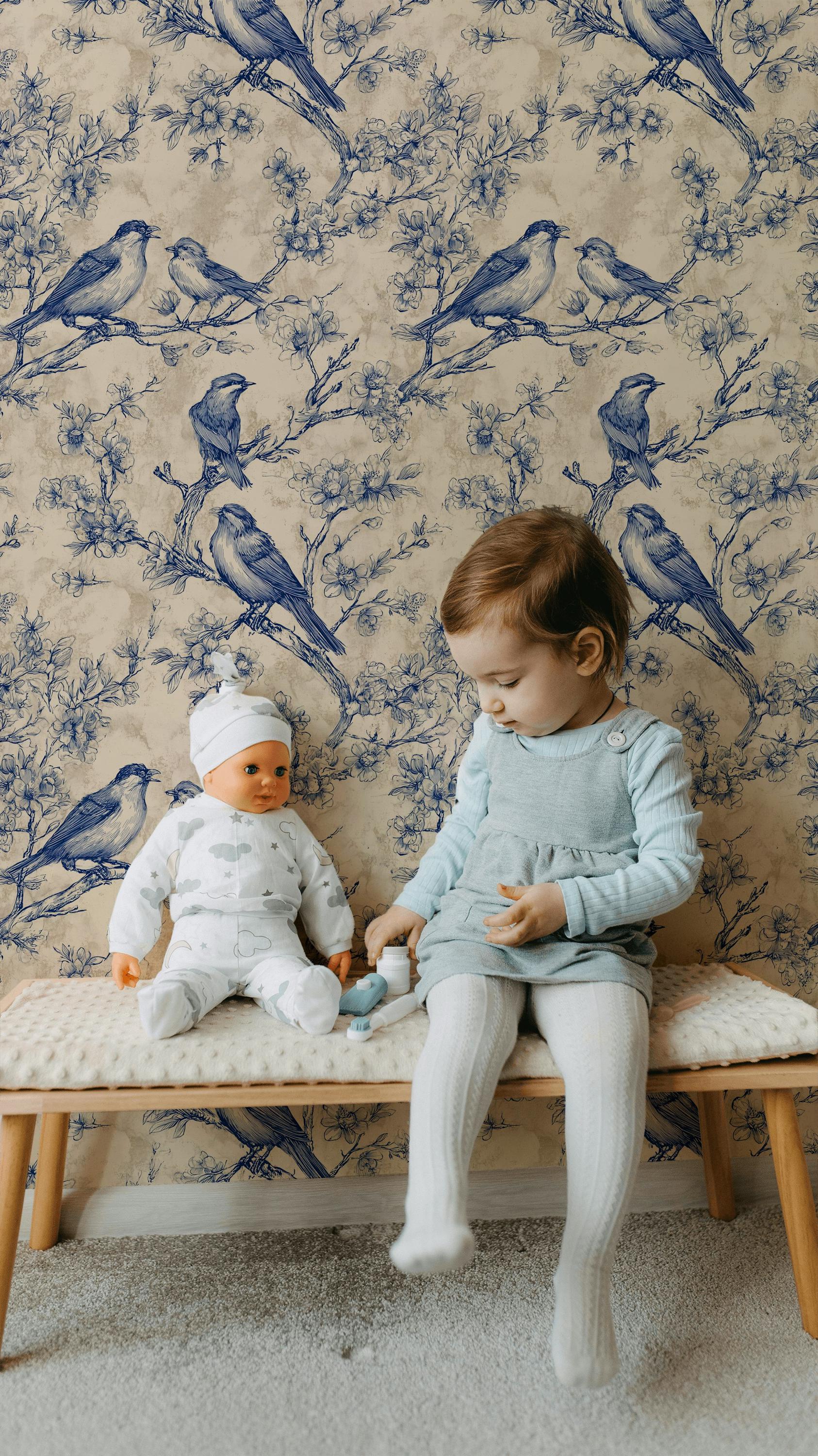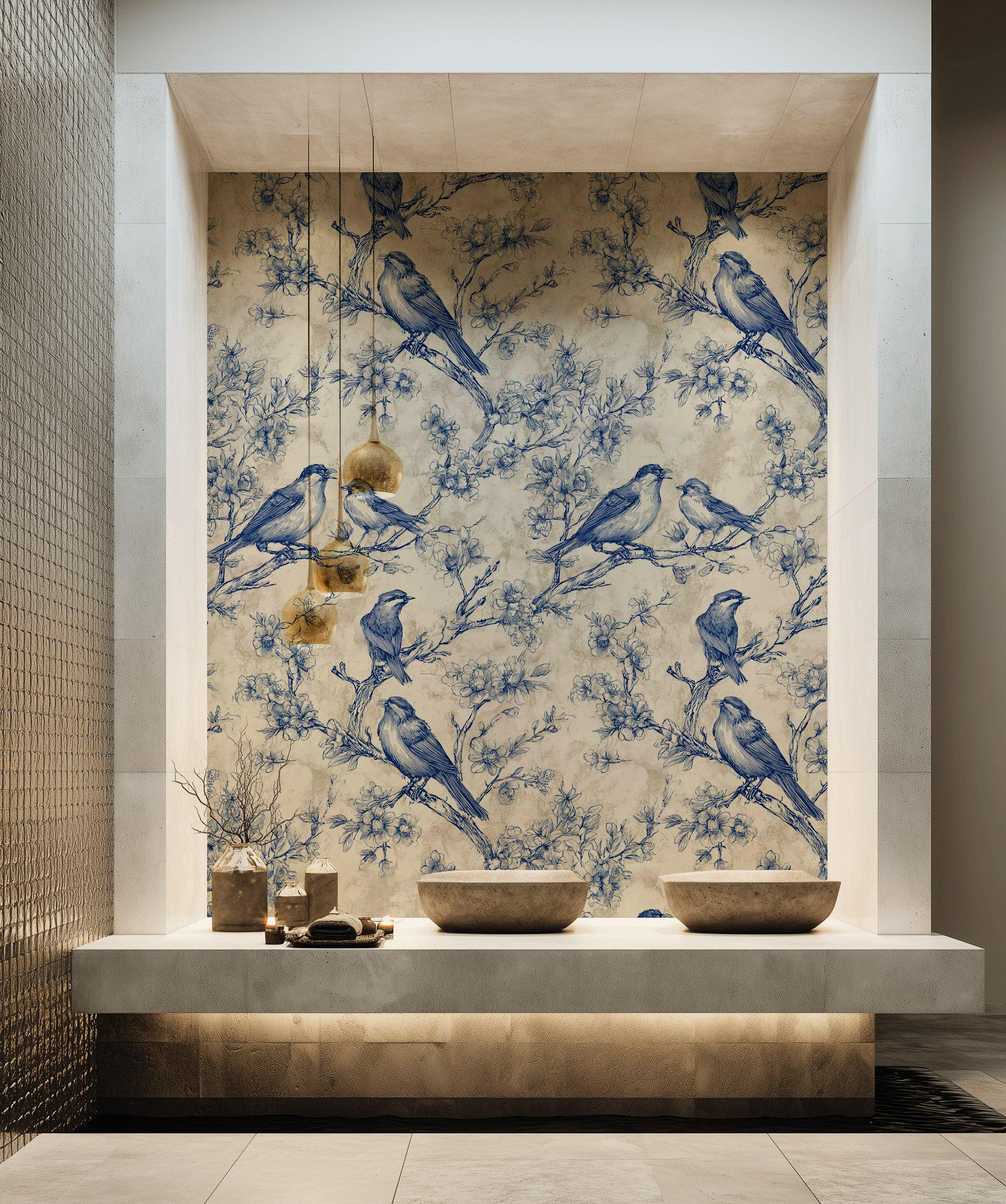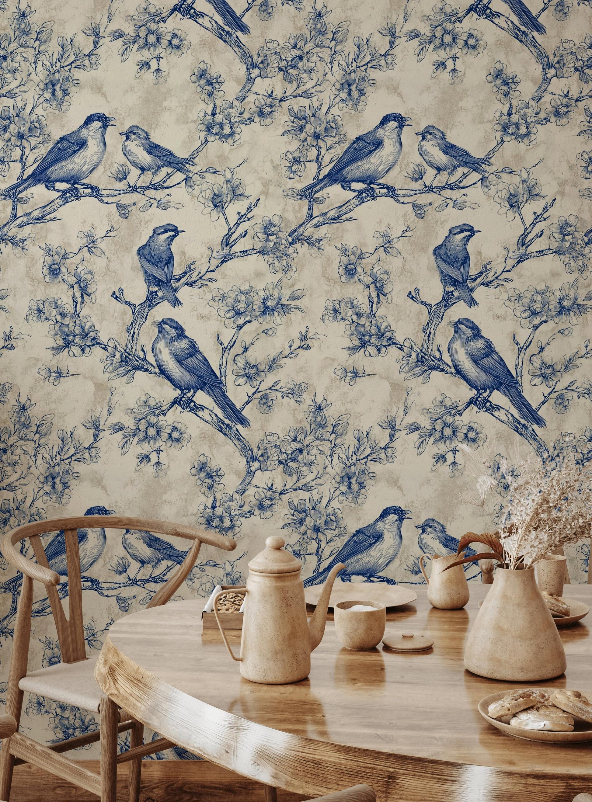 Chinoiserie Bird & Branch Wallpaper | Toile Style Wall Mural | Blue Botanical Peel and Stick Decor