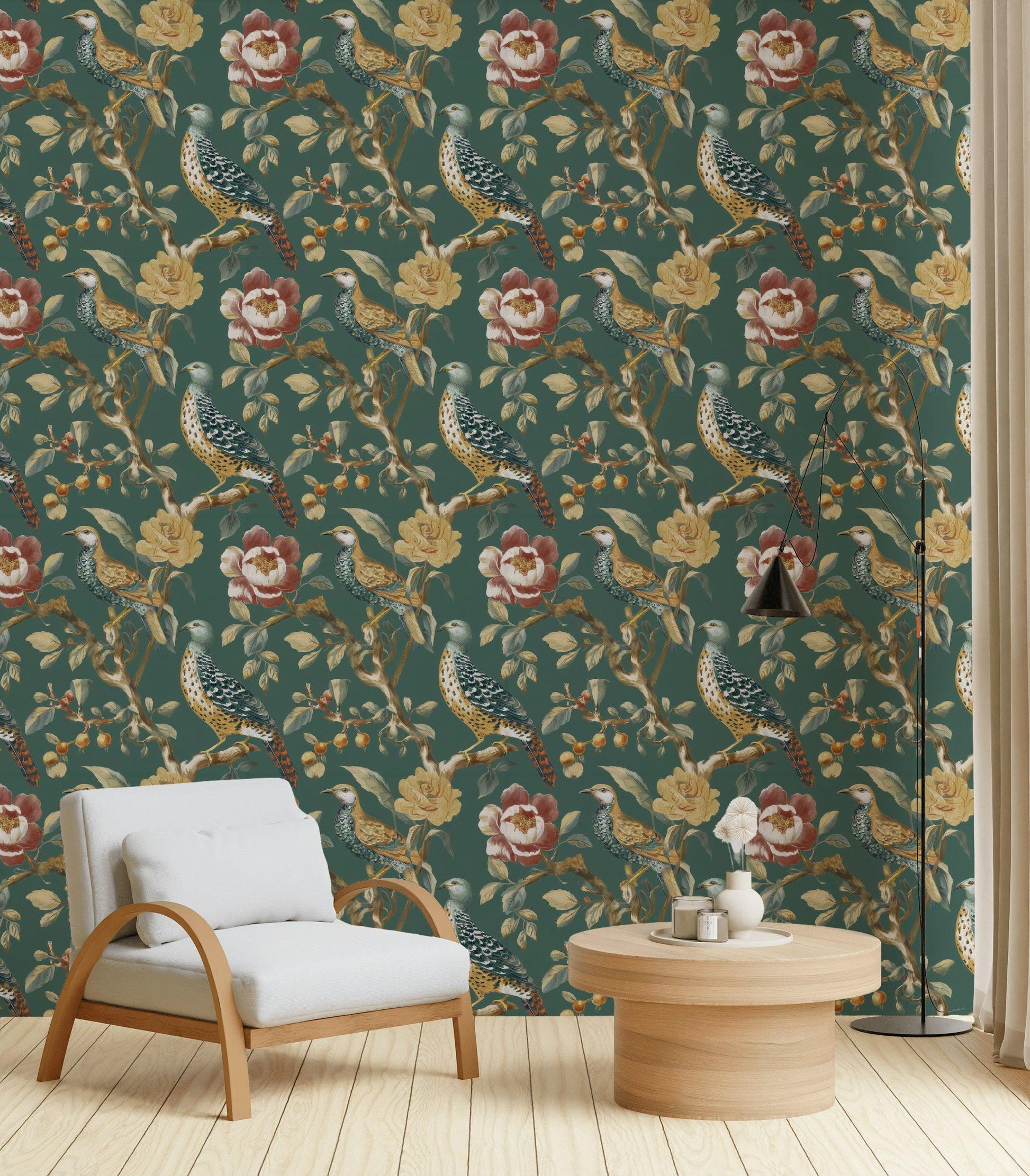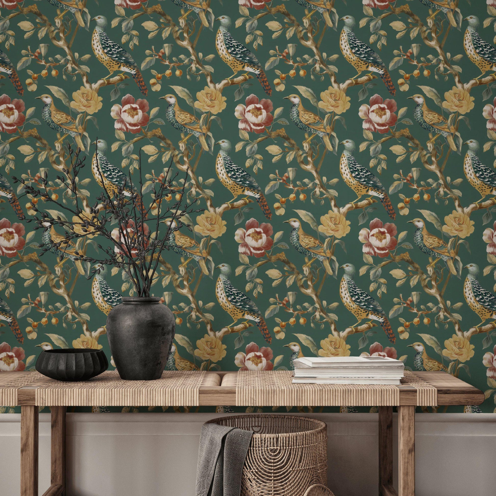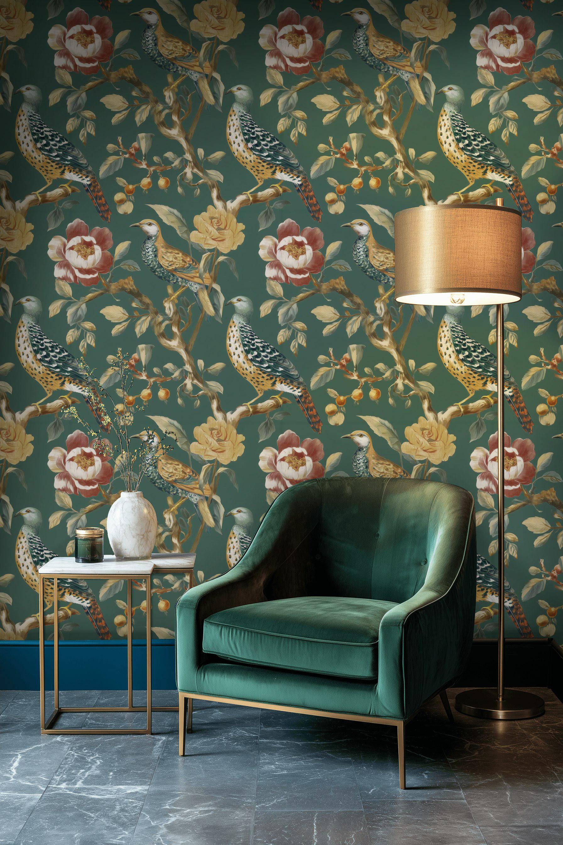Elevate your living room, dining room, or bedroom into a space of refined elegance. This captivating wall mural features a stunning, repeat pattern of detailed exotic birds perched among opulent floral branches against a rich, dark green (or jewel tone) background. Inspired by classic Asian Chinoiserie art, this design evokes a sense of antique beauty and serene drama.