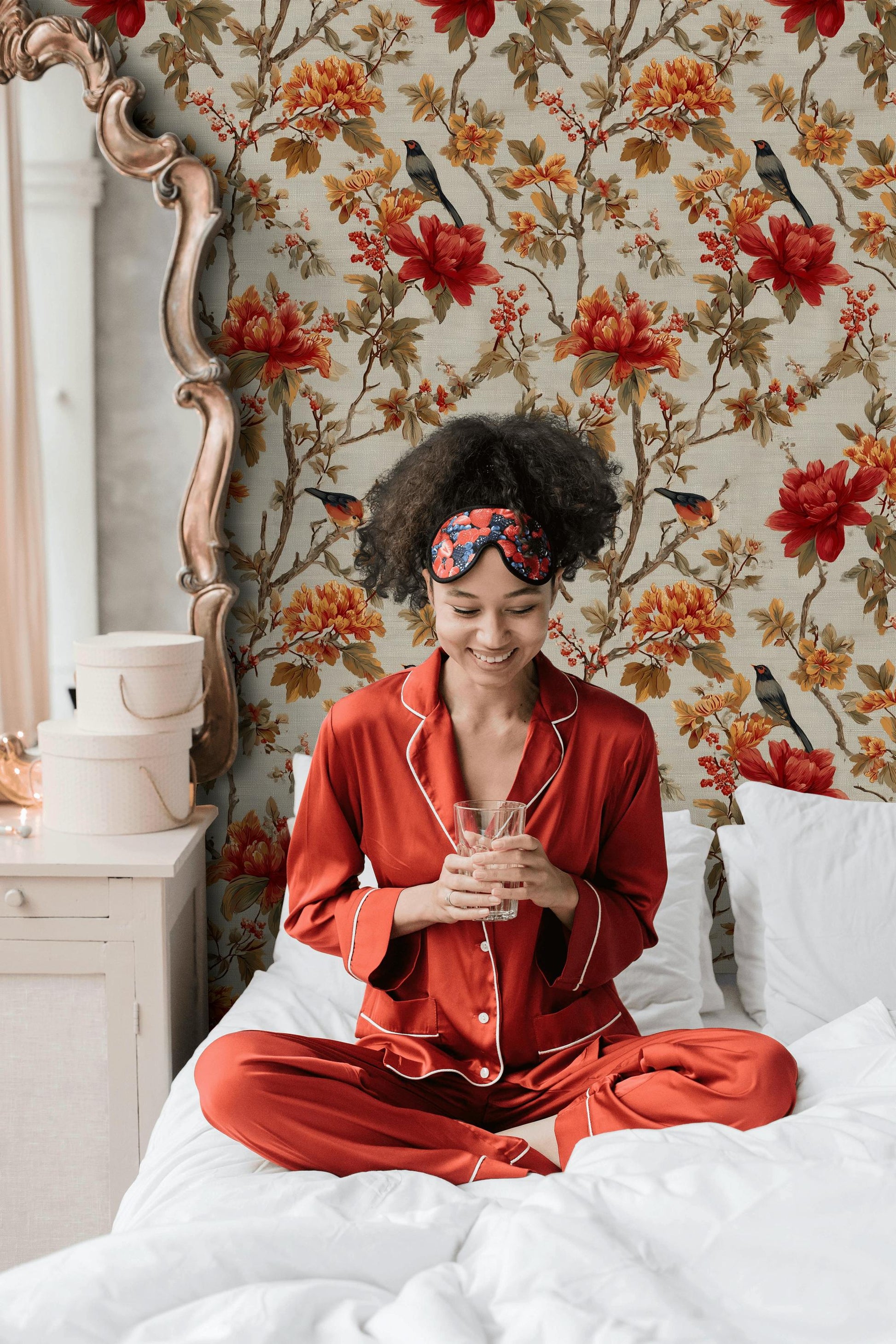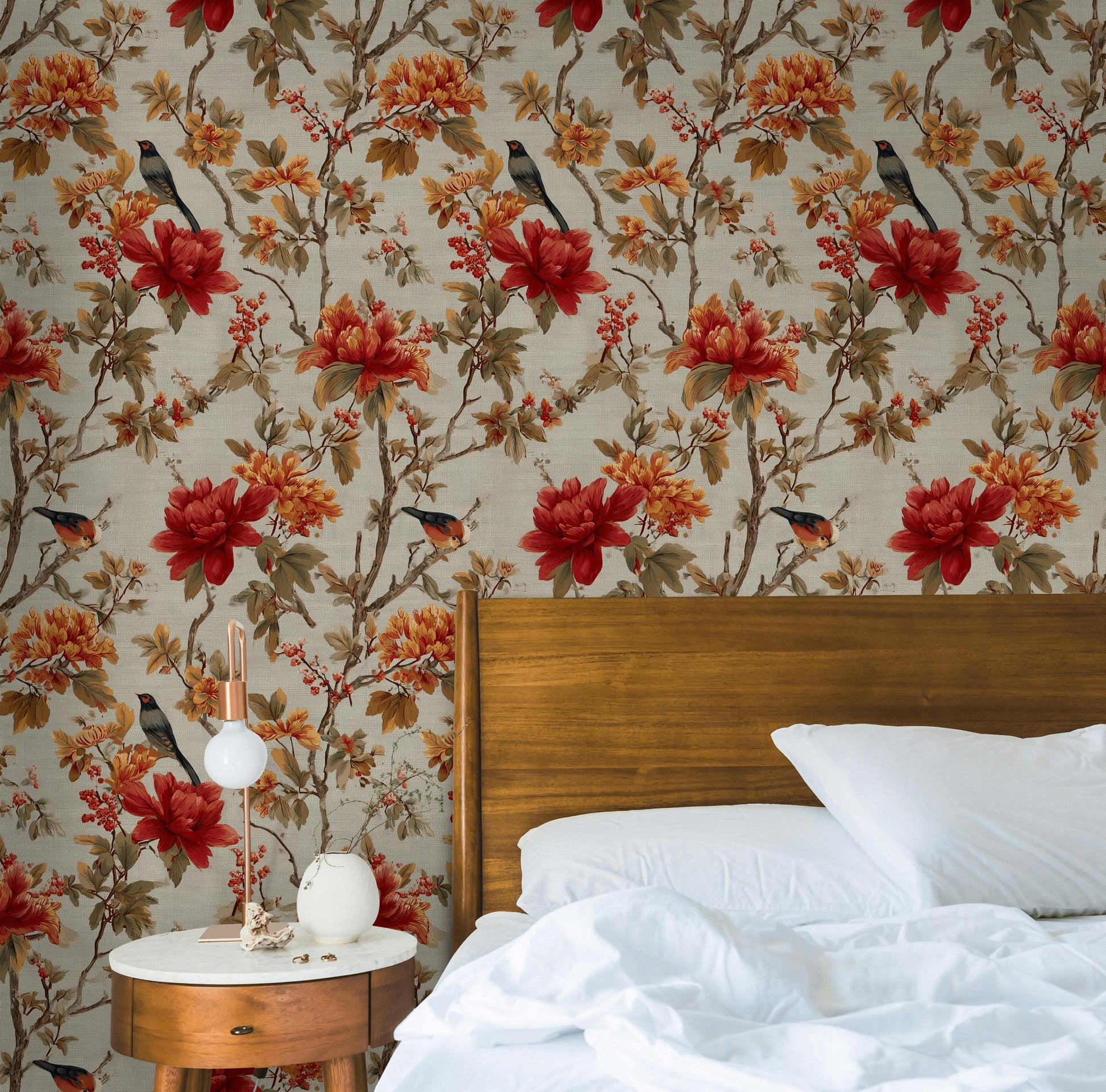 This elegant RADU83 wallpaper pattern features a rich and detailed Chinoiserie-style design, inspired by traditional Asian art. It showcases vibrant red and orange flowers, intricate branches, and graceful birds, all set against a soft, linen-textured off-white background.