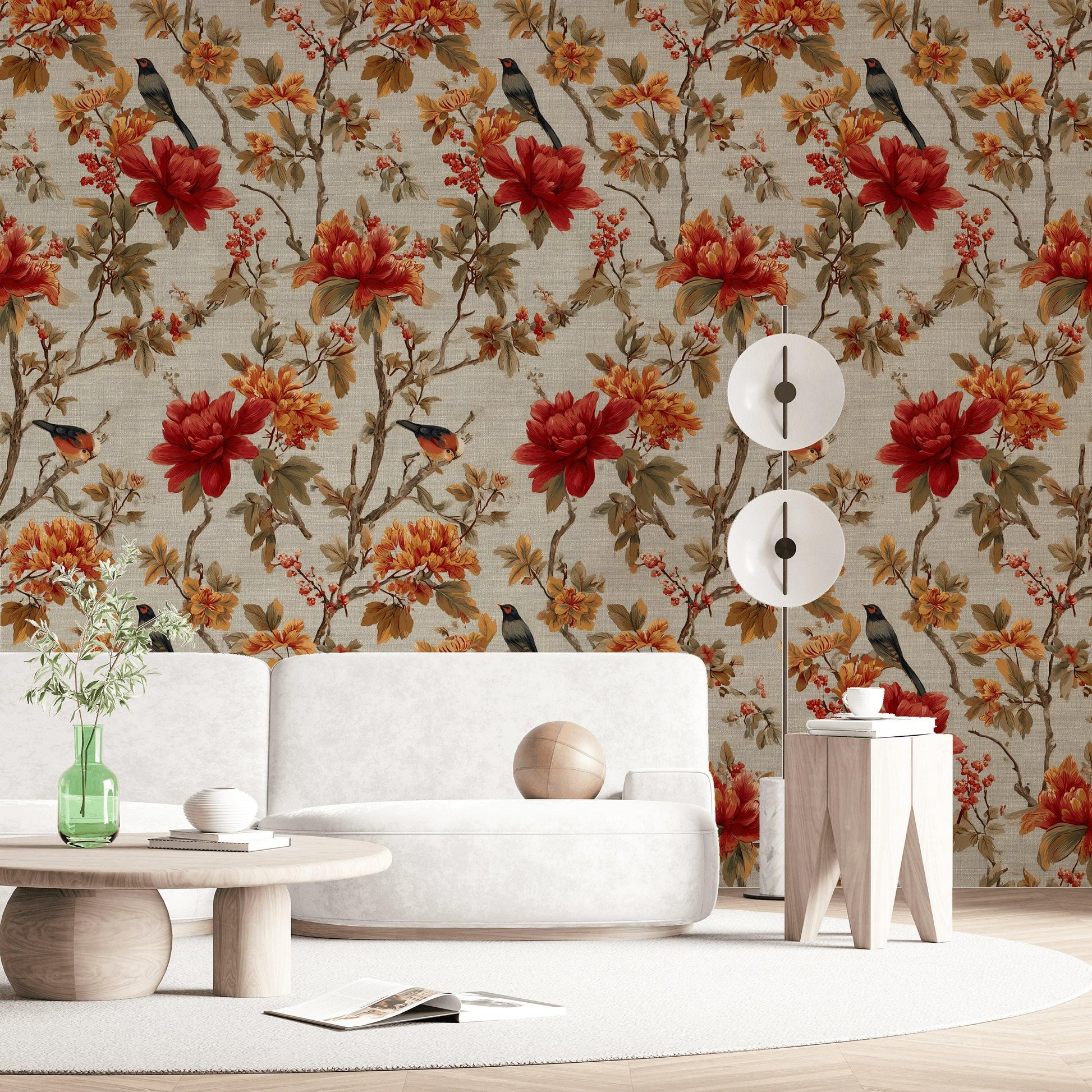 This elegant RADU83 wallpaper pattern features a rich and detailed Chinoiserie-style design, inspired by traditional Asian art. It showcases vibrant red and orange flowers, intricate branches, and graceful birds, all set against a soft, linen-textured off-white background.