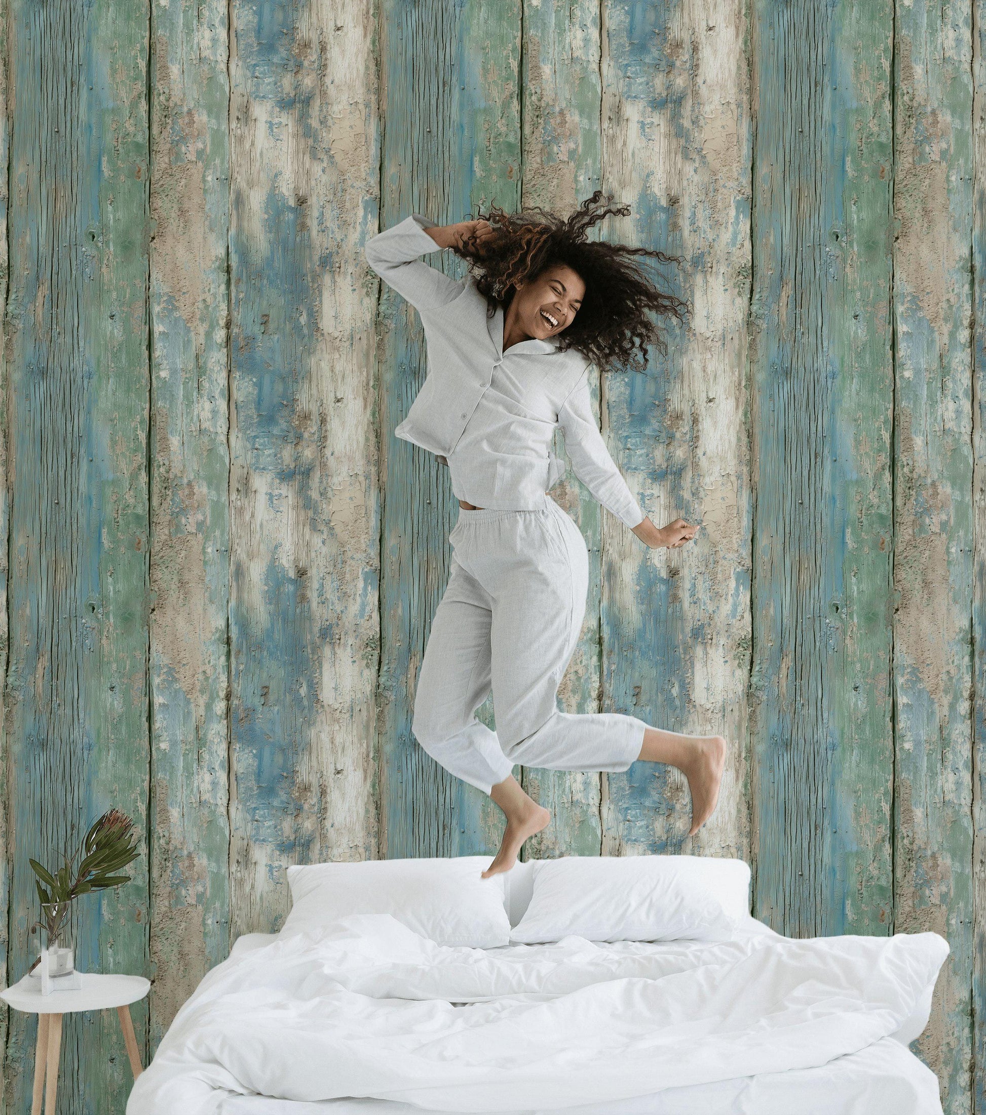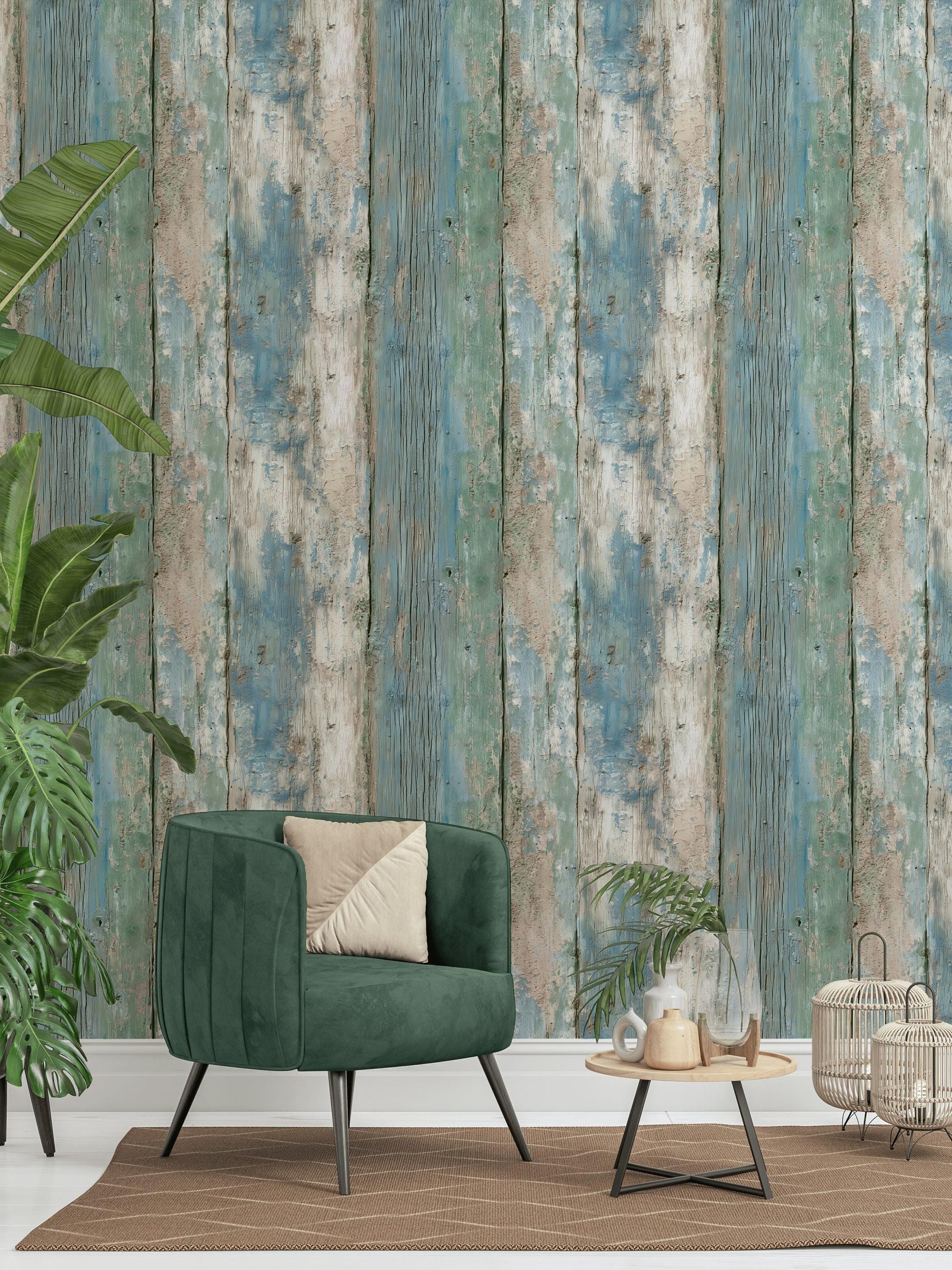Capture the sun-bleached, weathered soul of a coastal cottage and bring it directly into your home. This charming wallpaper mural features an authentic, highly detailed representation of old wood planks with deeply distressed, peeling paint in serene tones of seafoam green, dusty blue, and aged white. The realistic texture and vertical lines make any space feel instantly cozy, rustic, and full of vintage character.