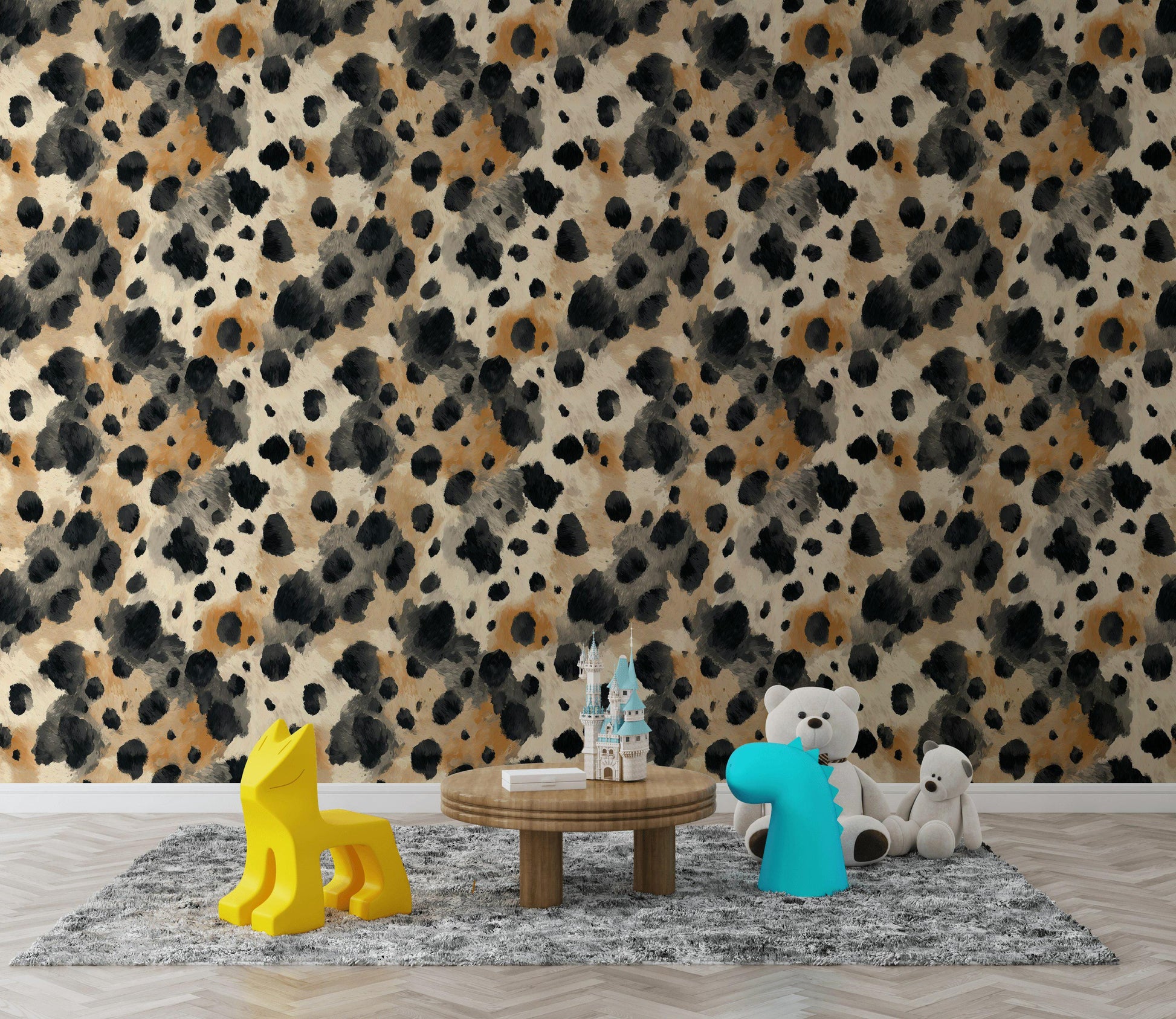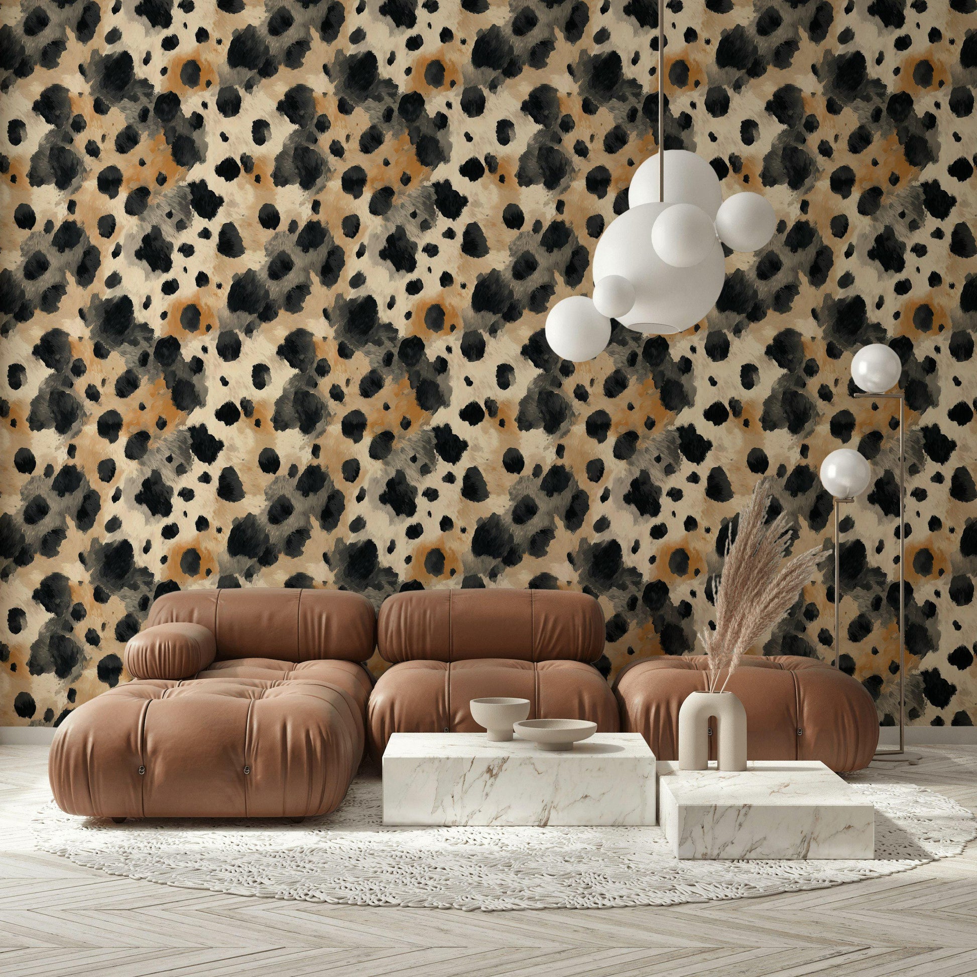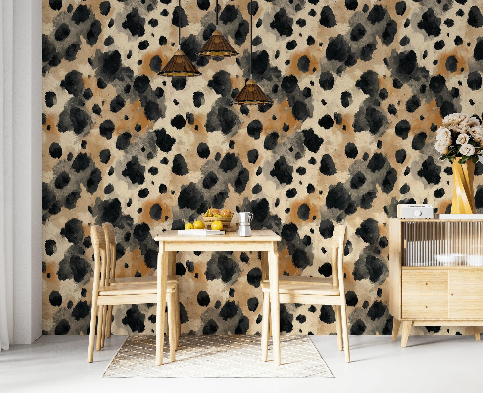 Unleash your wild side with this bold Abstract Cowhide Print Wallpaper. This unique mural features an energetic, hand-painted texture with large, irregular spots, reminiscent of cowhide or a stylized leopard print. The warm neutral palette of deep black, charcoal, and warm tan/beige adds a touch of bohemian chic and modern farmhouse charm to any room.