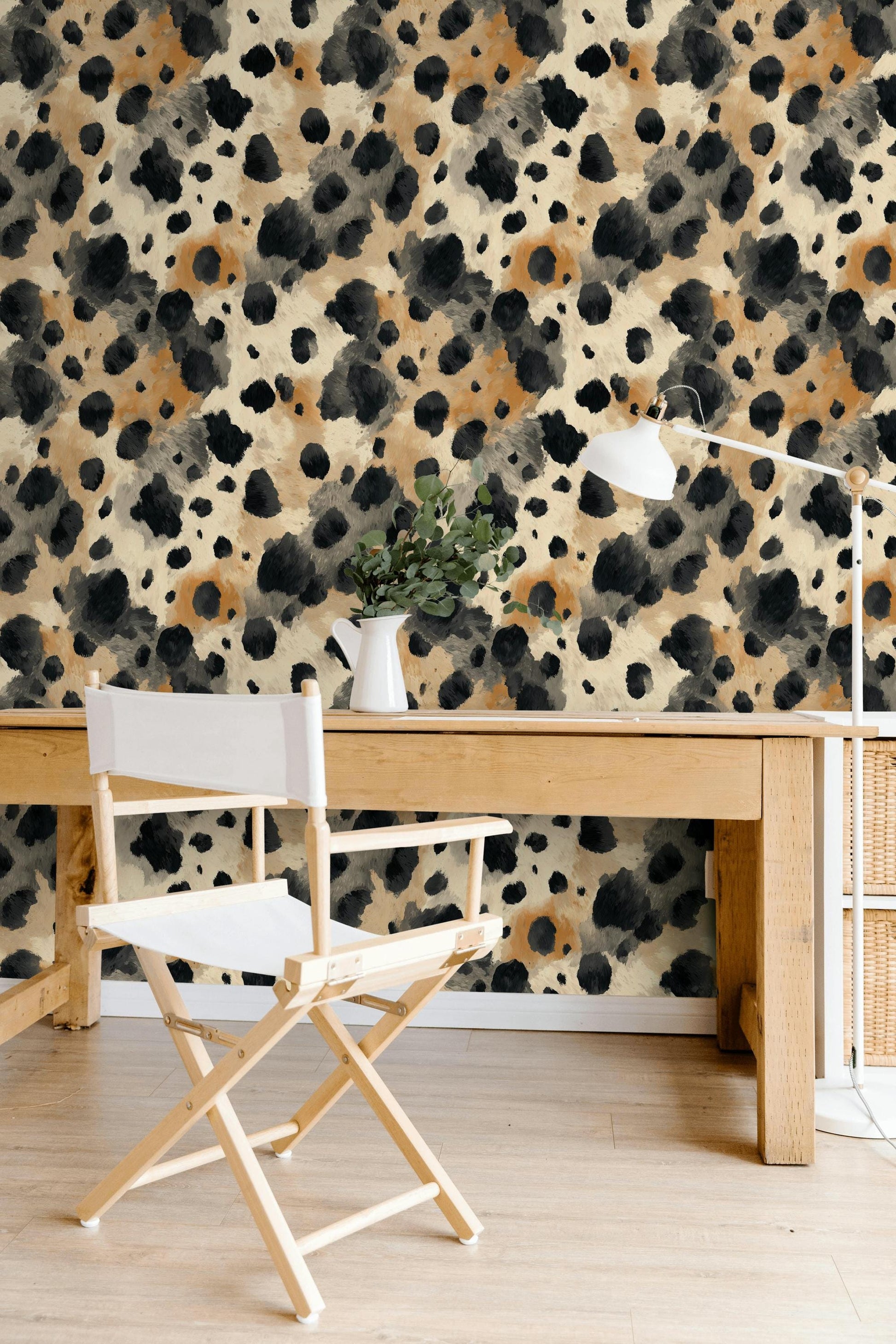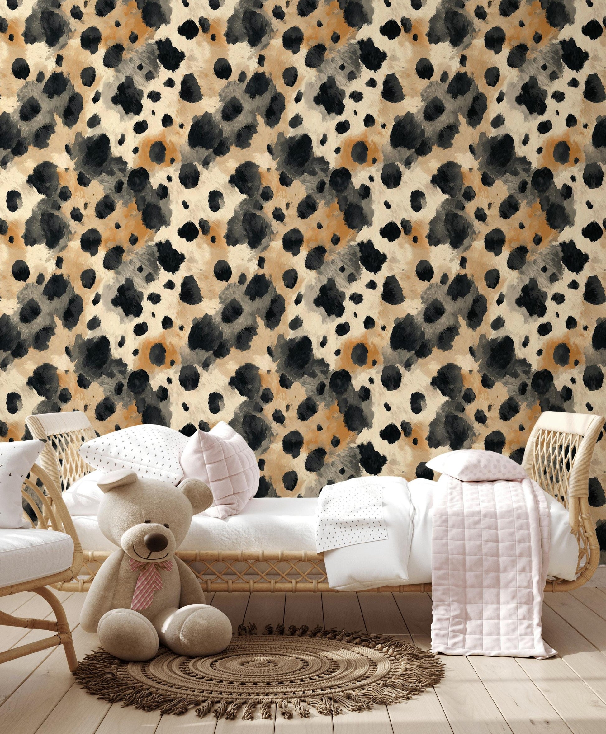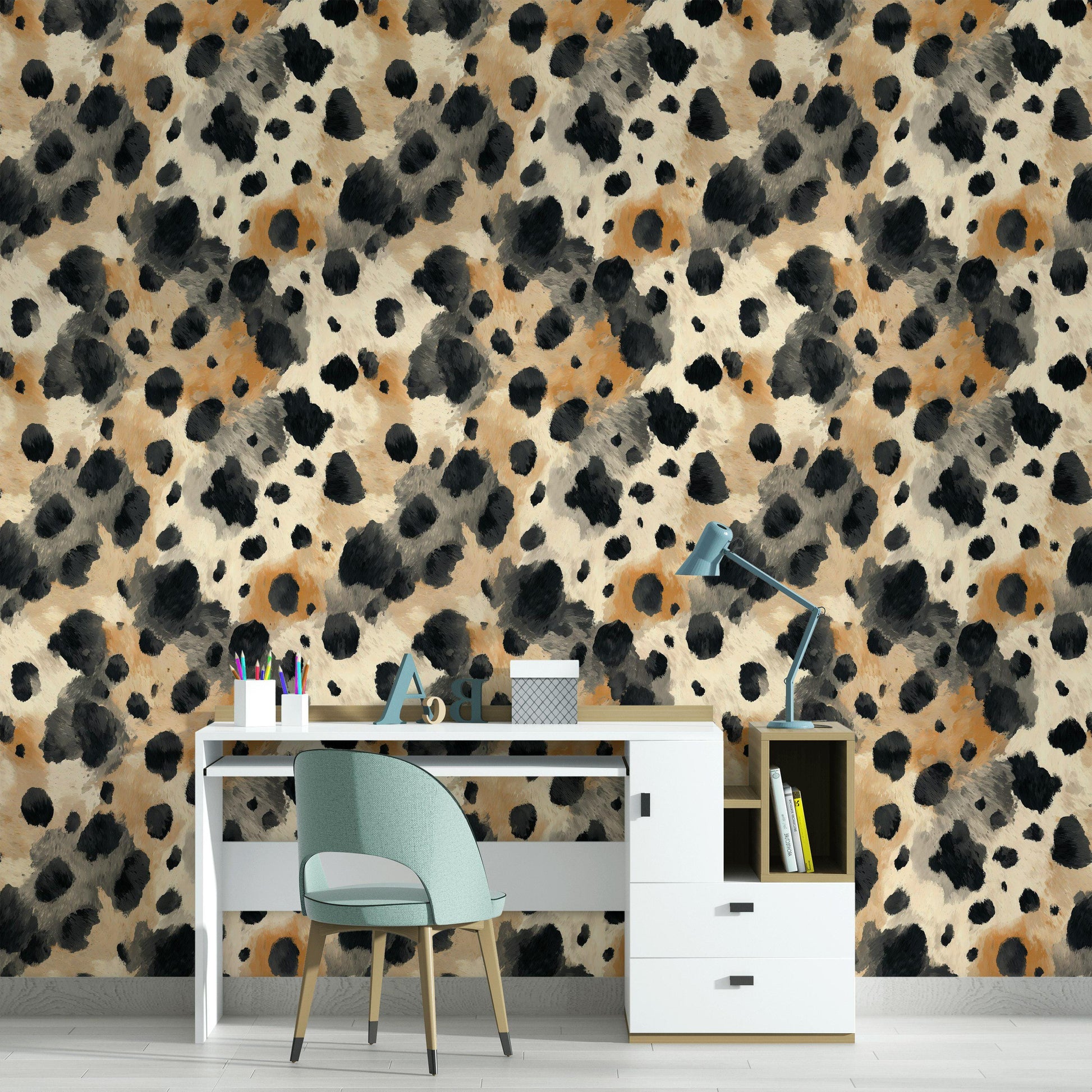 Unleash your wild side with this bold Abstract Cowhide Print Wallpaper. This unique mural features an energetic, hand-painted texture with large, irregular spots, reminiscent of cowhide or a stylized leopard print. The warm neutral palette of deep black, charcoal, and warm tan/beige adds a touch of bohemian chic and modern farmhouse charm to any room.