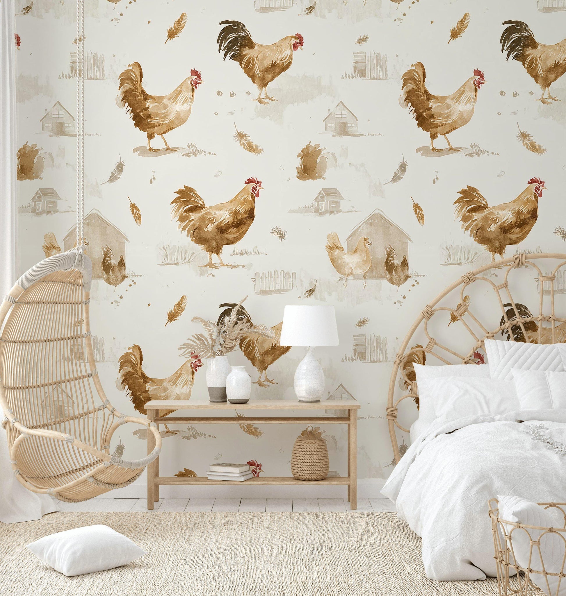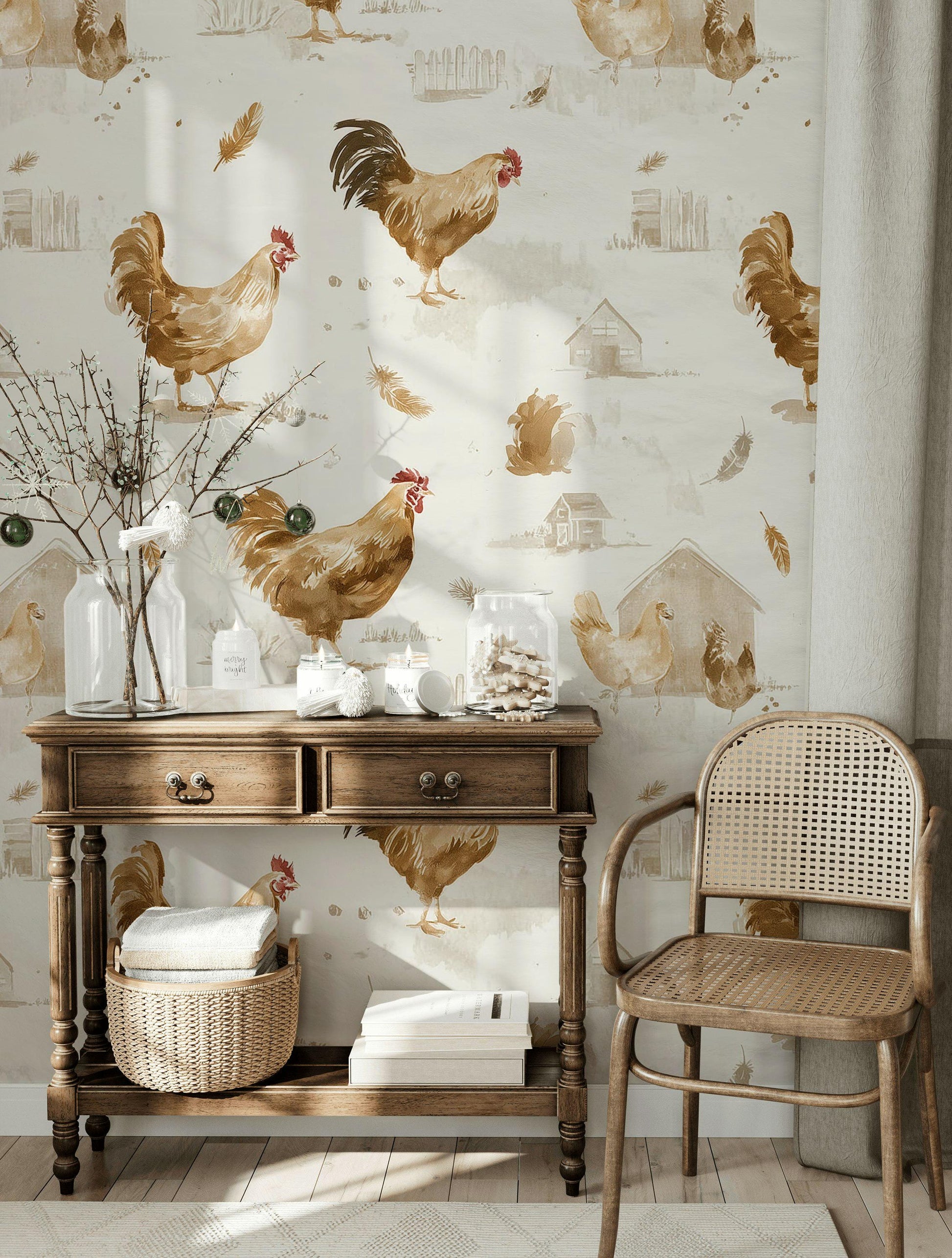 Farmhouse Rooster Chicken Wallpaper | Rustic Country Wall Mural | Watercolor Peel and Stick Decor