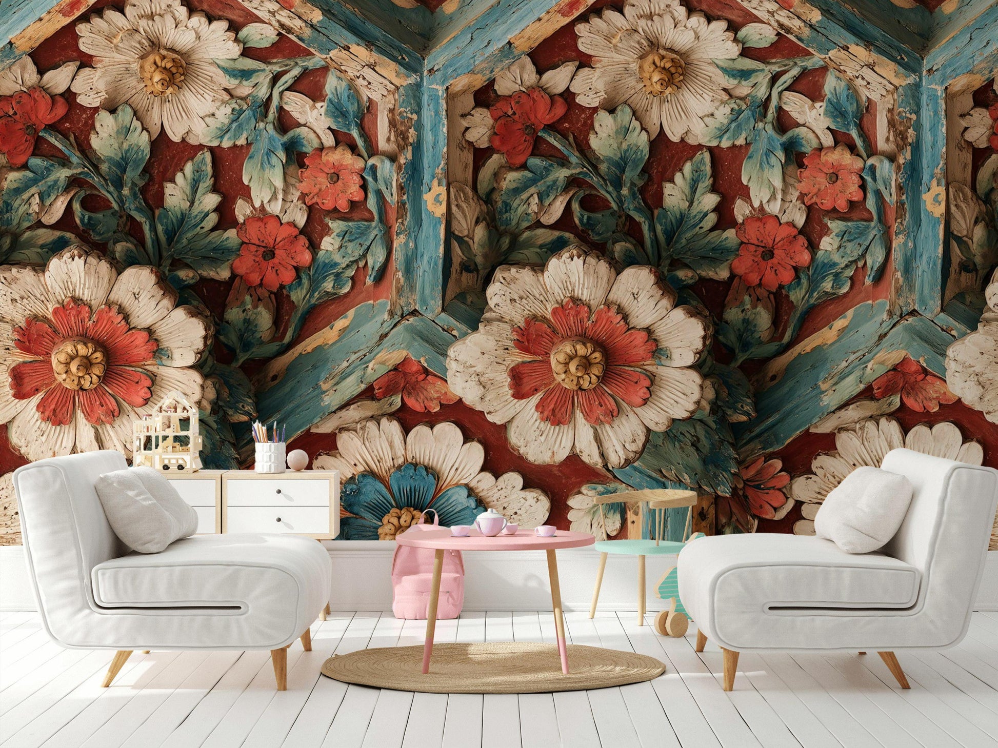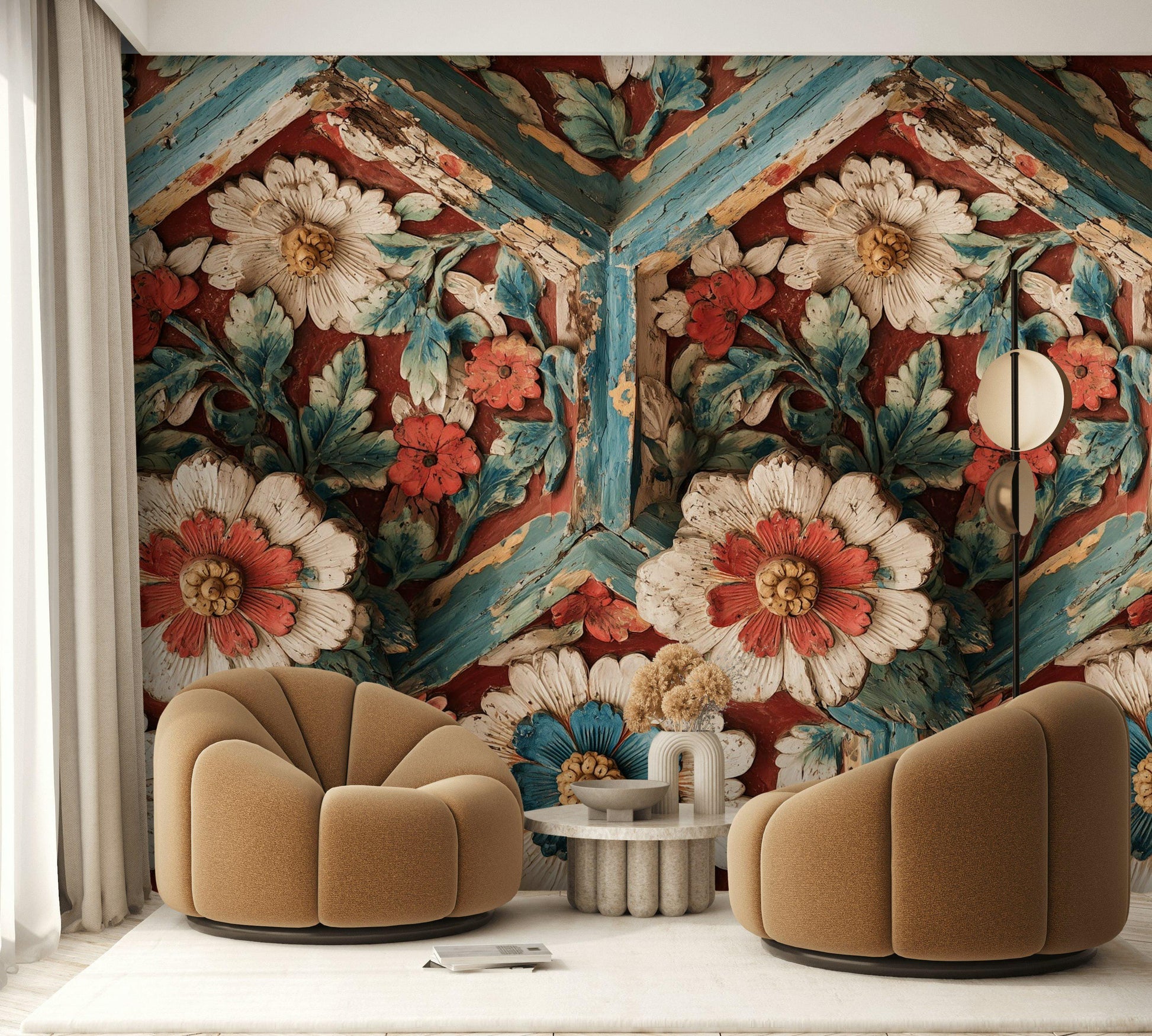 Bring the stunning texture and soulful character of antique carved wood into your home with our incredible trompe l'oeil wallpaper. This photorealistic design gives the convincing illusion of a rustic, hand-carved and painted wall panel. It features large, stylized flowers in relief, set within a geometric framework of distressed, peeling teal paint. The rich red background and incredible 3D effect create a sense of depth, history, and artistry on a completely smooth surface.