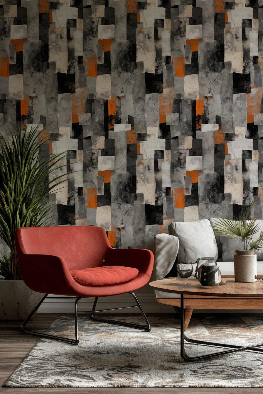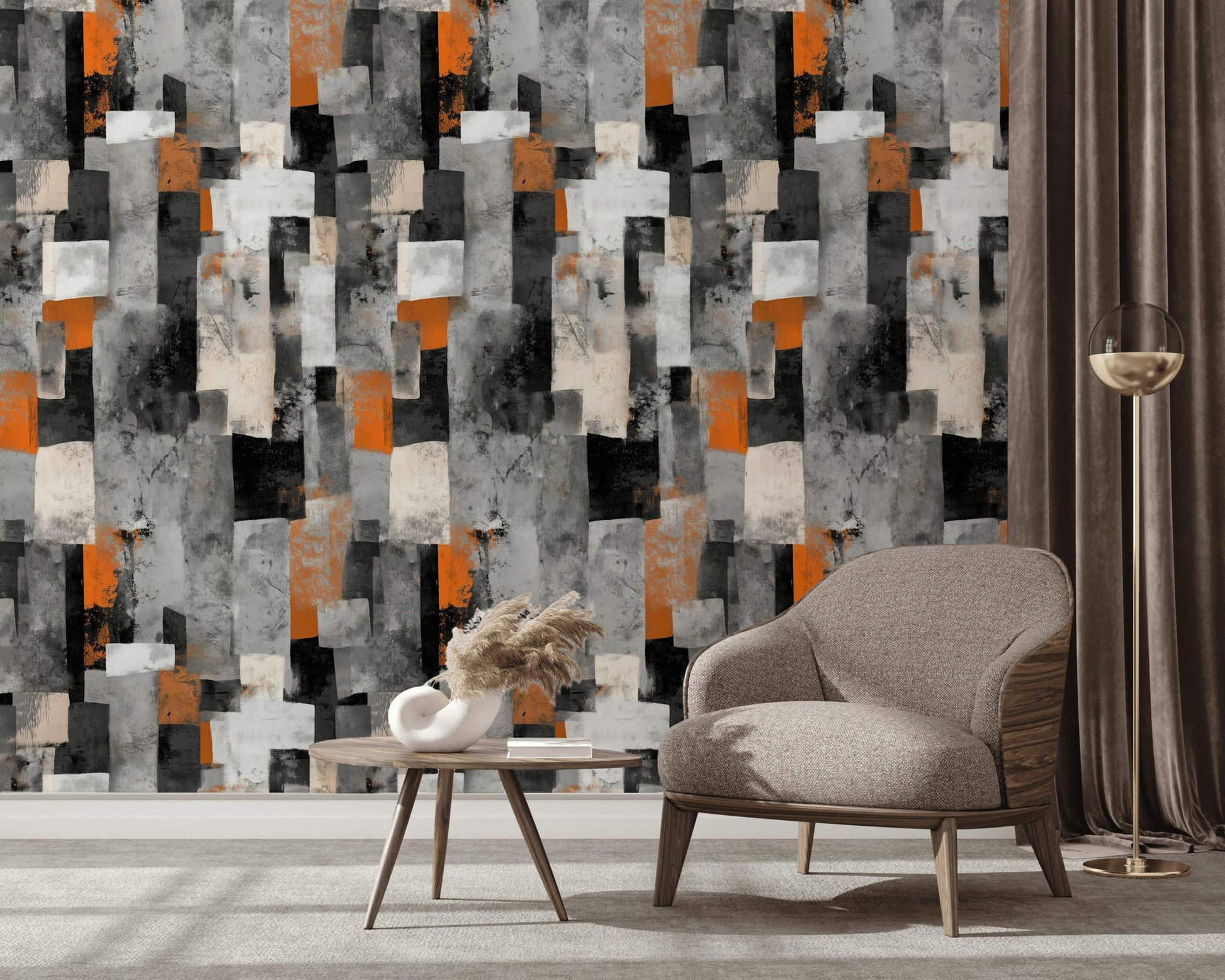 Geometric Block Wallpaper Mural: Orange, Grey, Black Peel and Stick Art