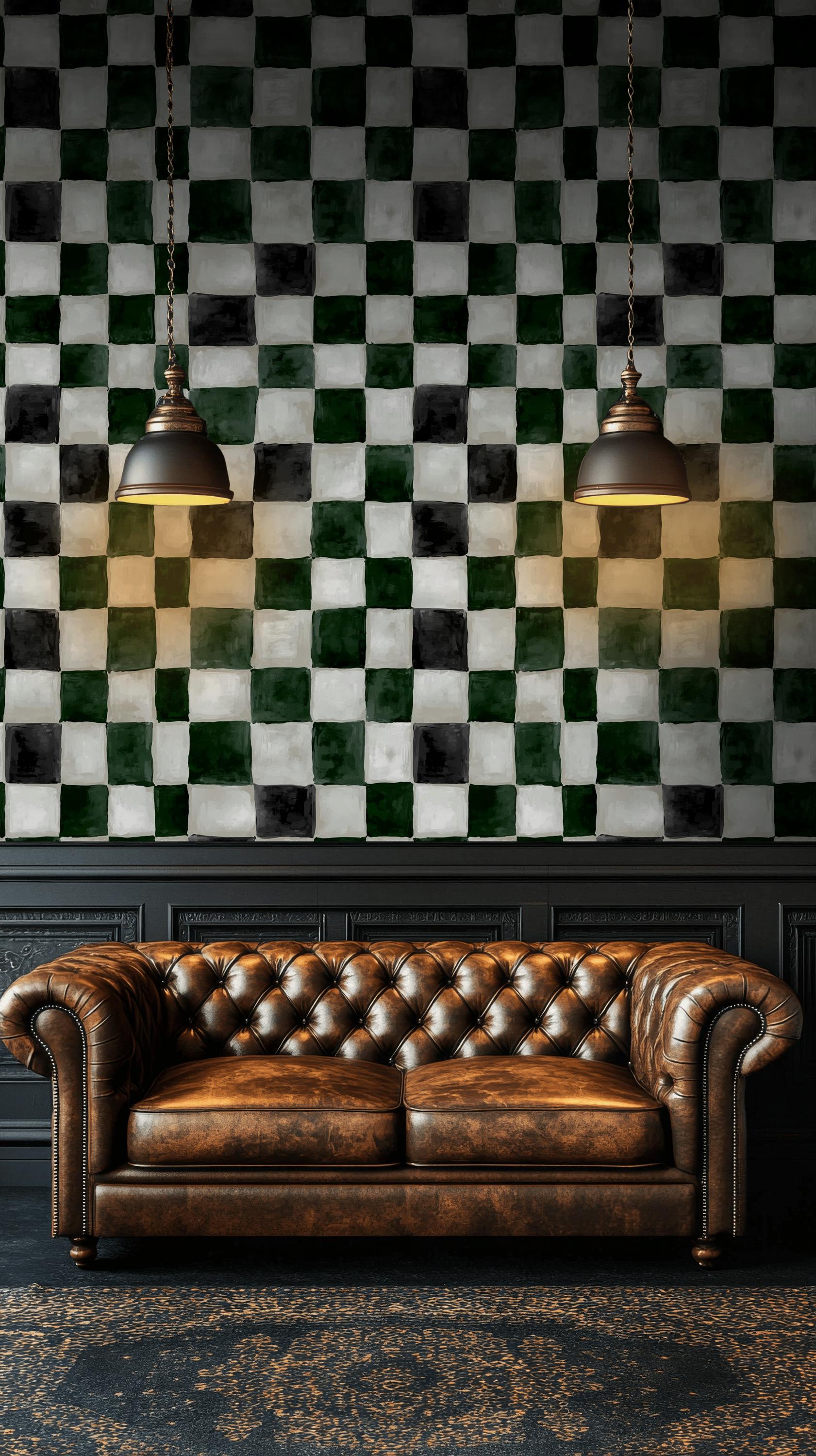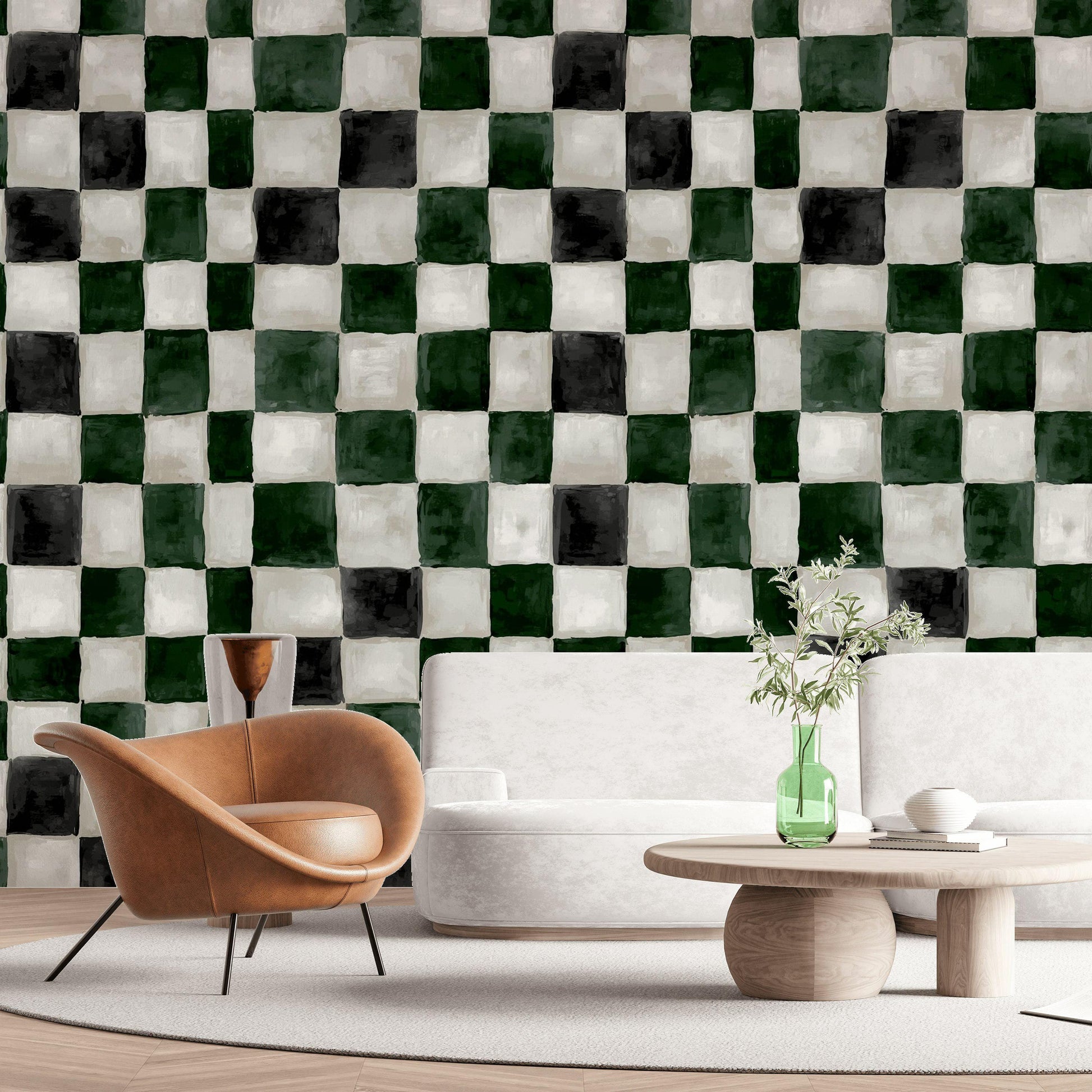 Hand-Painted Checkerboard Wallpaper | Rustic Farmhouse Wall Mural | Green Plaid Peel and Stick Decor