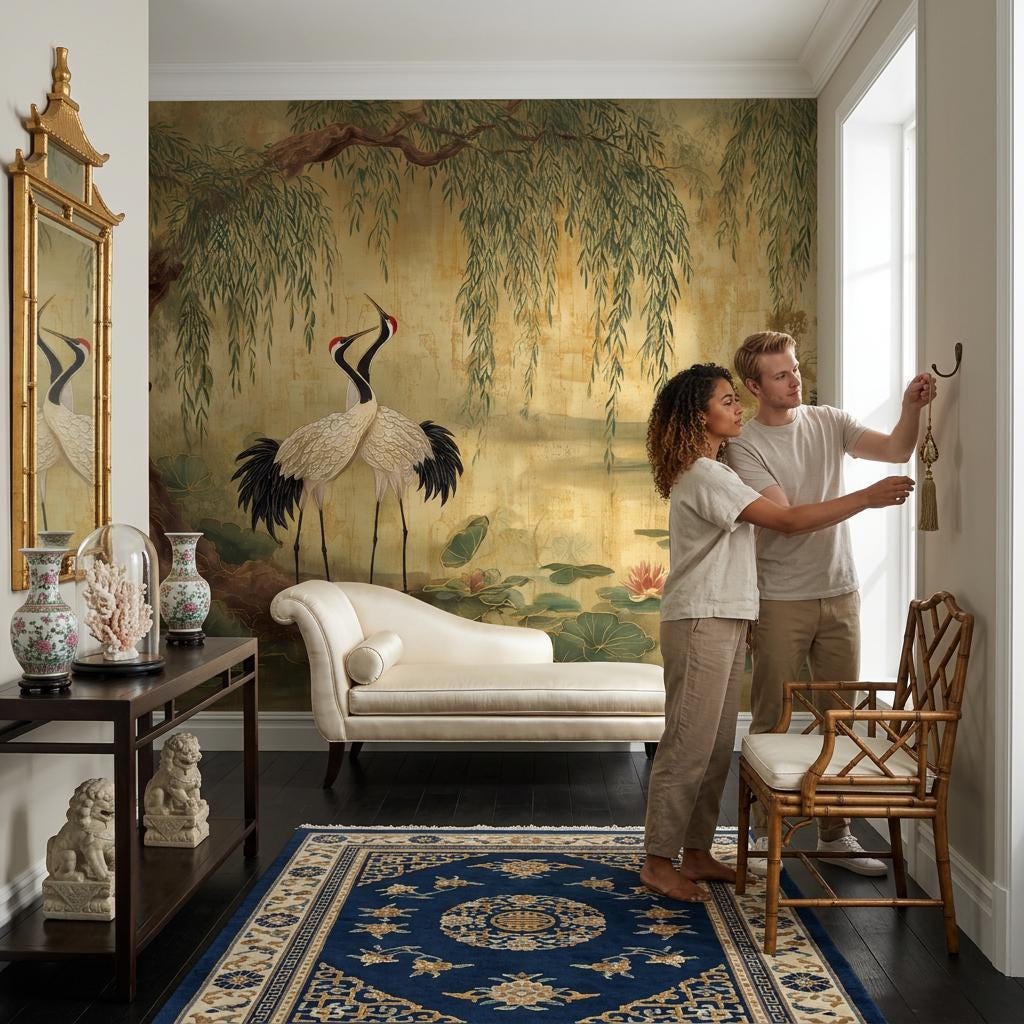 Lotus Pond Wallpaper Cranes Willow Tree Wall Mural