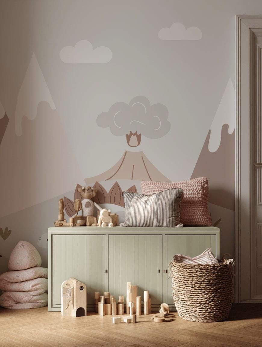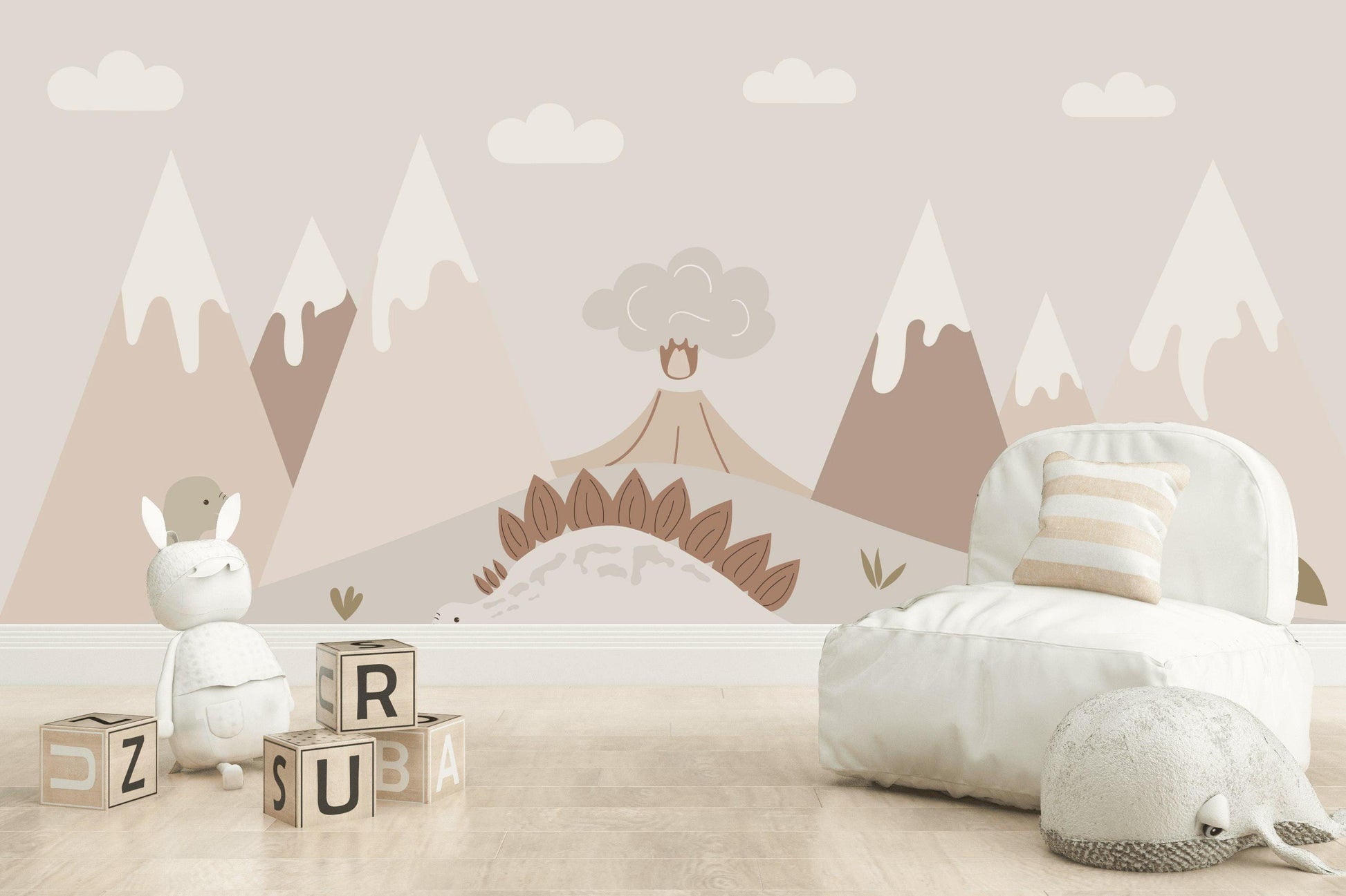 Create a serene and adventurous space with our Minimalist Dinosaur Nursery Wallpaper. This adorable peel and stick wall mural features a hand-drawn illustration of friendly dinosaurs, snow-capped mountains, and a cute volcano in a soft, gender-neutral palette of dusty rose, beige, and creamy white. Perfect for a modern baby room, toddler bedroom, or playroom.