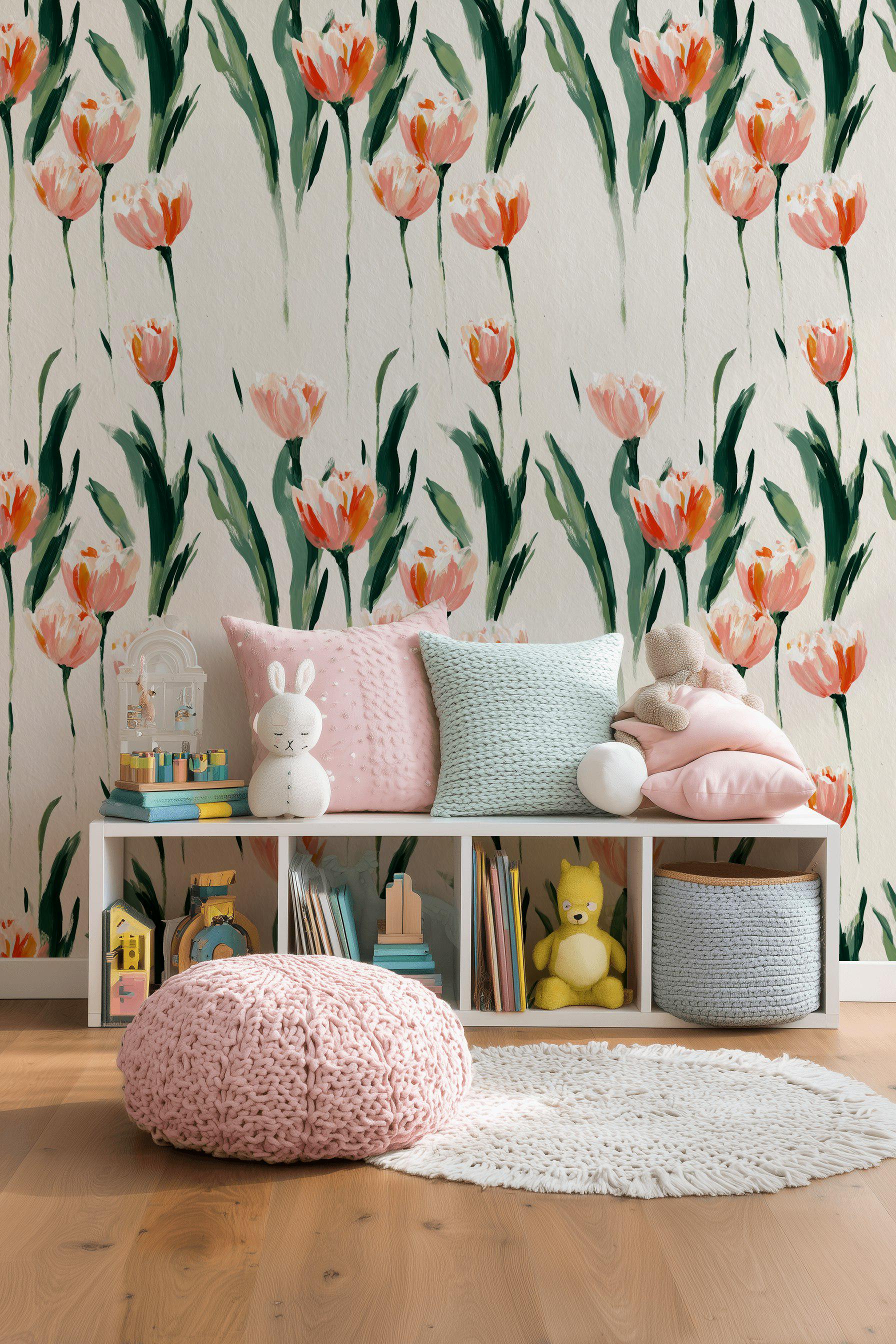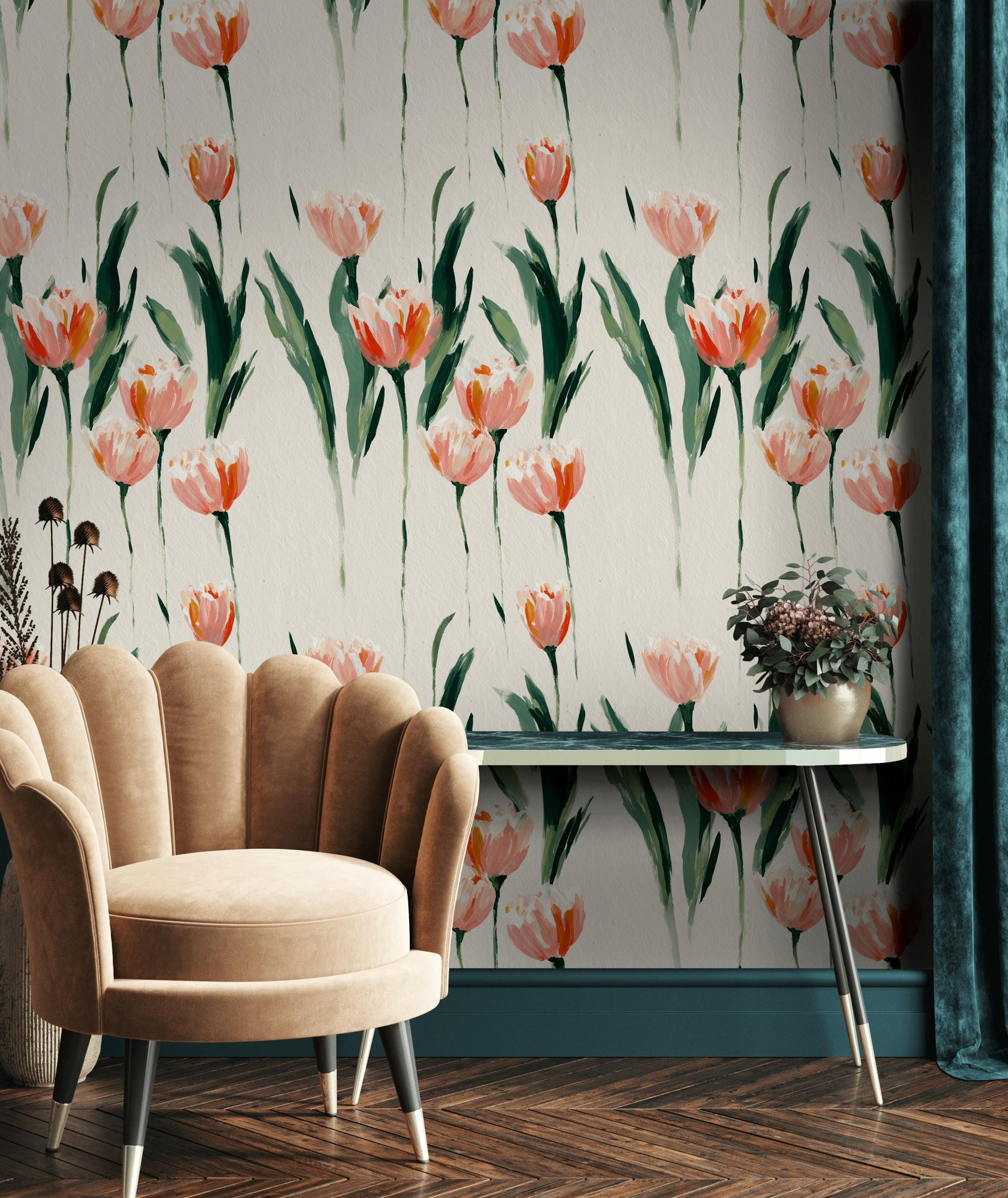 Minimalist Tulip Wallpaper, Modern Pink Floral Wall Mural, Botanical Peel and Stick Decor