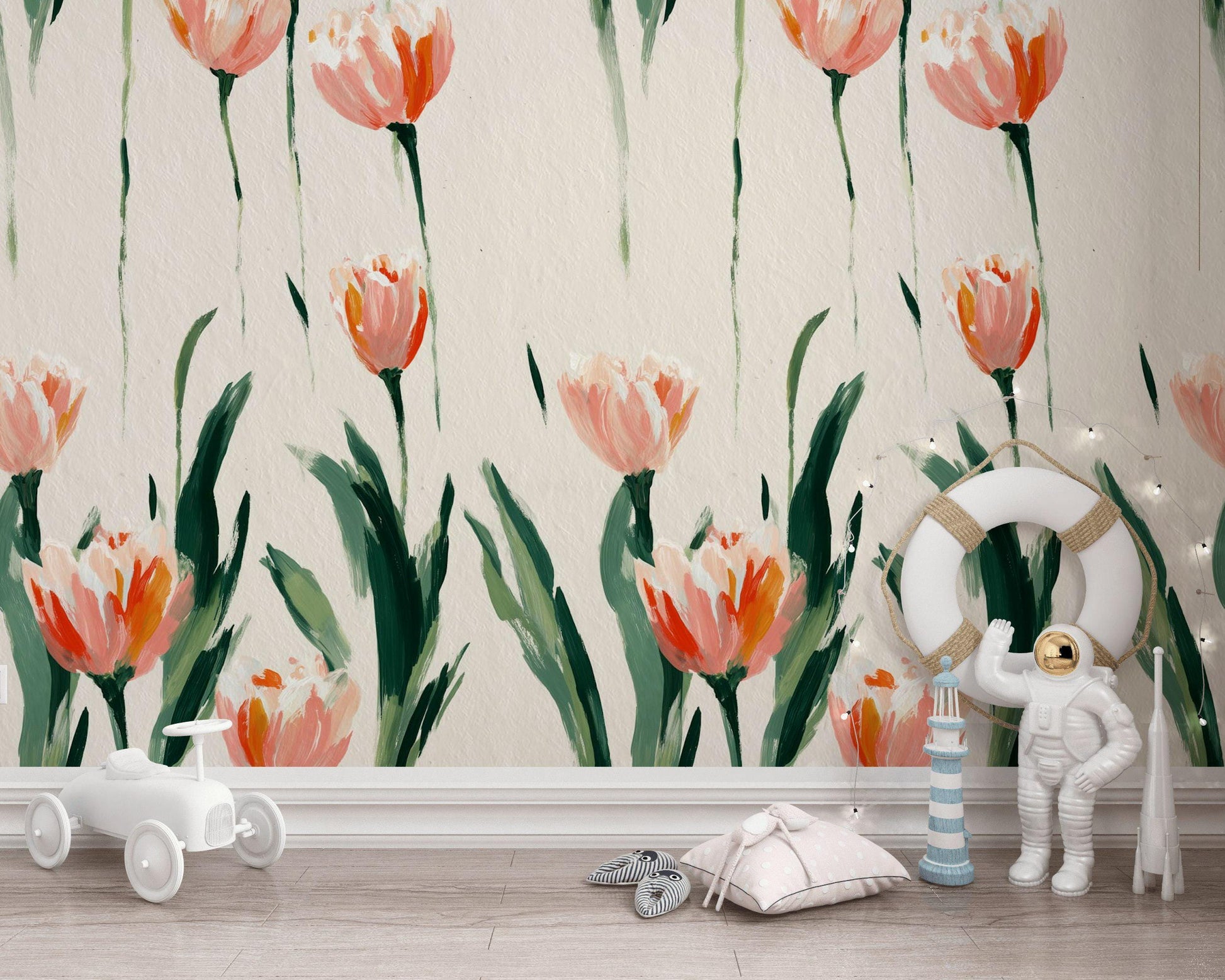Minimalist Tulip Wallpaper, Modern Pink Floral Wall Mural, Botanical Peel and Stick Decor