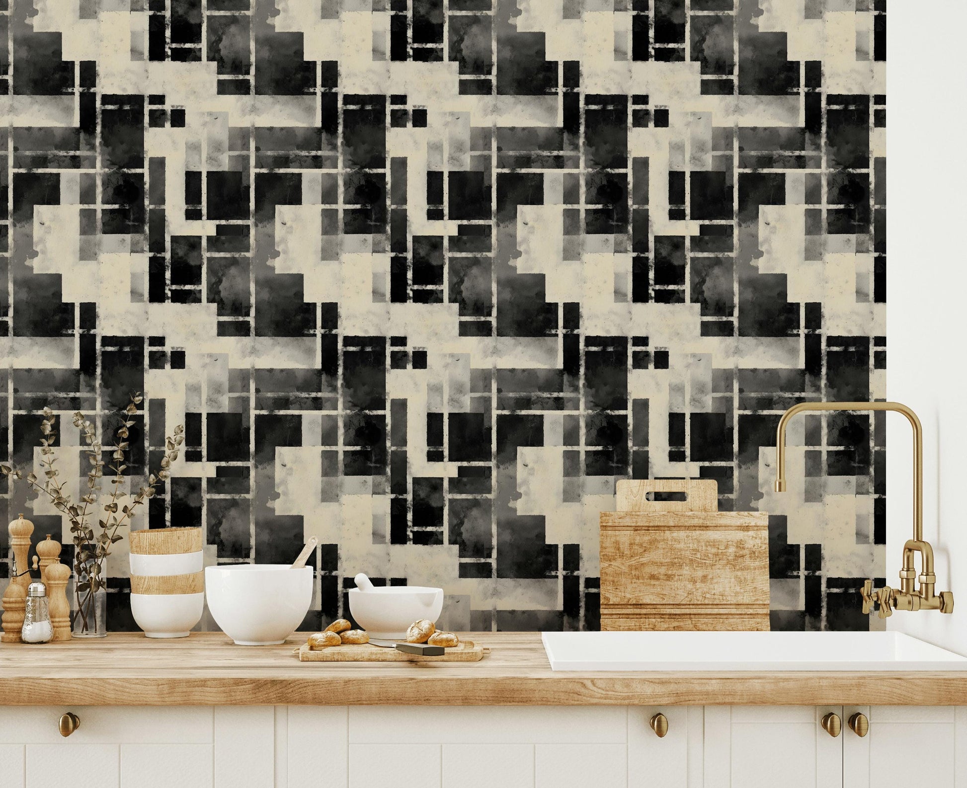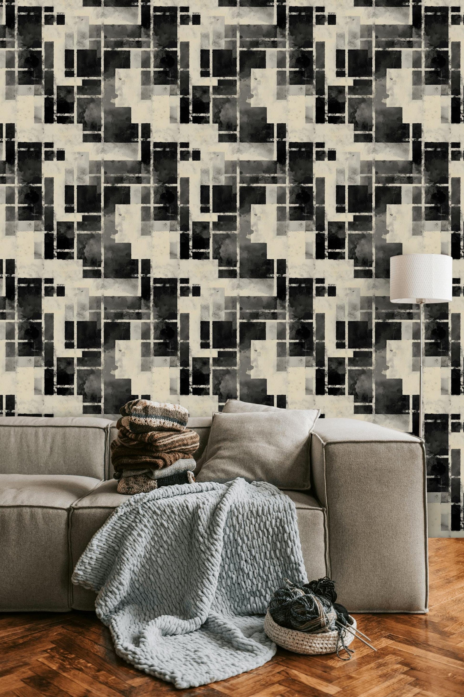 Monochrome Bauhaus Wallpaper: Abstract Watercolor Grid, Peel & Stick Mural