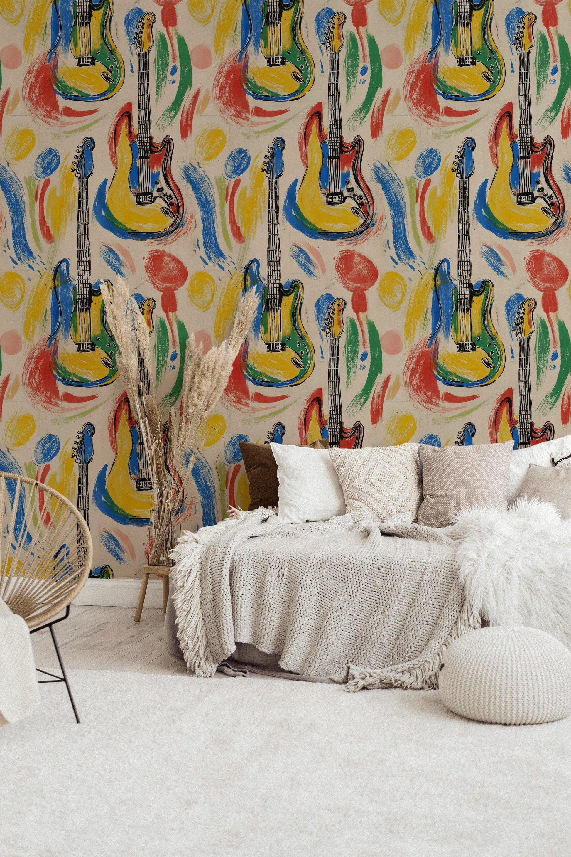 This isn't just a wallpaper; it's a nostalgic, vibrant canvas that captures the spirit of rock and roll. Ideal for bedrooms, game rooms, music studios, or any space that needs a huge dose of fun and personality. It's the ultimate Musician Gift Idea for a guitarist or a fan of bold, colorful art.