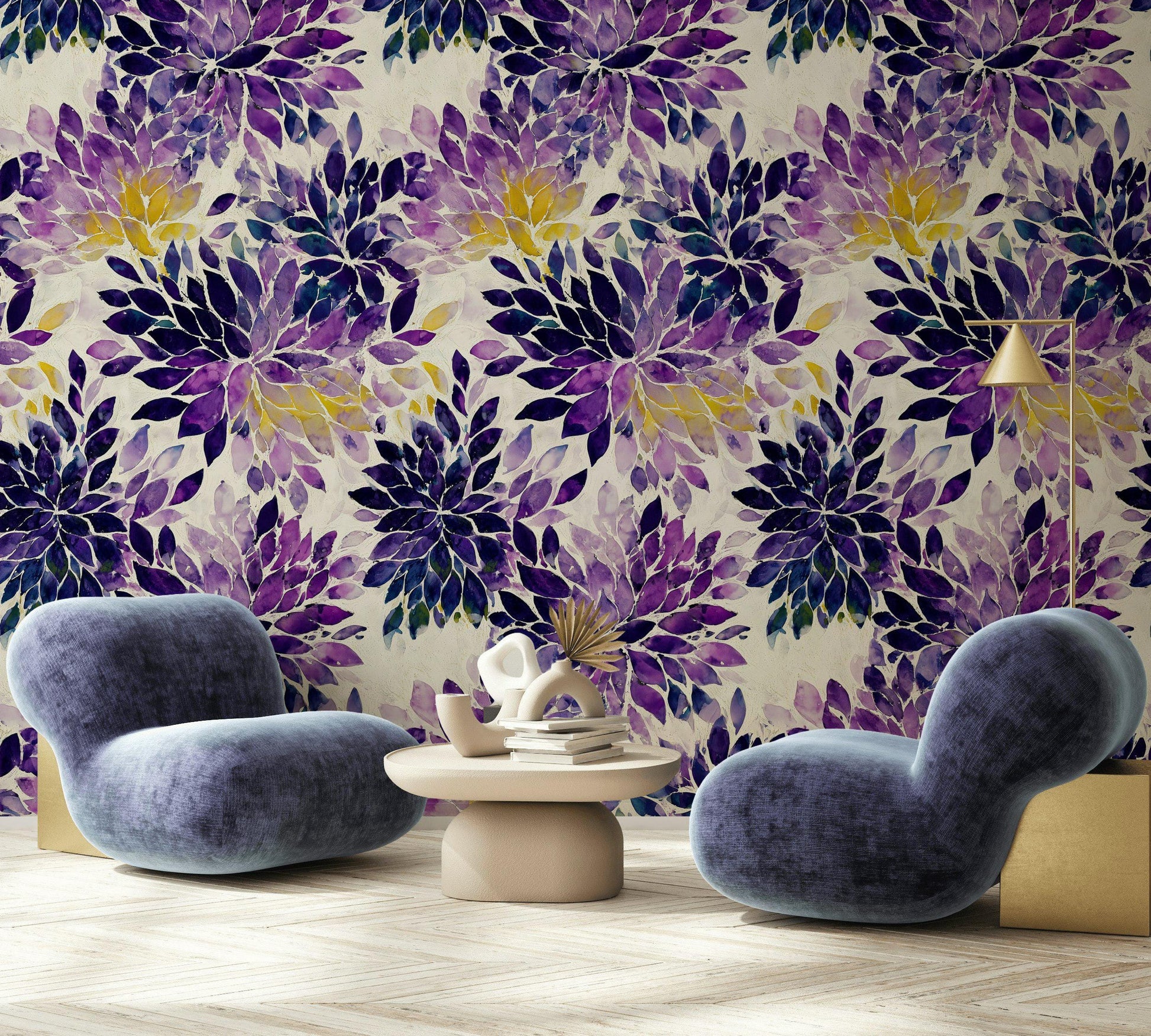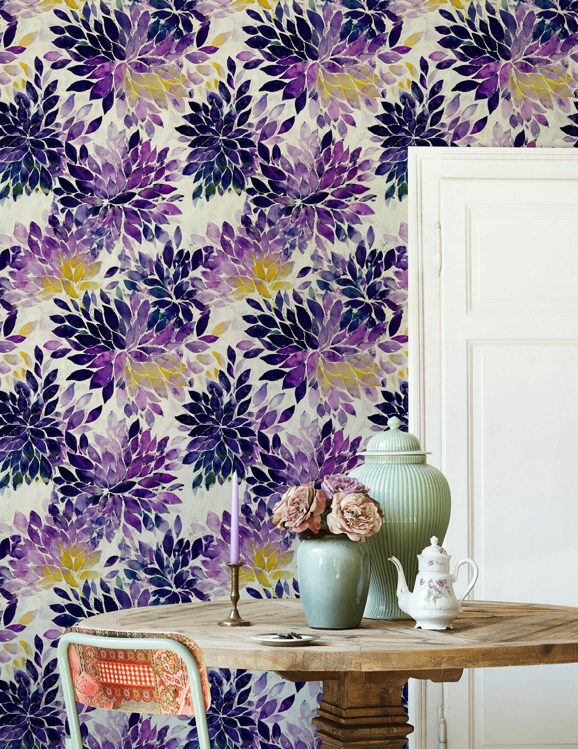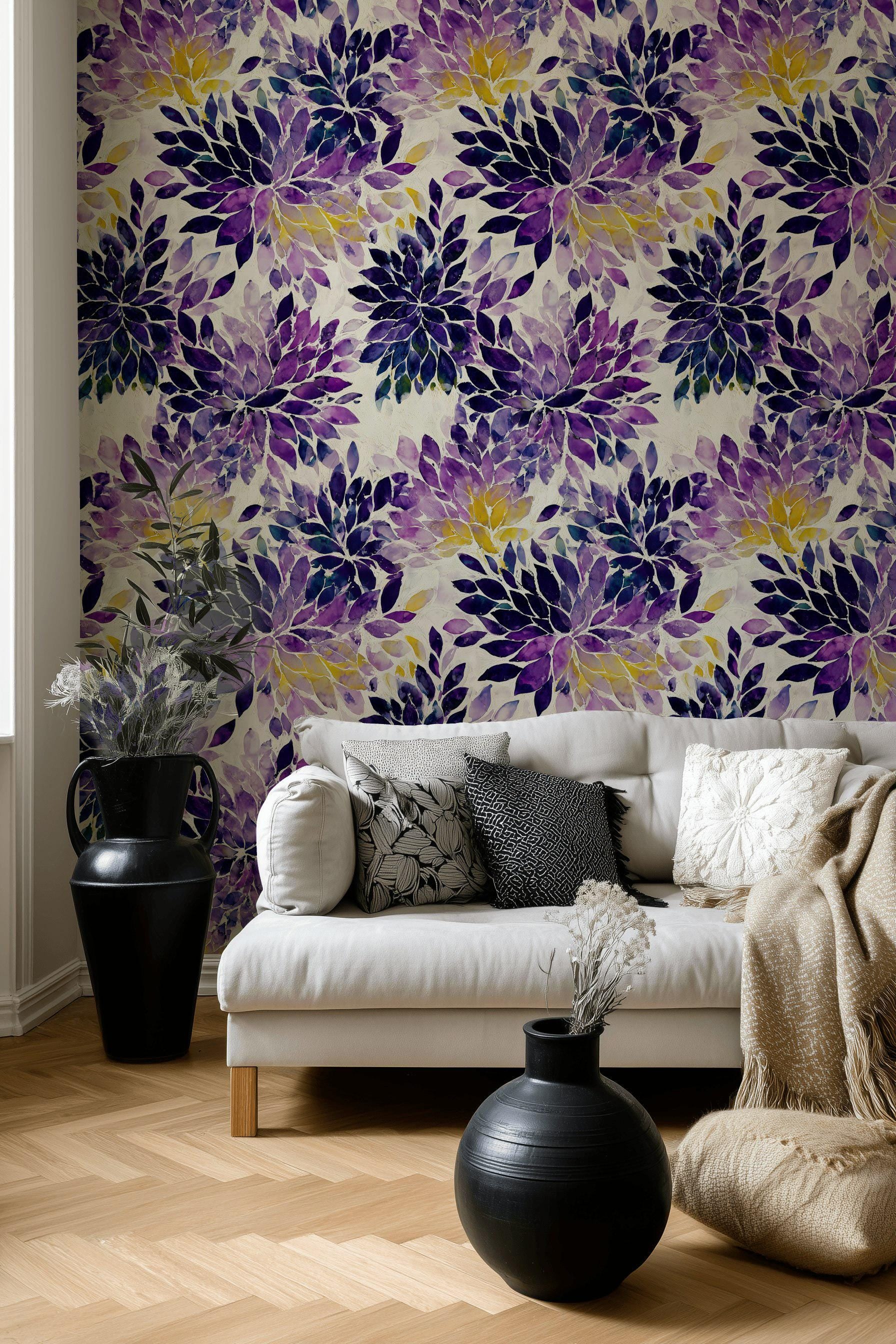 Purple Floral Watercolor Wallpaper: Abstract Peel and Stick Wall Mural