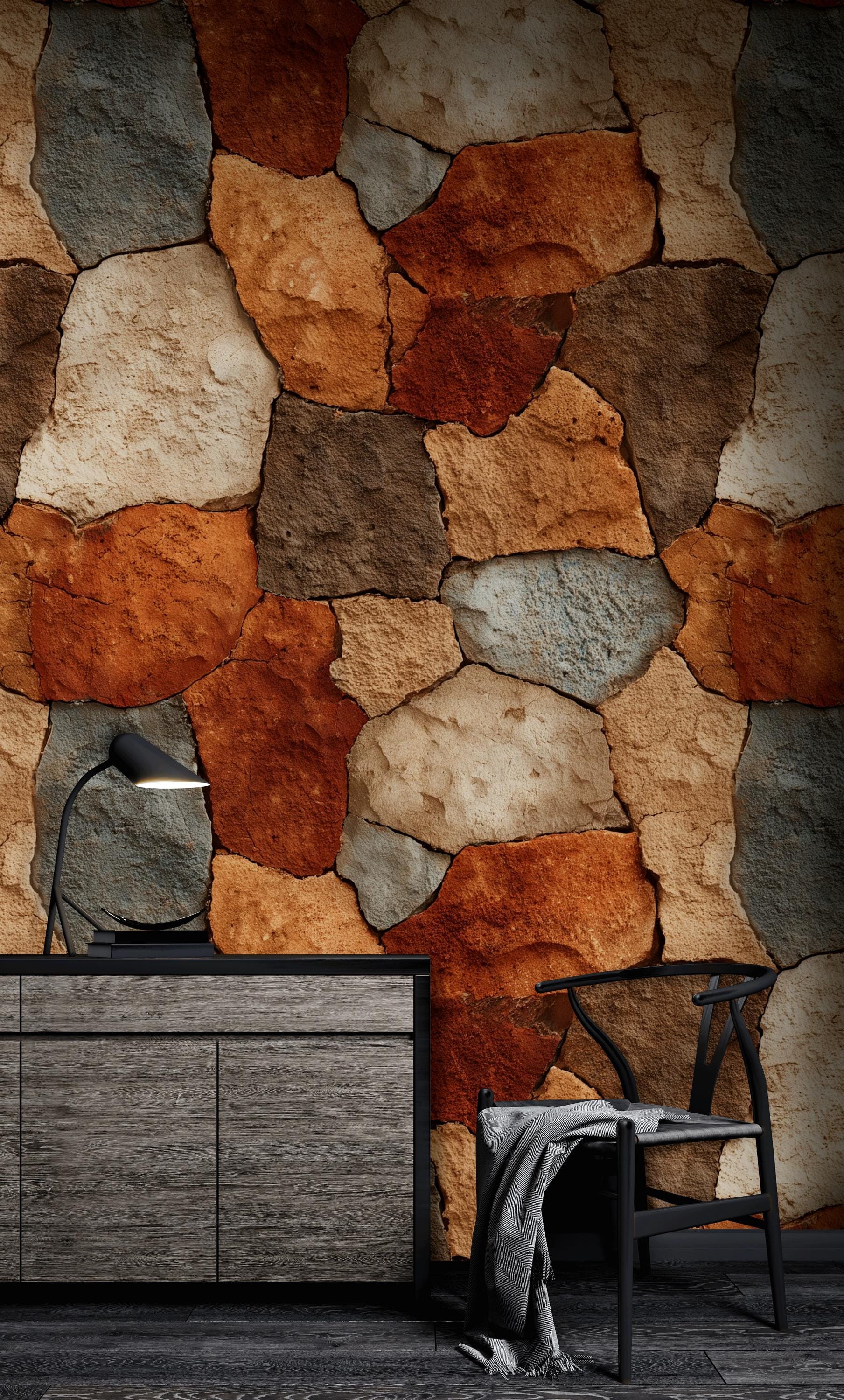 Transform your space with the timeless appeal of our authentic-looking Rustic Stone Wall Wallpaper. This captivating wall mural features a realistic pattern of naturally varied stones in warm, earthy tones of terracotta, rust, beige, and cool grey. The intricate details and textured appearance perfectly mimic the look of a hand-built stacked rock wall, adding rugged charm and inviting warmth to any room.