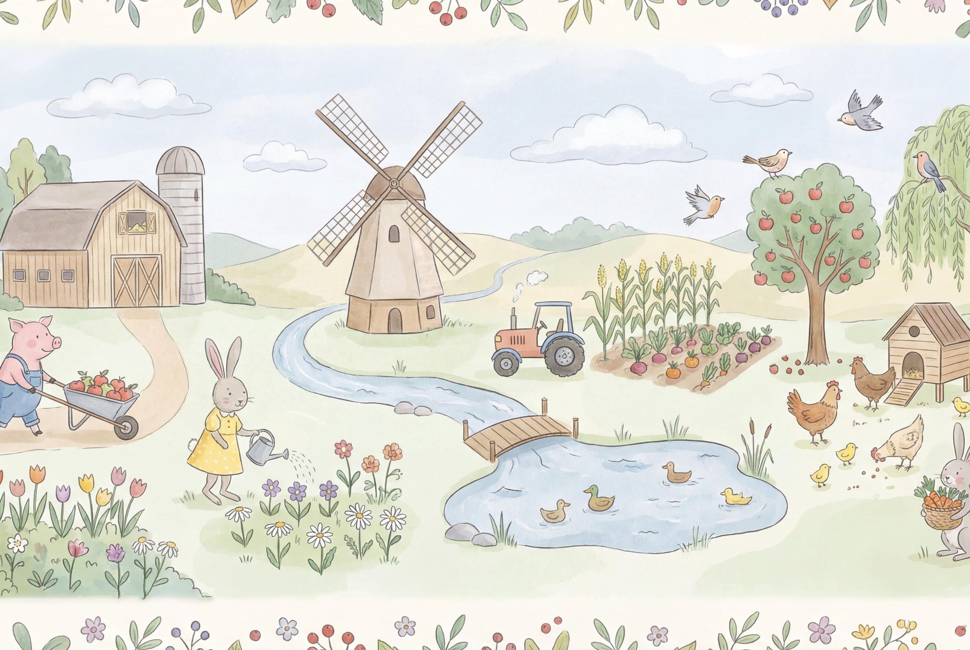 Soft countryside illustration with barn, windmill, animals and gentle nature details. This mural creates a calm story-like environment, perfect for nursery or kids rooms. Light tones and playful elements add warmth while keeping the space peaceful and inviting.