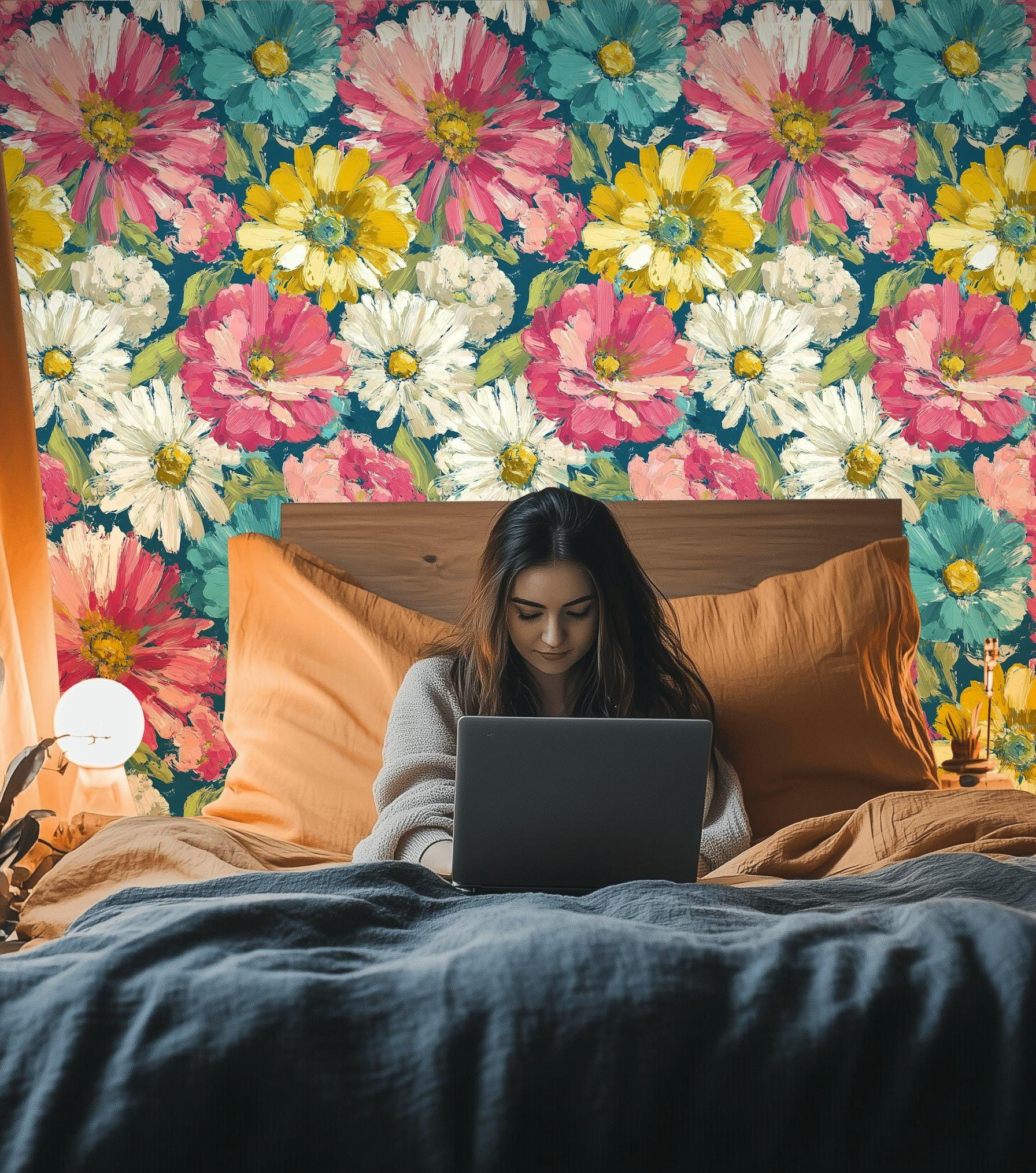 Teal & Pink Floral Wallpaper Mural: Impasto Texture, Peel and Stick