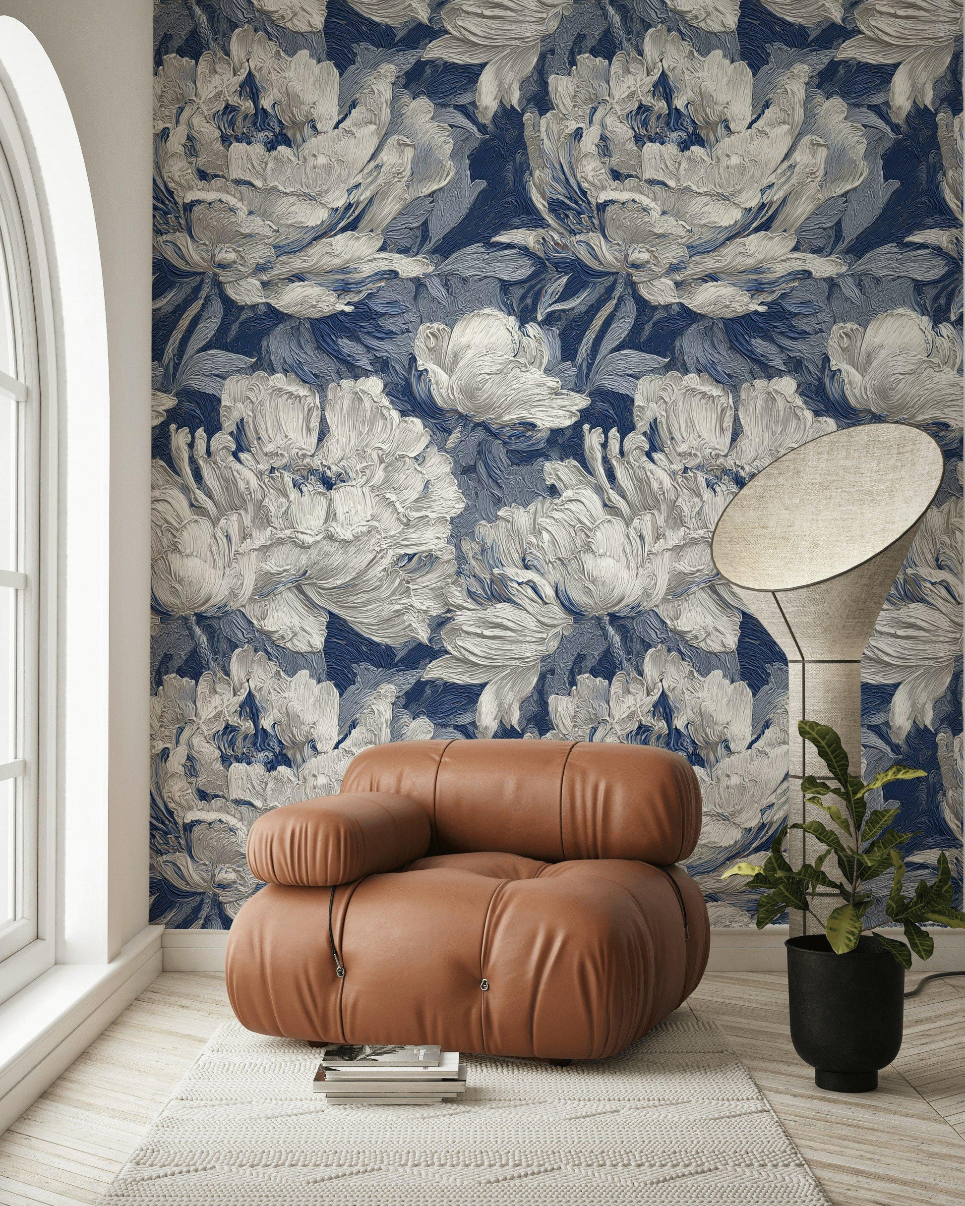 Immerse your space in artistic elegance with our captivating Textured Blue Floral Wallpaper. This stunning wall mural features an oversized pattern of lush, full-bodied flowers, rendered with a dramatic, impasto-like texture in rich blues and crisp whites. The painterly brushstrokes create a dynamic and luxurious feel, adding depth and sophistication to any room.