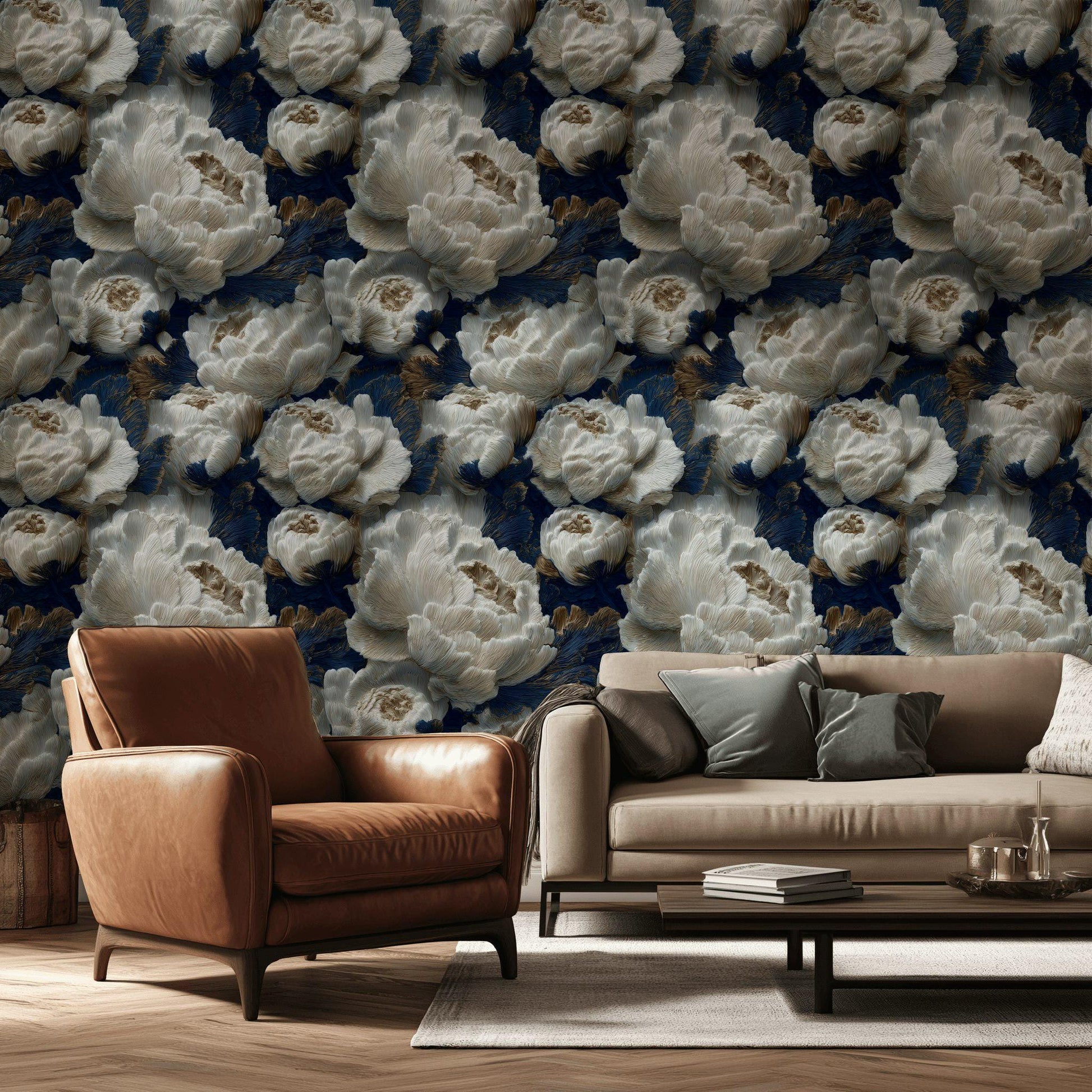 Textured Peony Flower Wallpaper: Navy Blue & Gold Glam Mural