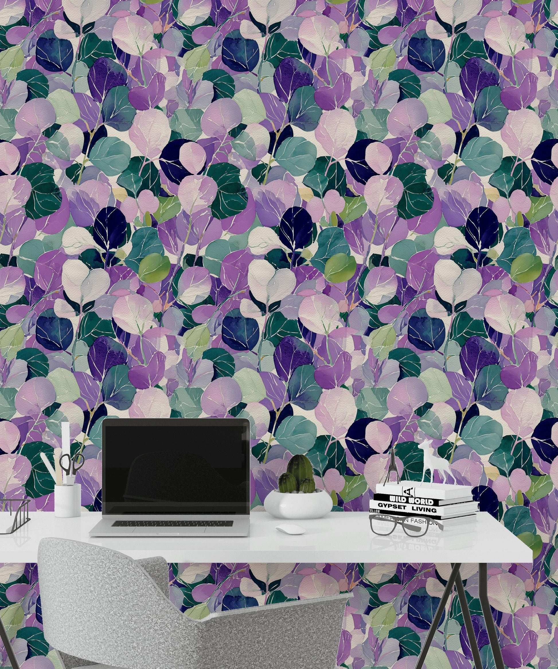 Add a fresh and serene touch to your home with this modern RADU63 wallpaper design. Featuring watercolor-style leaves in a harmonious blend of various shades of purple, green, and teal, this pattern creates a calm and inviting atmosphere.