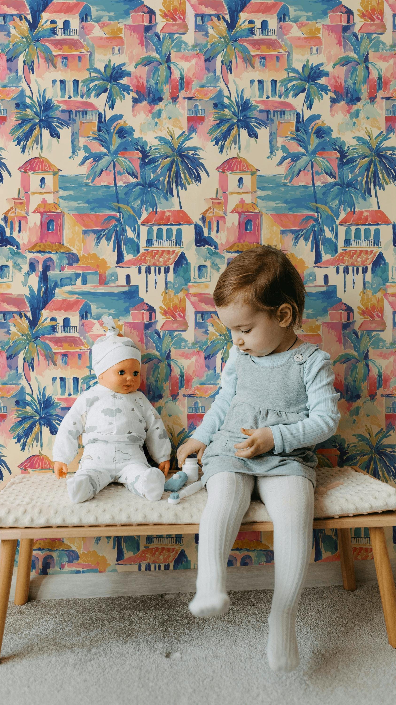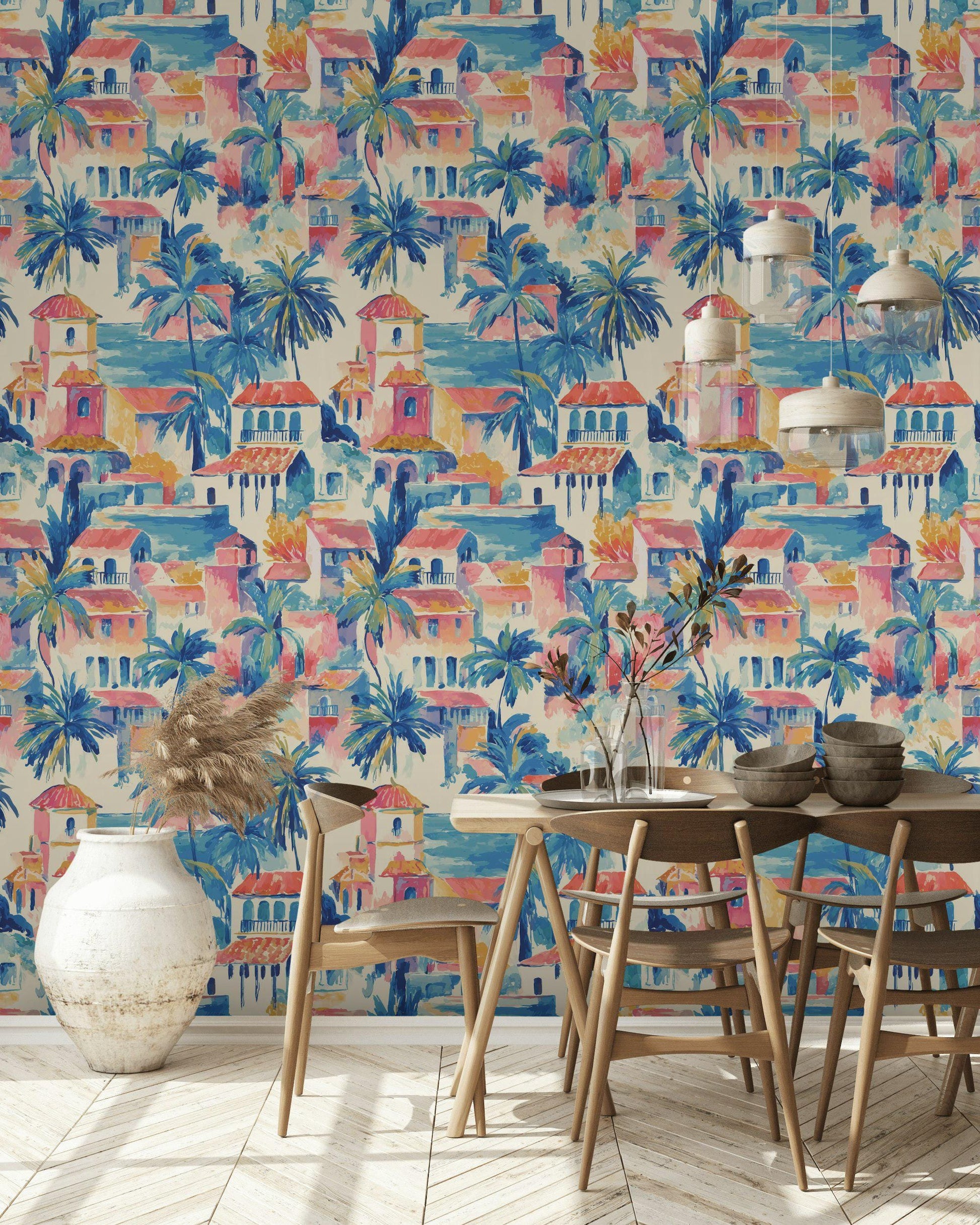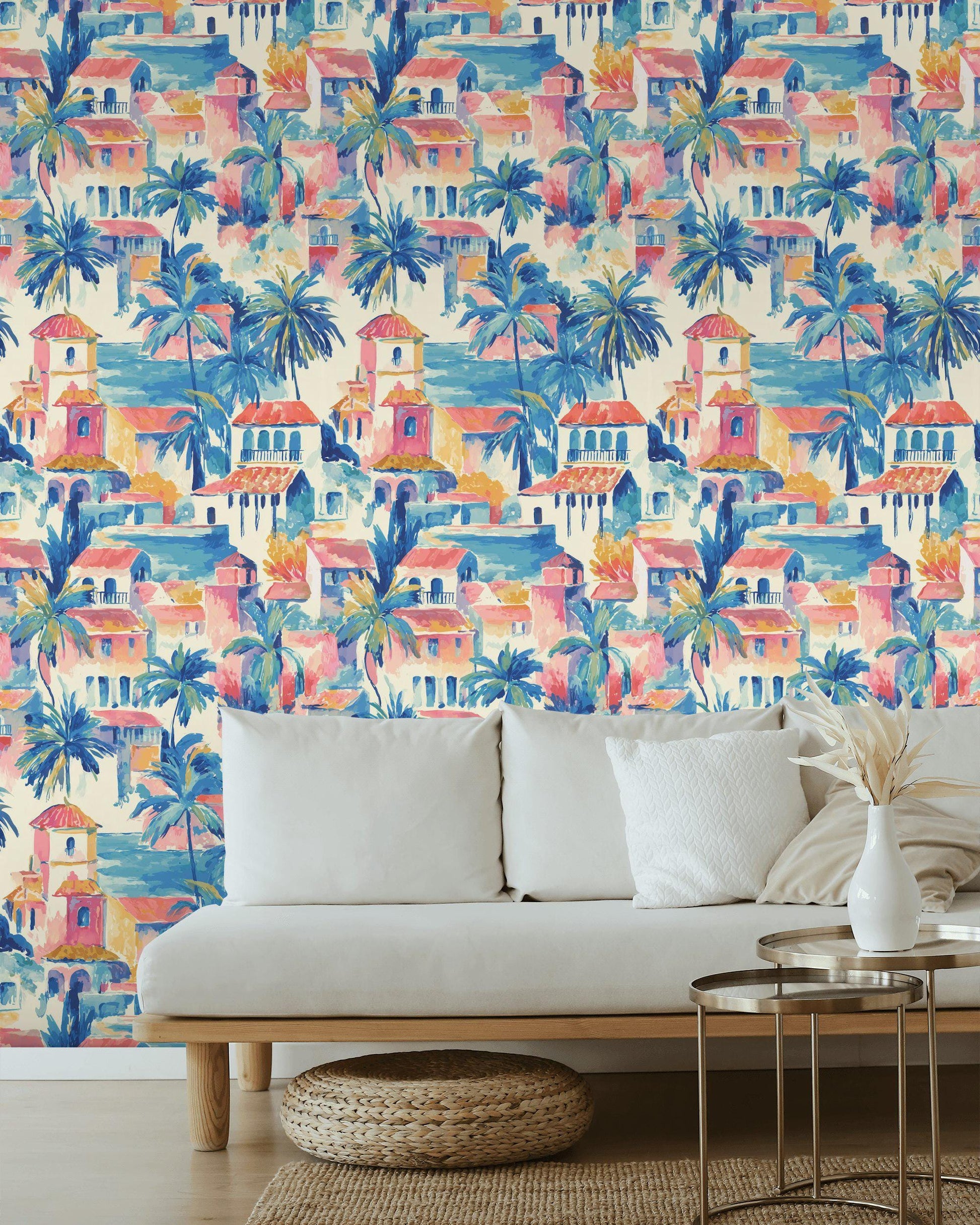 Transform your home into a serene coastal retreat with our enchanting Watercolor Mediterranean Village Peel and Stick Wallpaper. This captivating wall mural brings the vibrant charm of a sun-drenched seaside town directly to your walls, featuring picturesque homes, lush palm trees, and sparkling blue waters, all rendered in a soft, artistic watercolor style.